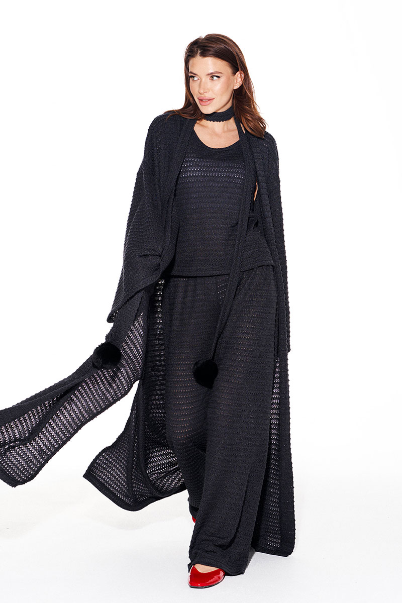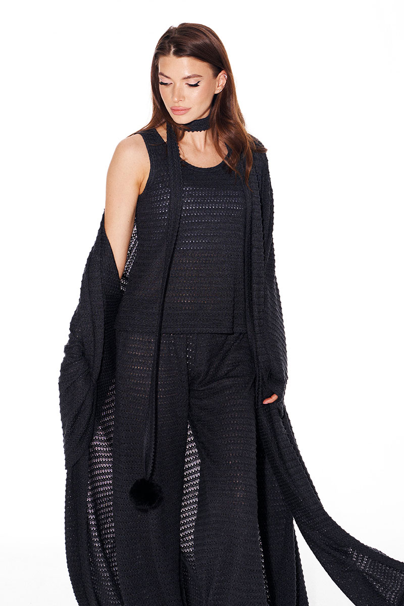 Костюм женский 3-предметный из трикотажного полотна, состоящий из топа, брюк и кардигана.