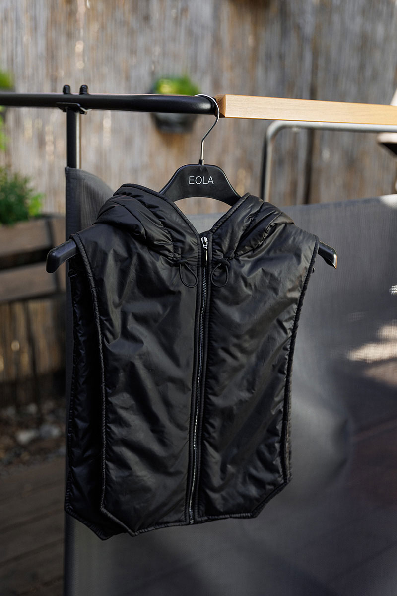 Капор выполнен из плащевой ткани с утеплителем Isosoft. Застежка на металлическую молнию. Низ переда и спинки фигурной формы. Спереди затягивается эластичной тесьмой с фиксаторами.