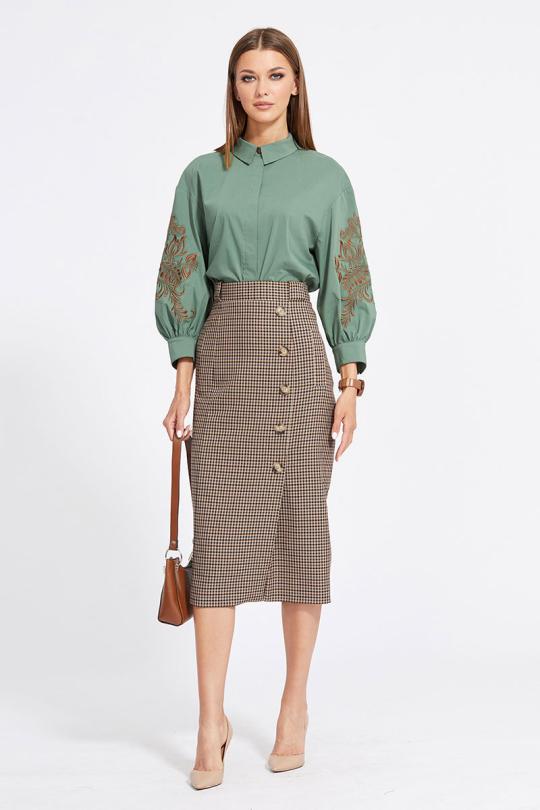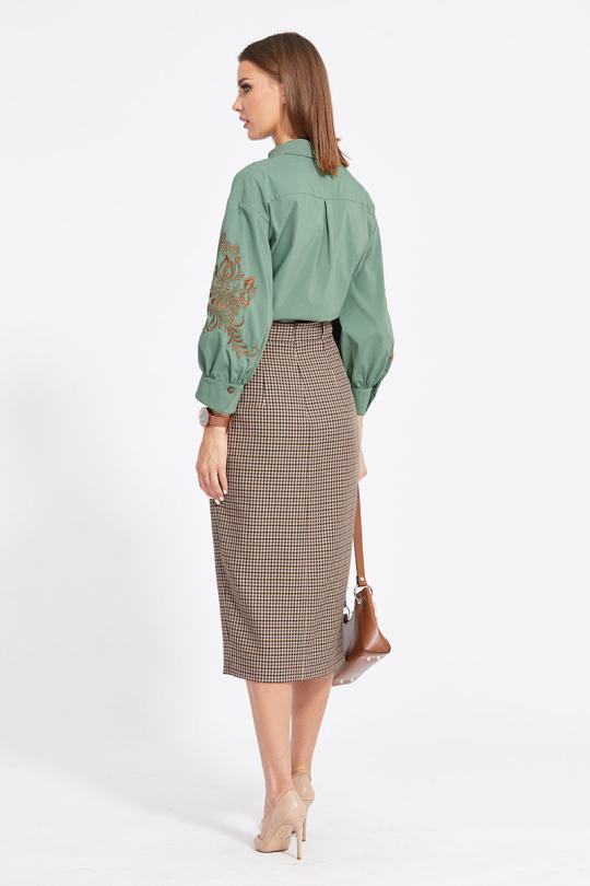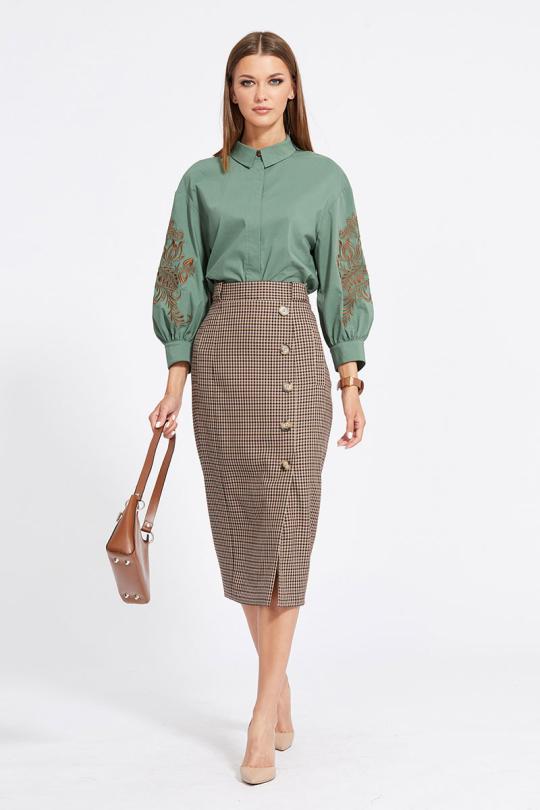 Юбка выполнена из костюмно-плательной ткани с рисунком "гусиная лапка". Юбка на притачном поясе, длиной миди, зауженная к низу. Застёжка сзади в среднем шве. Спереди имитация вертикальных декоративных карманов с листочкой, в рельефе спереди шлица с имитацией застёжки в запах.