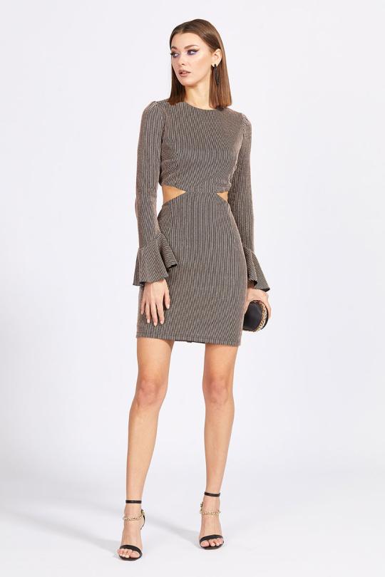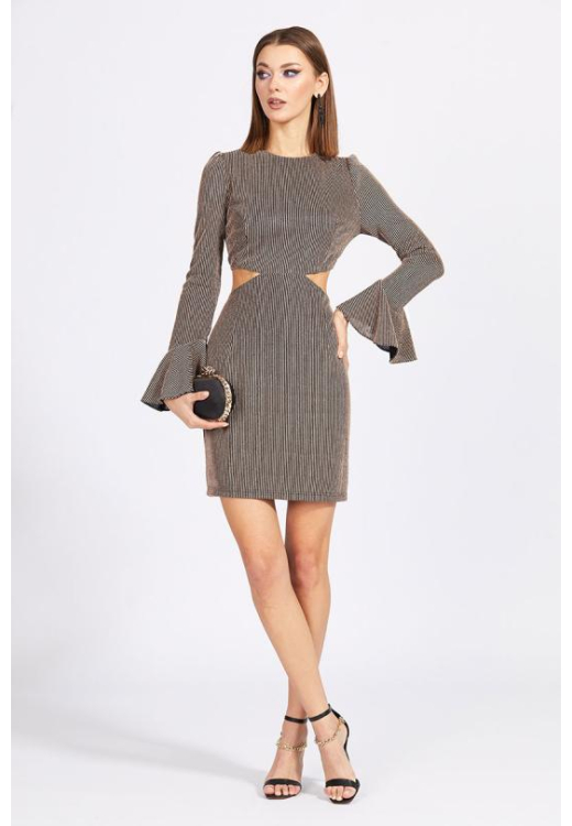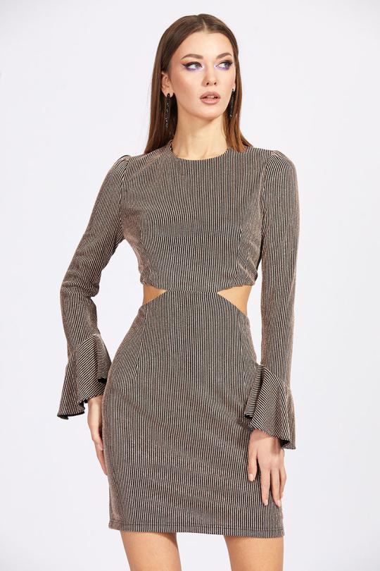 Платье выполнено из трикотажного полотна в рубчик. Платье приталенного силуэта, отрезное по линии талии, длиной выше линии колена. Застежка в среднем шве спинки и юбки на потайную молнию. Горловина округлой формы. Линия талии фигурной формы. Рукав втачной, одношовный, со сборкой по окату и оборкой по низу. Юбка заужена к низу. Платье на трикотажной подкладке.