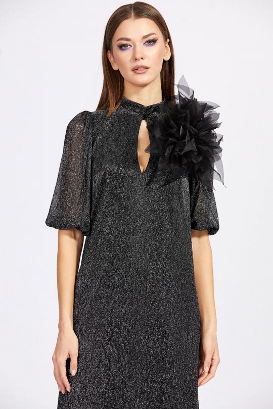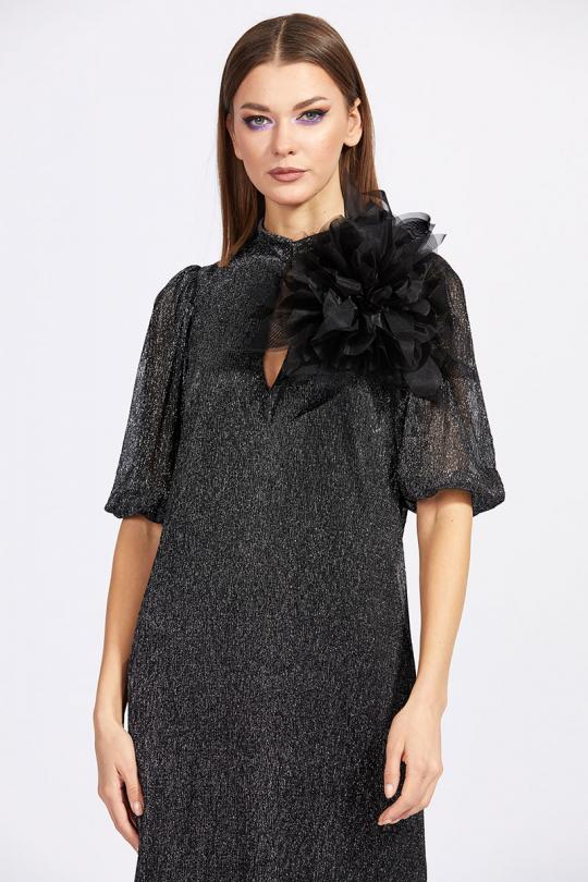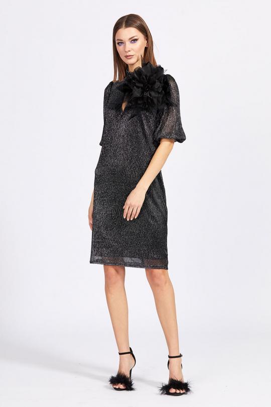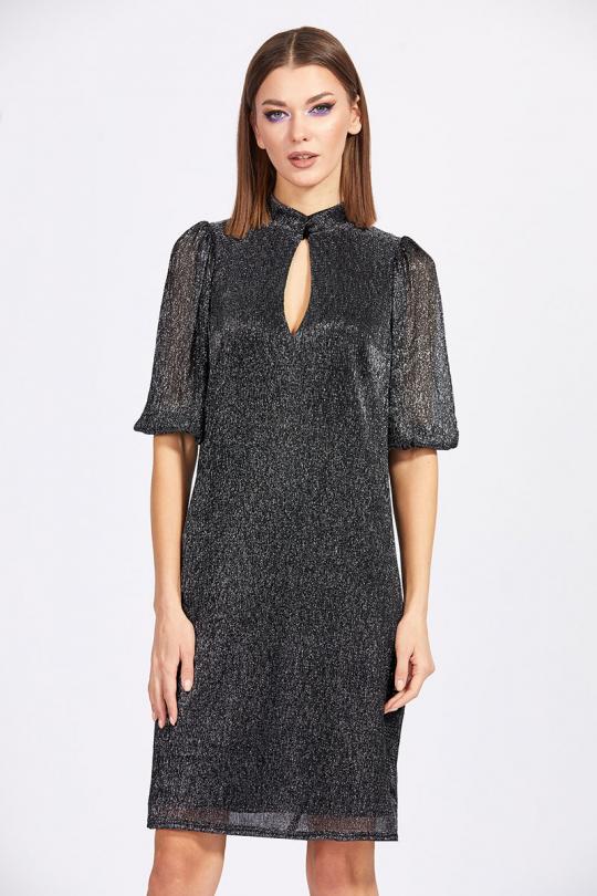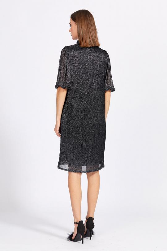 Платье выполнено из прозрачного трикотажного полотна с металлизированной нитью. Платье прямого силуэта, длиной выше линии колена. Перед и спинка цельные. Воротник-стойка, застегивающийся спереди на петлю и пуговицу Плечевой шов заужен. Рукав втачной, одношовный, длиной до линии локтя, со сборкой по окату. Платье на трикотажной подкладке.