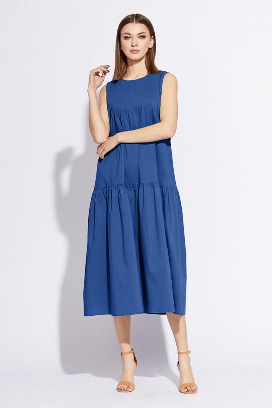 Платье выполнено из однотонной плательной ткани. Платье А-образного силуэта, длиной миди. Застежка на спинке на навесную петлю и пуговицу. Перед декорирован защипами. Плечевой шов укорочен. Низ платья декорирован широким воланом.