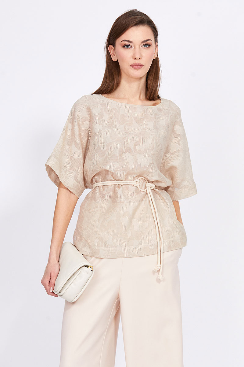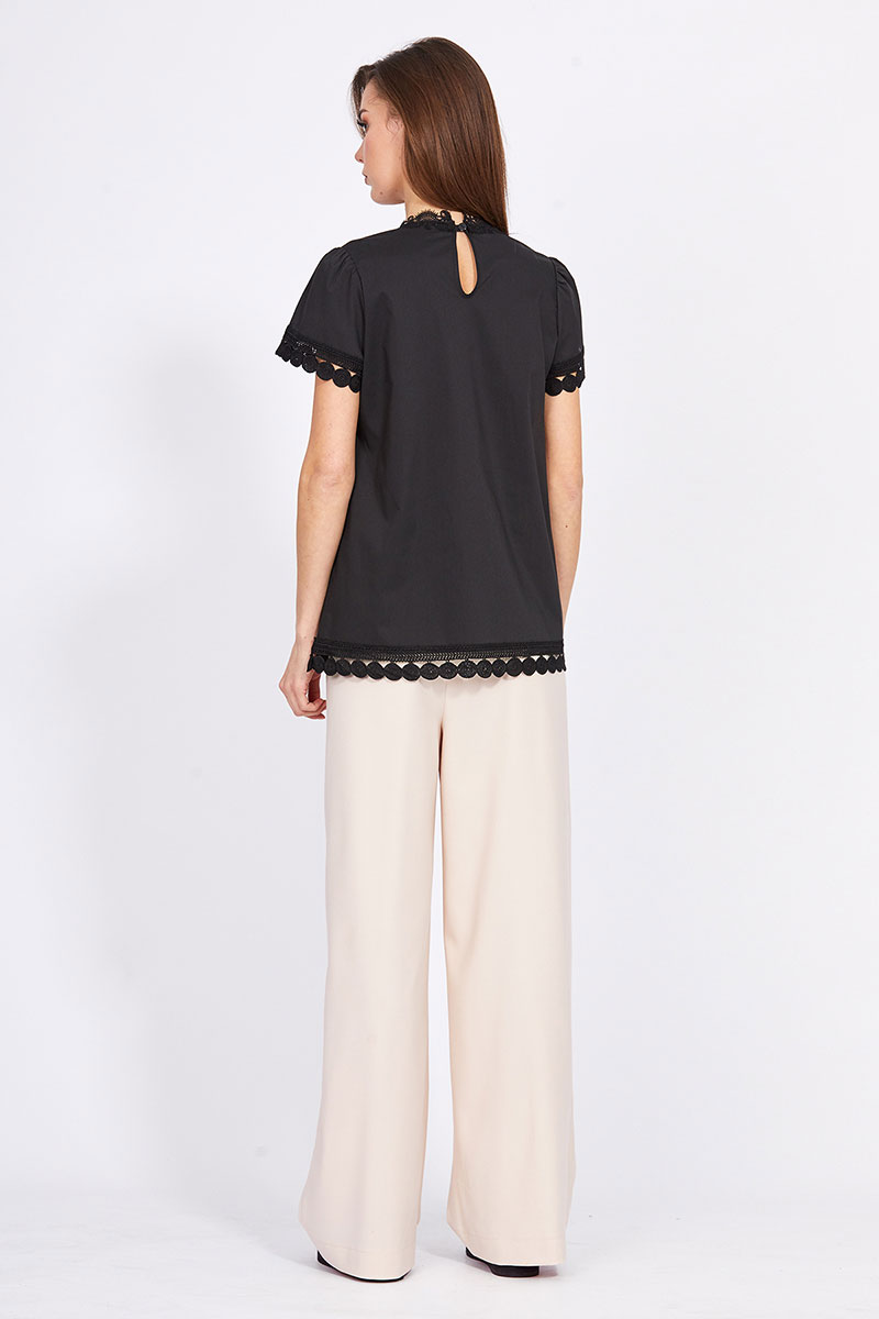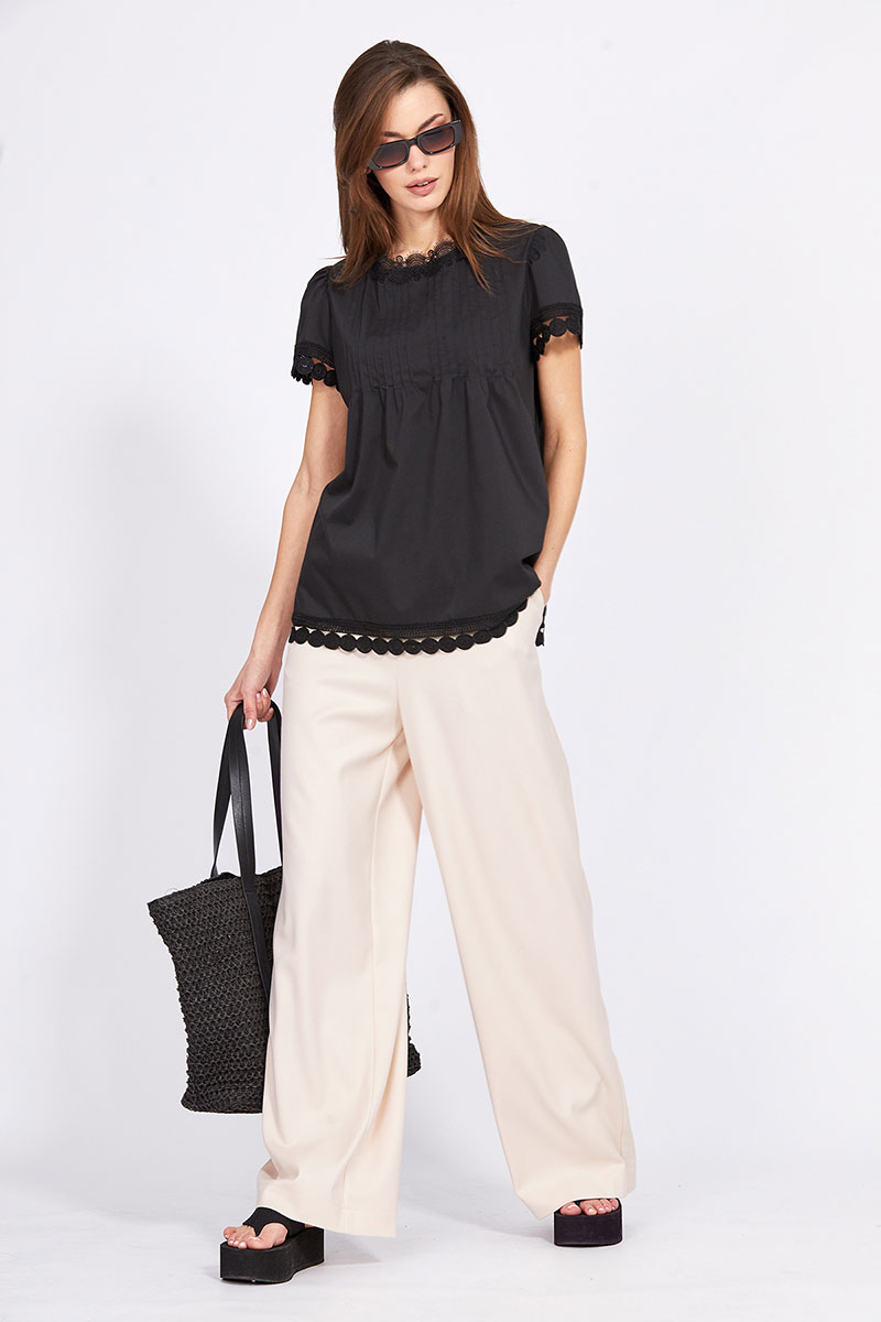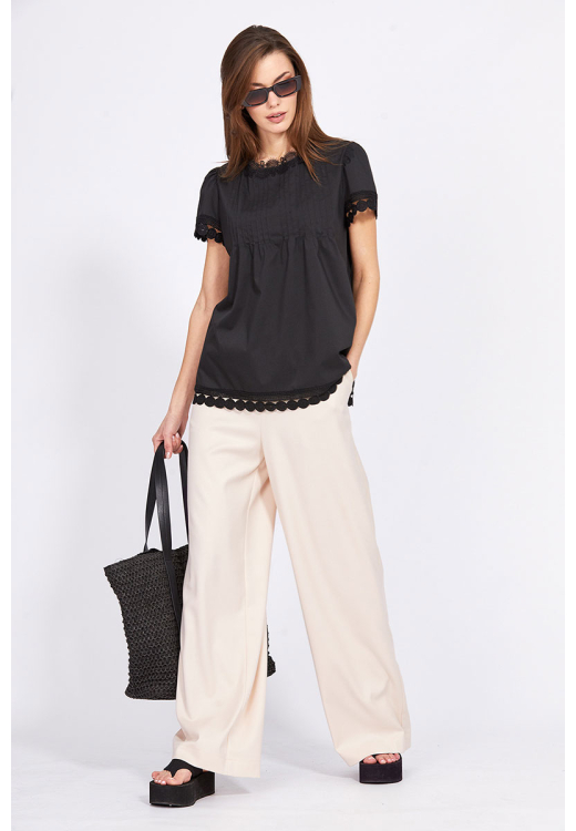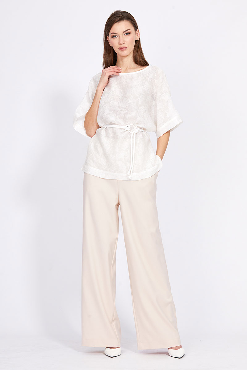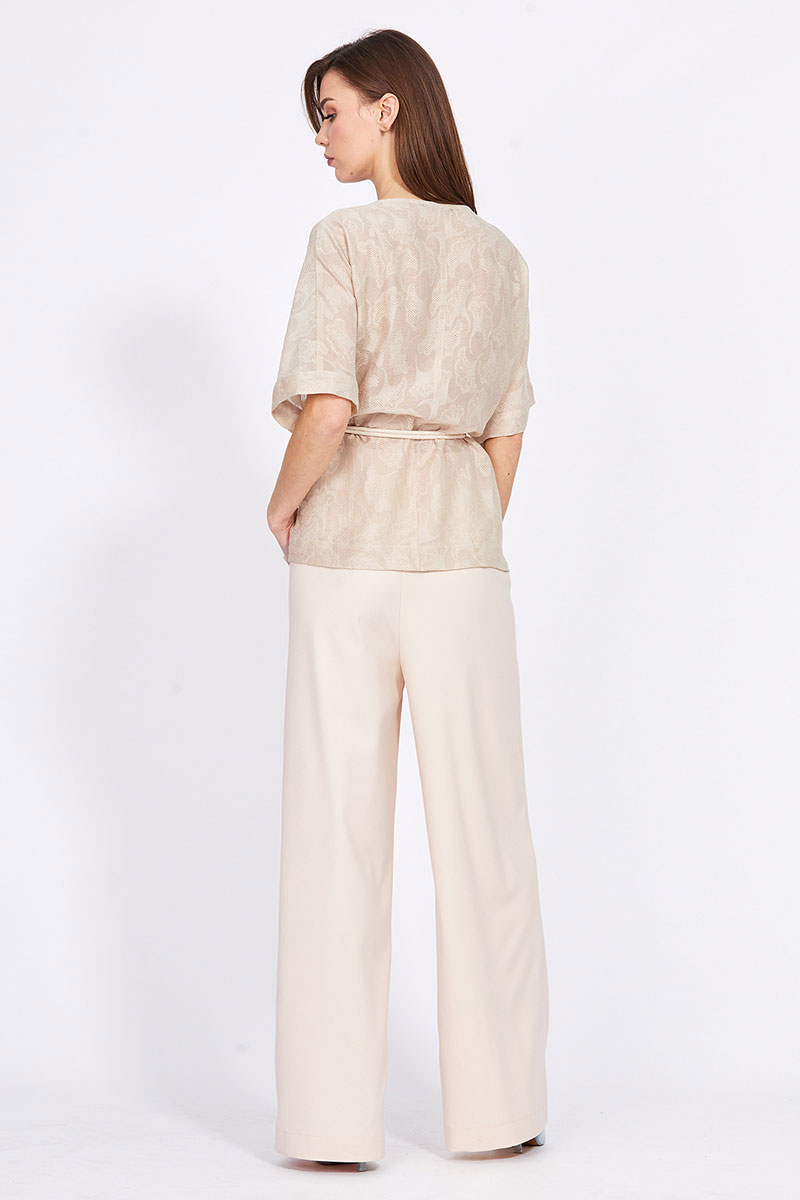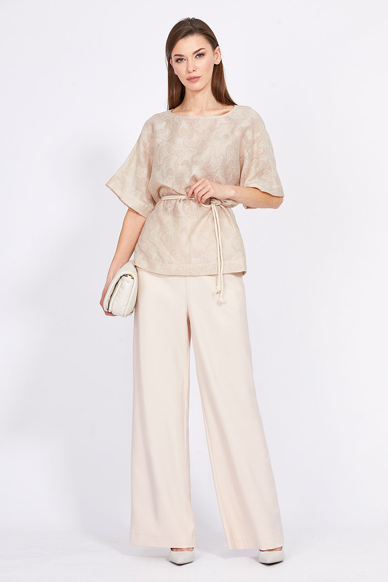 Брюки выполнены из плательно-костюмной ткани. Брюки прямого силуэта, на притачном поясе с эластичной тесьмой, длиной в пол. Спереди боковые карманы с наклонным входом.