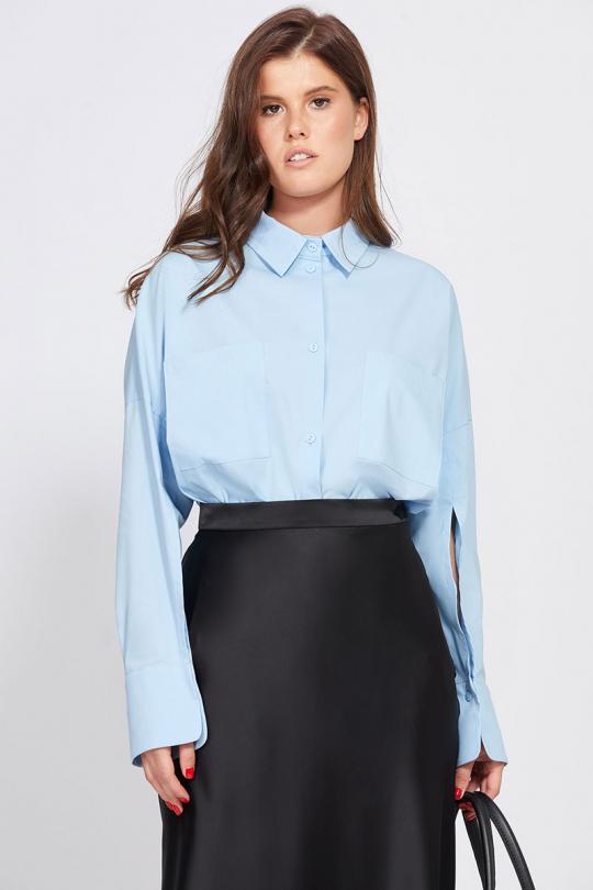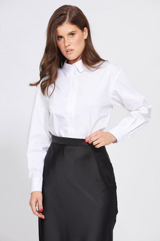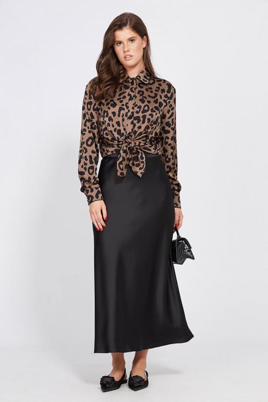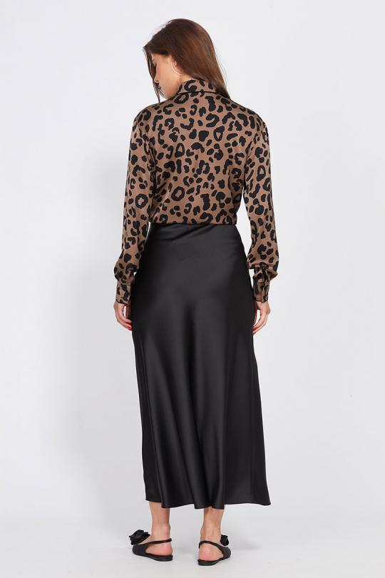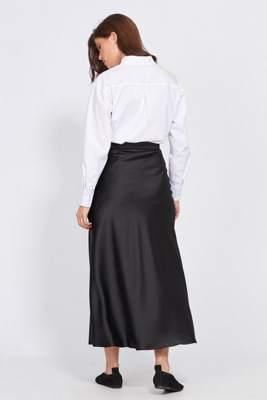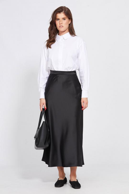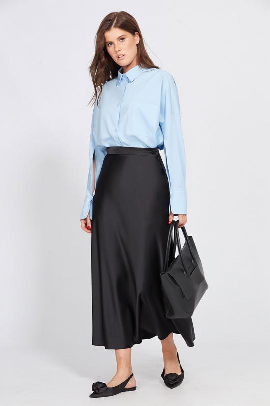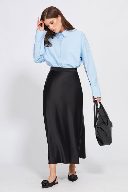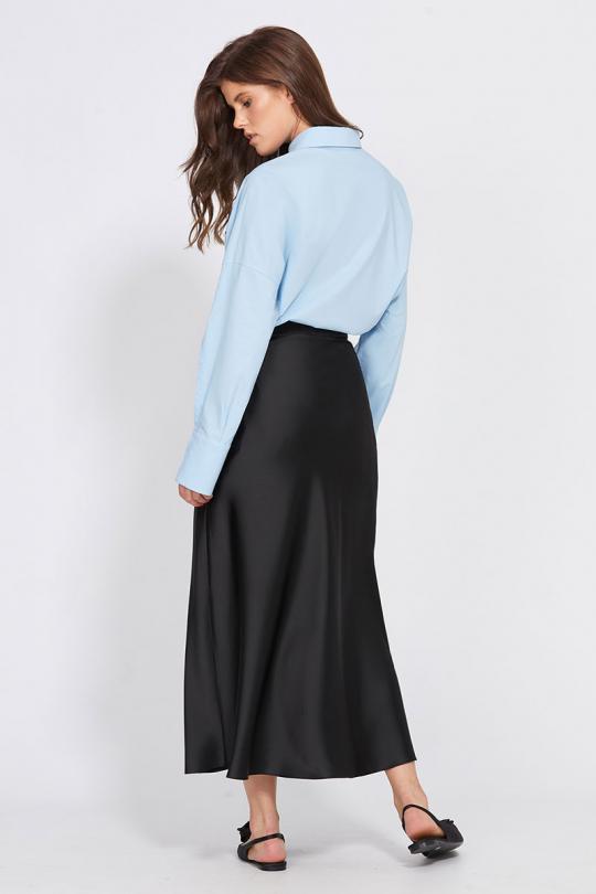 Юбка выполнена из плотного атласа. Юбка расширенная к низу, на притачном поясе, длиной миди.Переднее и заднее полотнища цельные и выкроены по косой. Застежка в левом боковом шве на потайную молнию и пуговицу. Юбка без подкладки.