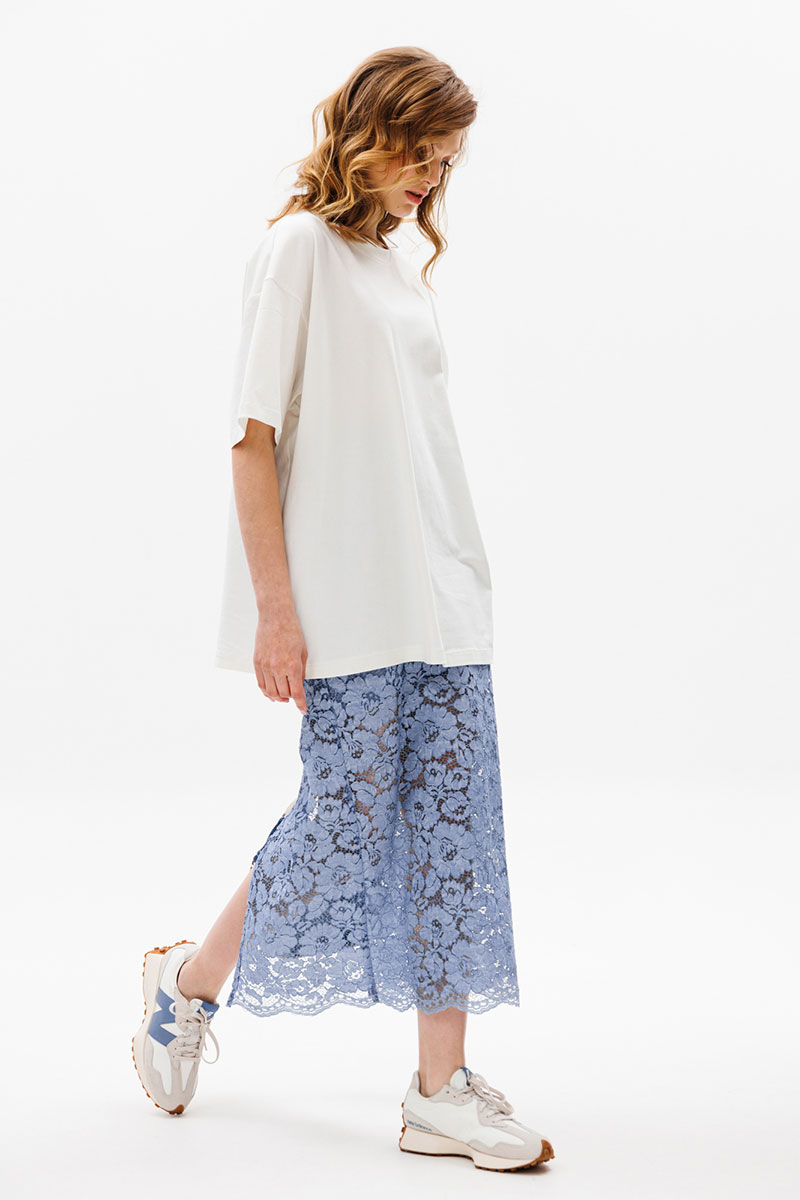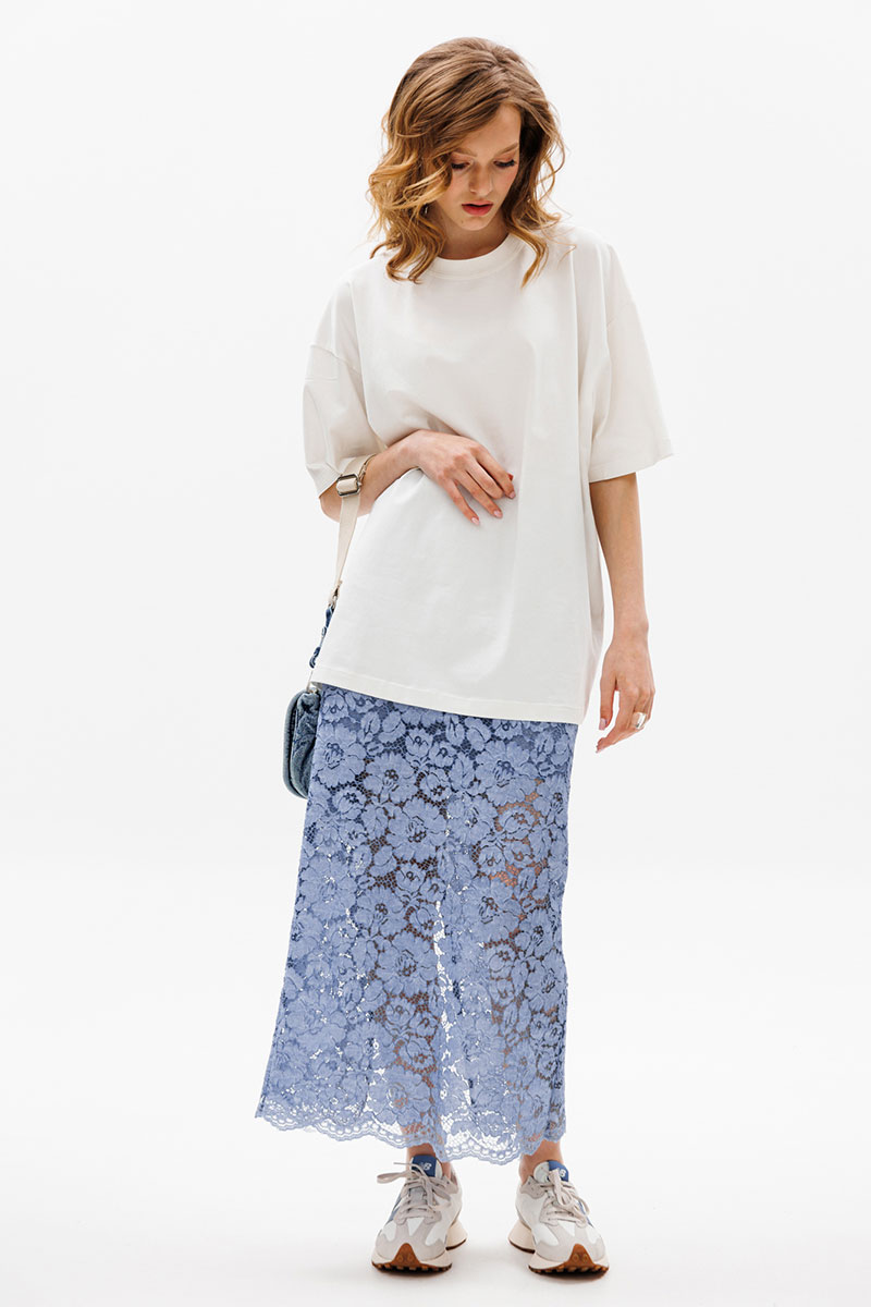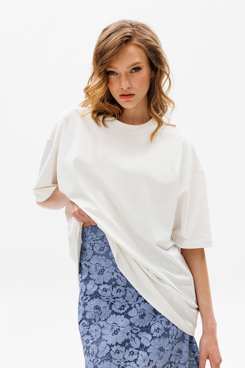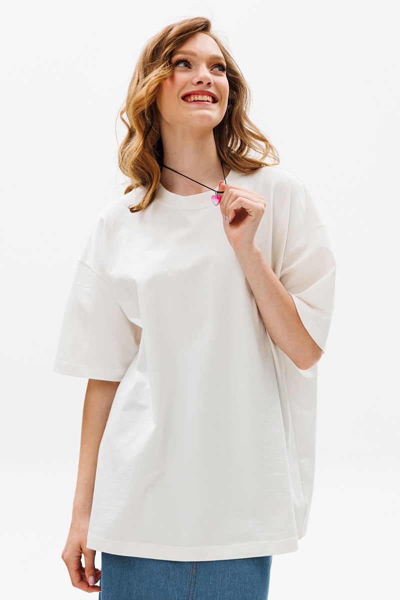 Джемпер выполнен из трикотажного полотна в виде футболки покроя "oversize", длиной ниже линии бедер. Горловина округлой формы, обработана бейкой. Плечевой шов спущен. Рукав одношовный, длиной до линии локтя.
