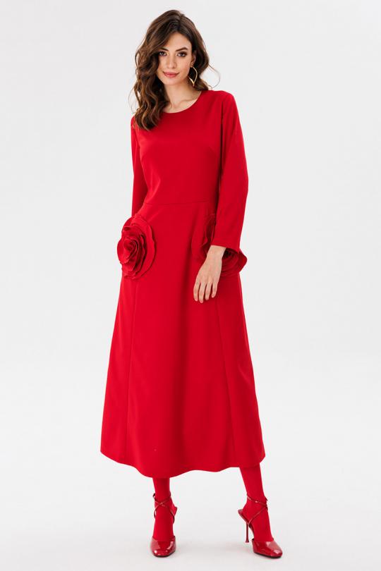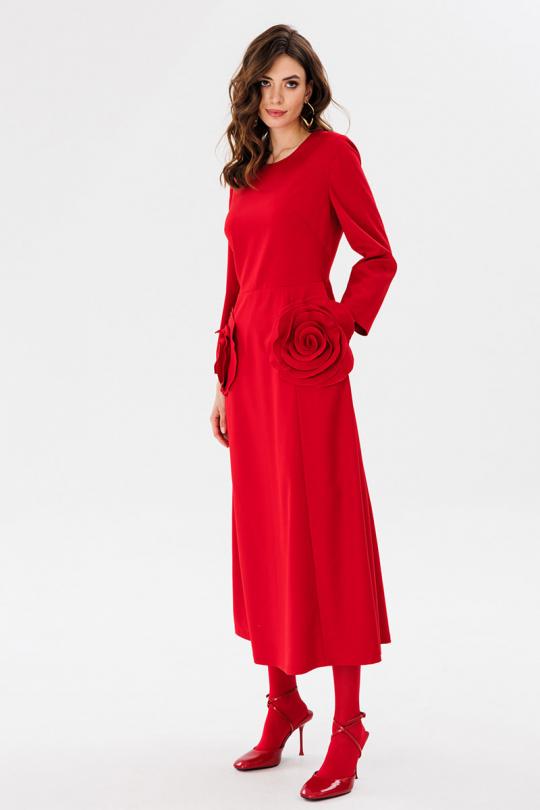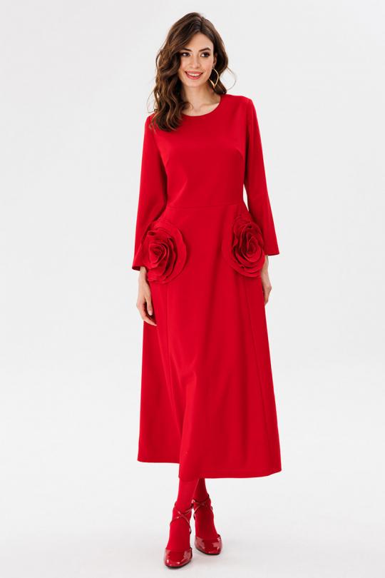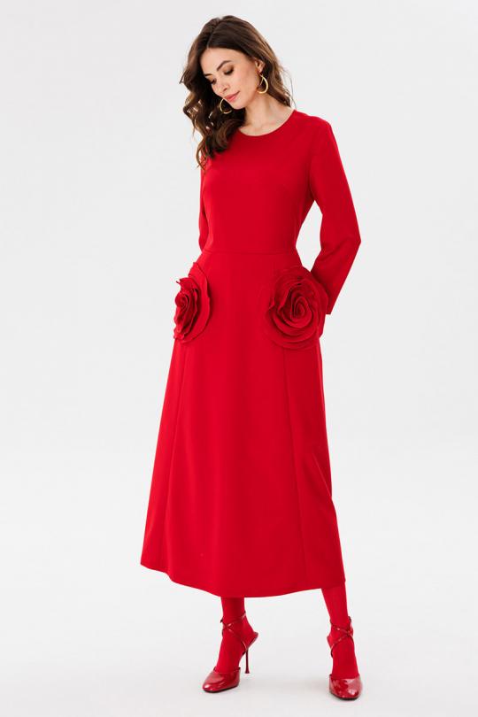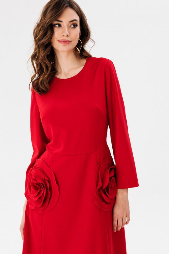 Платье Х-образного силуэта. Платье отрезное по линии талии. Спереди обработаны нагрудные вытачки. Застежка на потайную молнию в среднем шве спинки. Горловина округлой формы. Рукав втачной, одношовный, длиной 3/4. Юбка расширена к низу. Переднее полотнище состоит из трех клиньев. Спереди карманы с наклонным входом. Платье на отлетной по низу подкладке. Платье декорировано аппликациями в виде цветов из основной ткани.