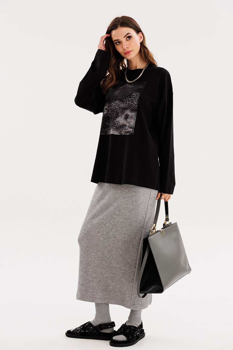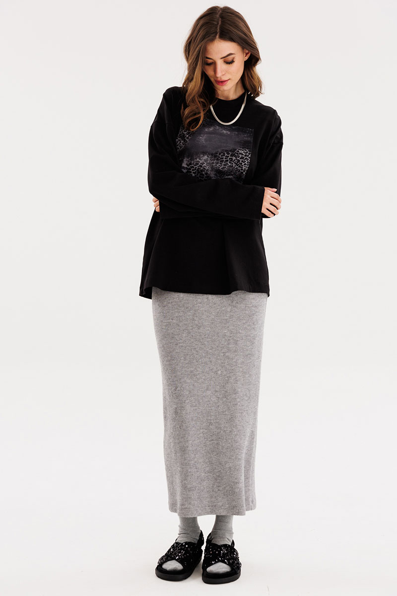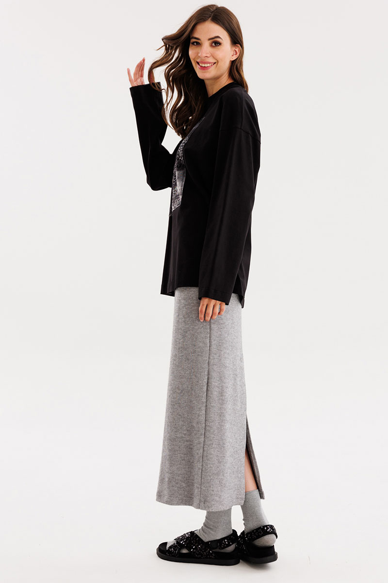 Юбка прямого силуэта, длиной миди. Юбка на притачном поясе с эластичной тесьмой. Переднее полотнище цельное. На заднем полотнище средний шов и разрез.