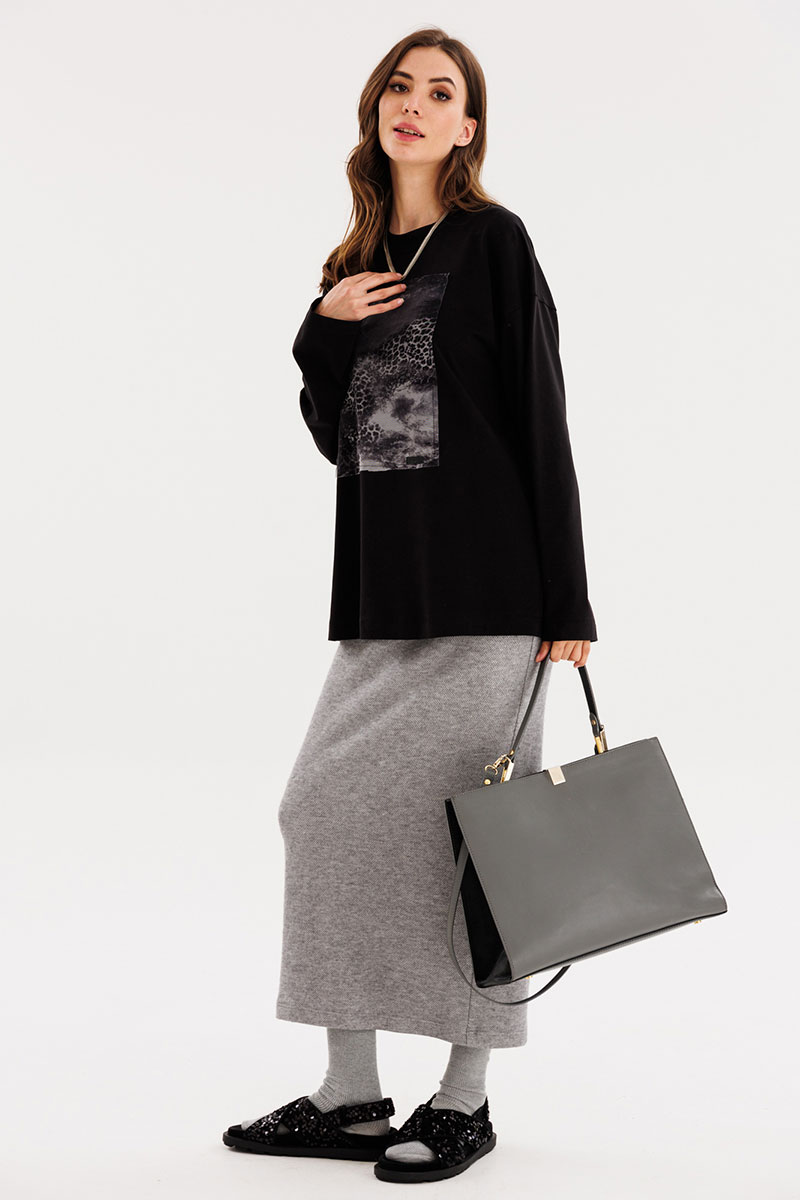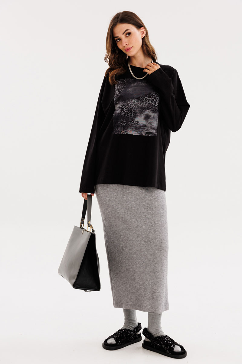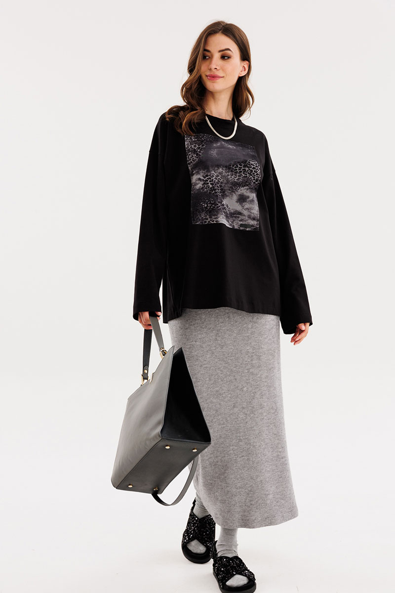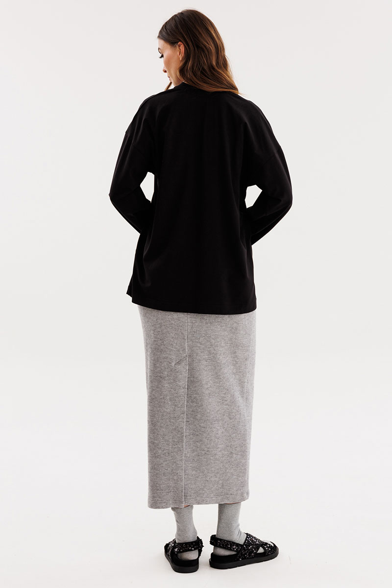 Юбка прямого силуэта, длиной миди. Юбка на притачном поясе с эластичной тесьмой. Переднее полотнище цельное. На заднем полотнище средний шов и разрез.