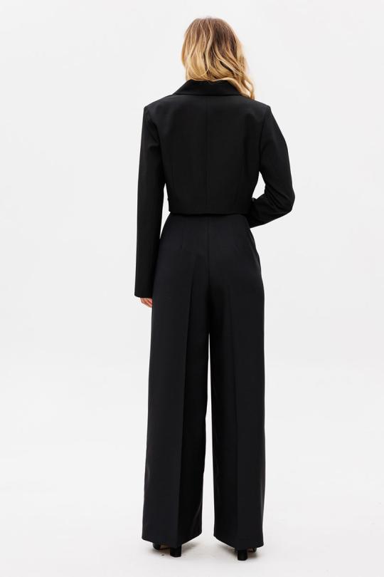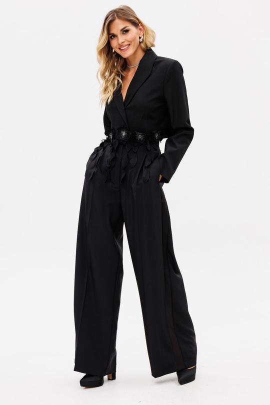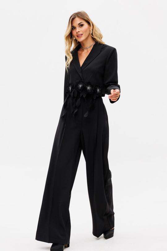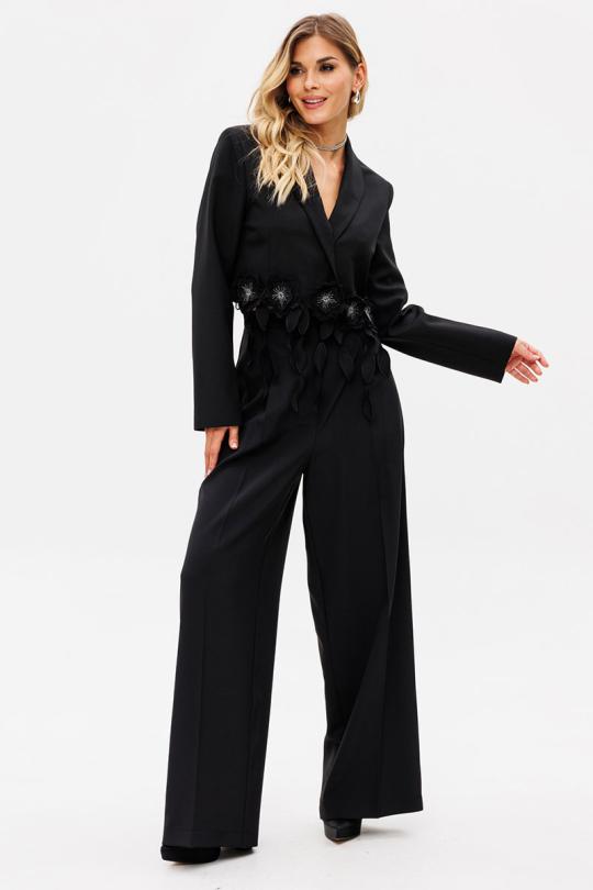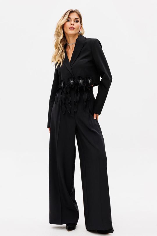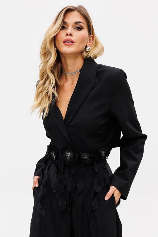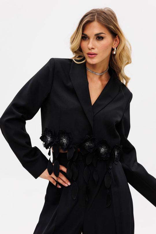 Жакет выполнен из костюмной ткани. Жакет полуприлегающего силуэта, длиной чуть ниже линии талии. Спереди лацканы и центральная однобортная застежкка на одну кнопку. На спинке средний шов. Воротник-шаль. Рукав втачной, двухшовный. Жакет на притачной по низу подкладке. Жакет декорирован аппликацией в виде цветов и лепестков по низу полочки.