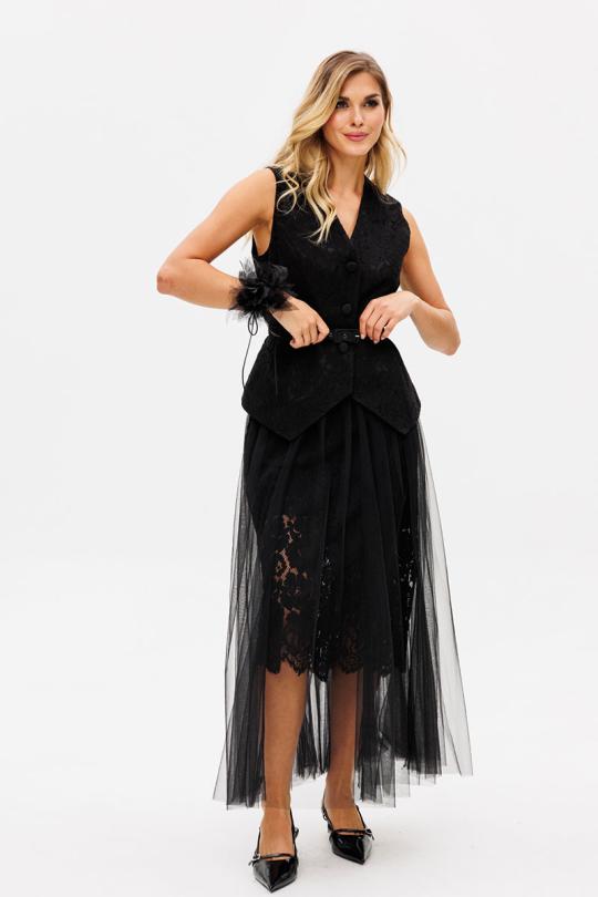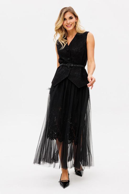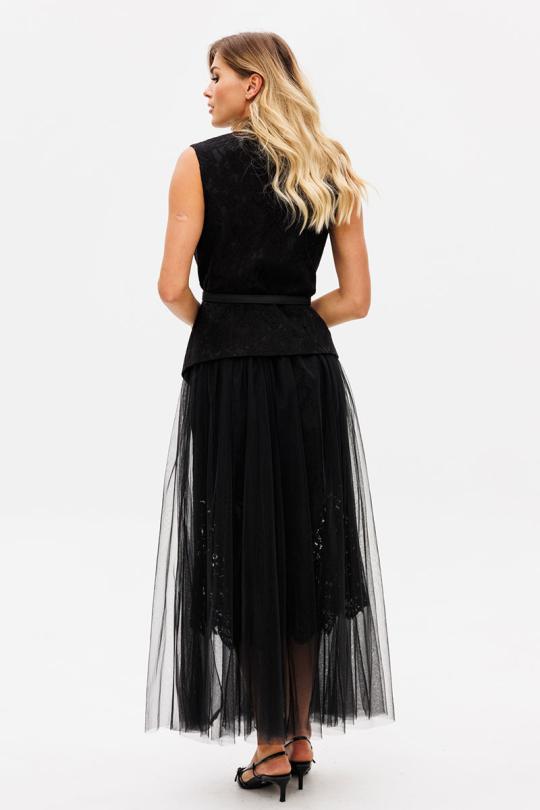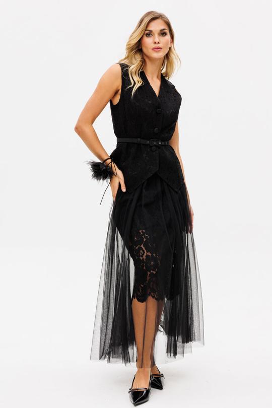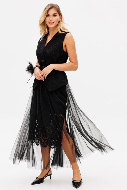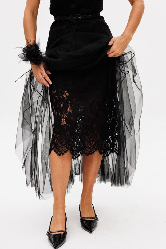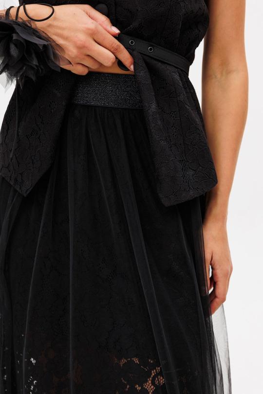 Комплект из двух юбок. Верхняя юбка выполнена из прозрачного фатина. Юбка А-образного силуэта, длиной миди, на притачном поясе из декоративной эластичной тесьмы. Нижняя юбка из гипюра, прямого силуэта, длиной ниже линии колена, на притачном поясе, в левом боковом шве разрез и застежка на потайную молнию, по низу юбки фестоны. Нижняя юбка на отлетной по низу подкладке.