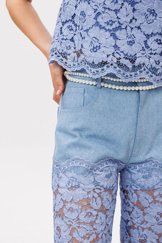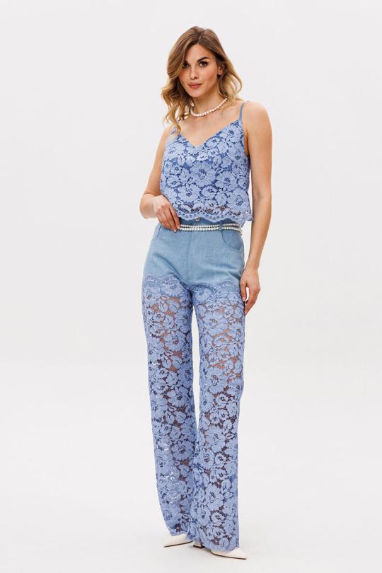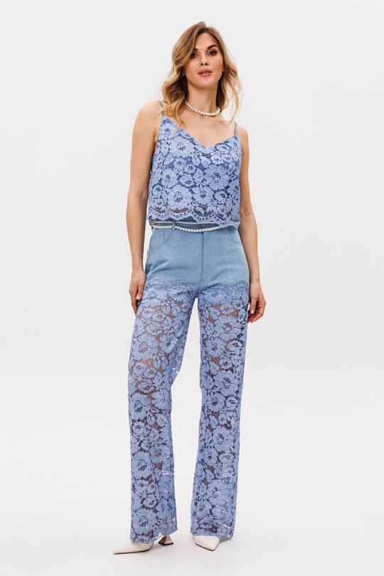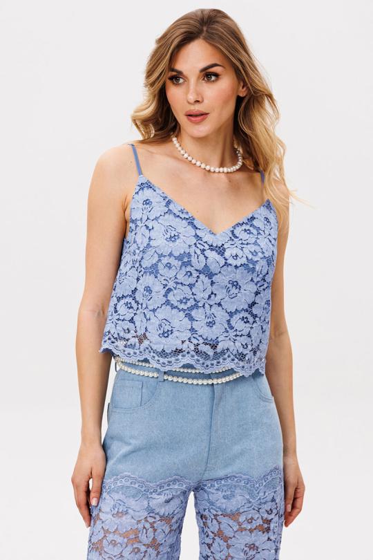 Топ выполнен из гипюра. Топ прямого силуэта, длиной до линии талии. Горловина переда V-образной формы. Перед на отлетной по низу подкладке. Топ на регулируемых бретелях. По низу топа фестоны.