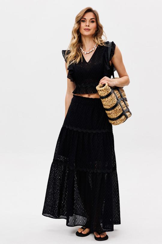 Юбка на притачном поясе, длиной миди, расширена к низу. Переднее и заднее полотнища состоят из трех ярусов, присборенных по линии притачивания друг к другу. Юбка на отлетной по низу подкладке до линии колена.
