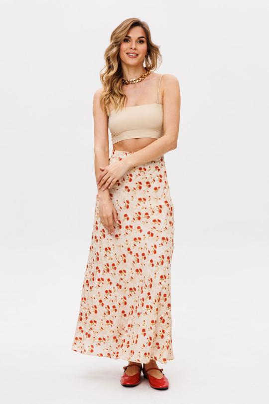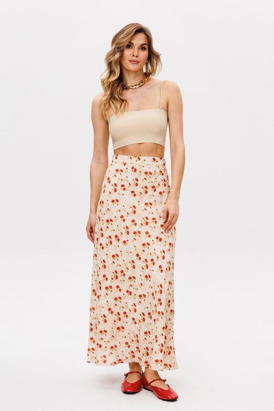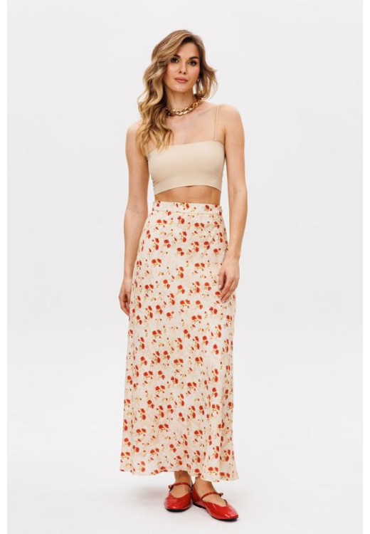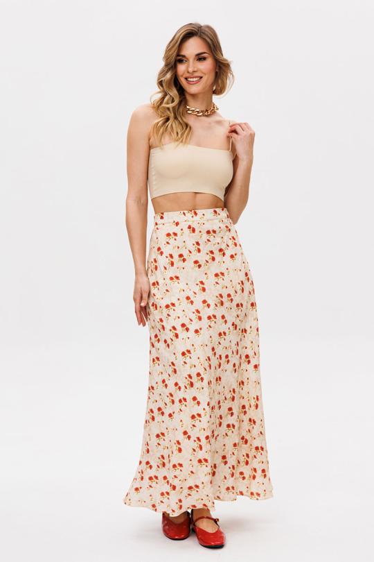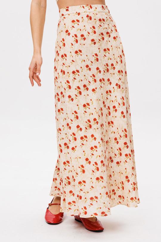 Юбка выполнена из плательной ткани с цветочным принтом. Юбка А-образного силуэта, длиной миди, на притачном поясе. Переднее и заднее полотнище выкроены по косой. В левом боковом шве застежка на потайную молнию. Пояс застегивается на пуговицу. Юбка на отлетной по низу подкладке.