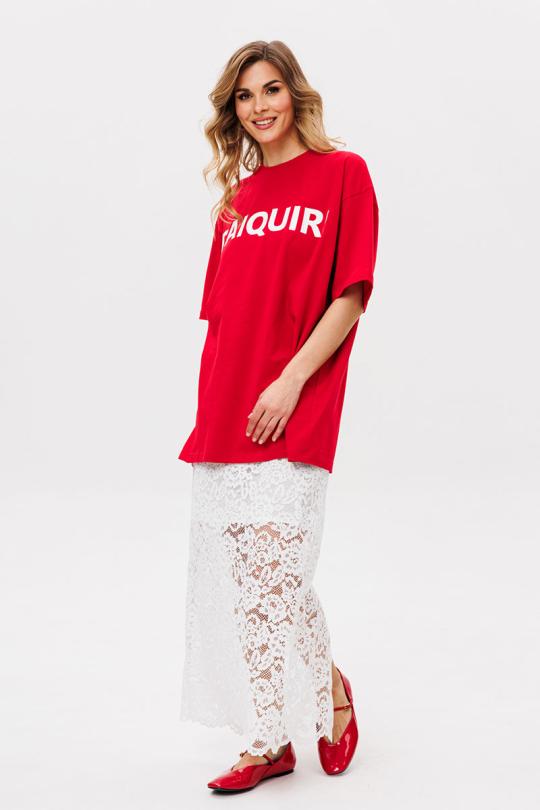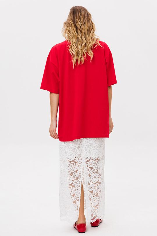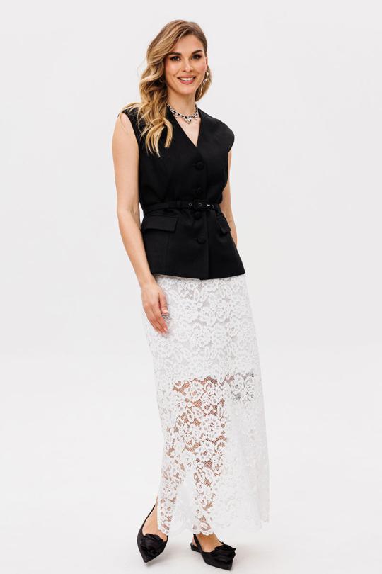 Юбка выполнена из гипюра с напыление серебристого цвета. Юбка прямого силуэта длиной миди, на притачном поясе. На заднем полотнище в среднем шве застежка на потайную молнию. Пояс застегивается на петлю и пуговицу. По низу юбки фестоны. Юбка на короткой отлетной по низу подкладке.