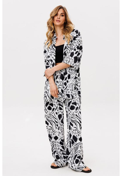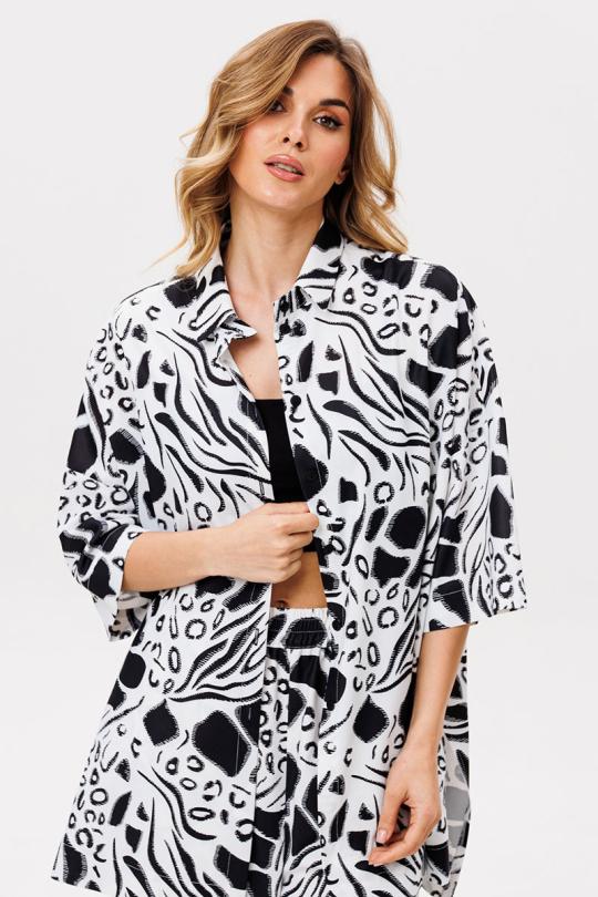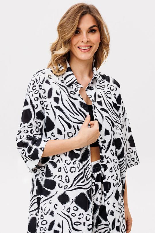 Блузка прямого силуэта, покроя oversize, длиной ниже линии бедер. Спереди центральная застежка на пуговицы. Спинка цельная. Воротник стояче-отложной. Плечевой шов удлинен. Рукав рубашечного покроя, одношовный, длиной ниже линии локтя. В боковых швах разрезы. Спинка длиннее переда.