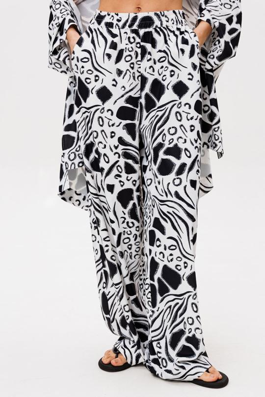 Брюки прямого покроя, на притачном поясе с эластичной тесьмой. Спереди боковые карманы с наклонным входом.