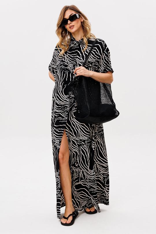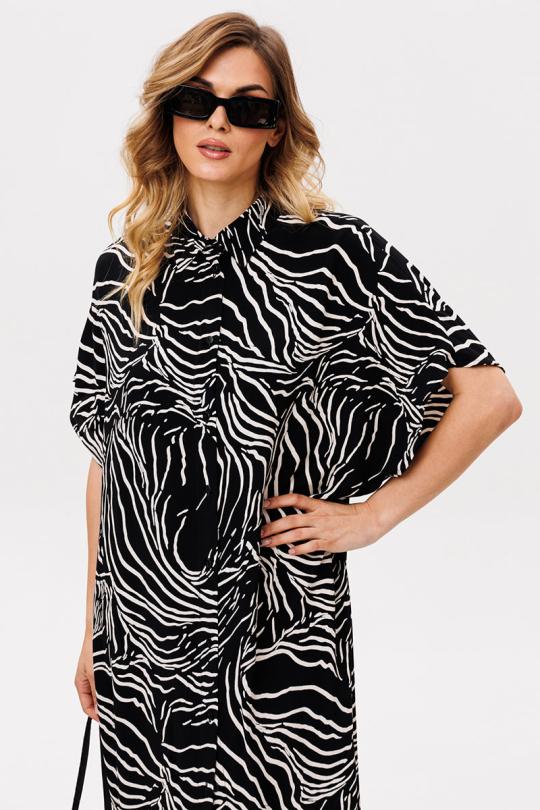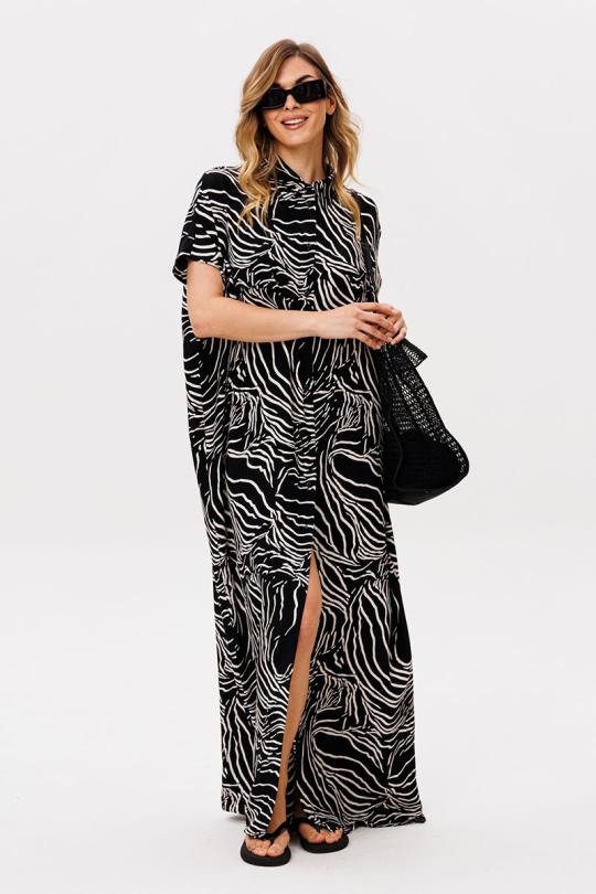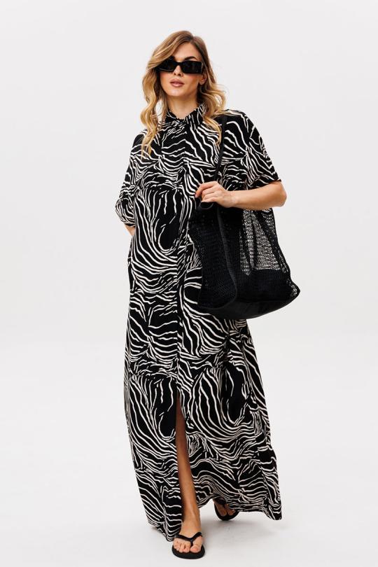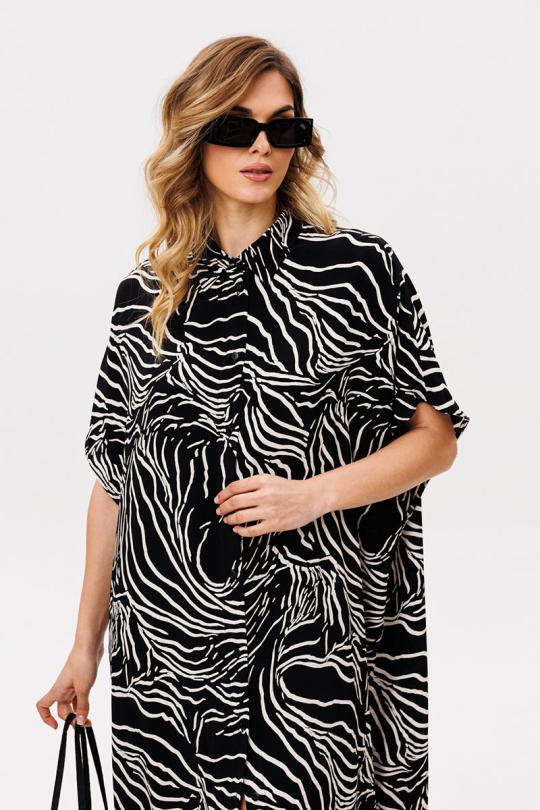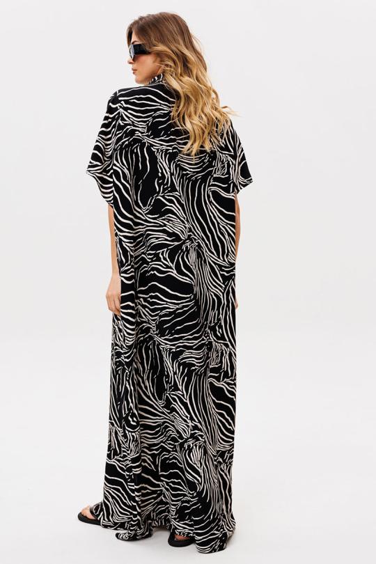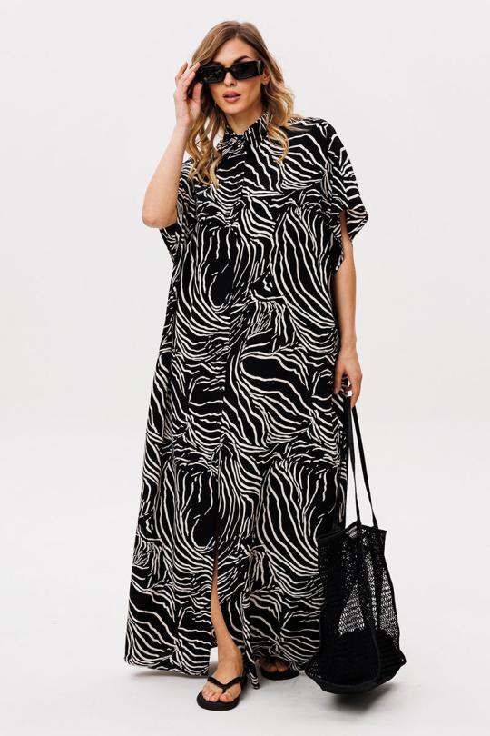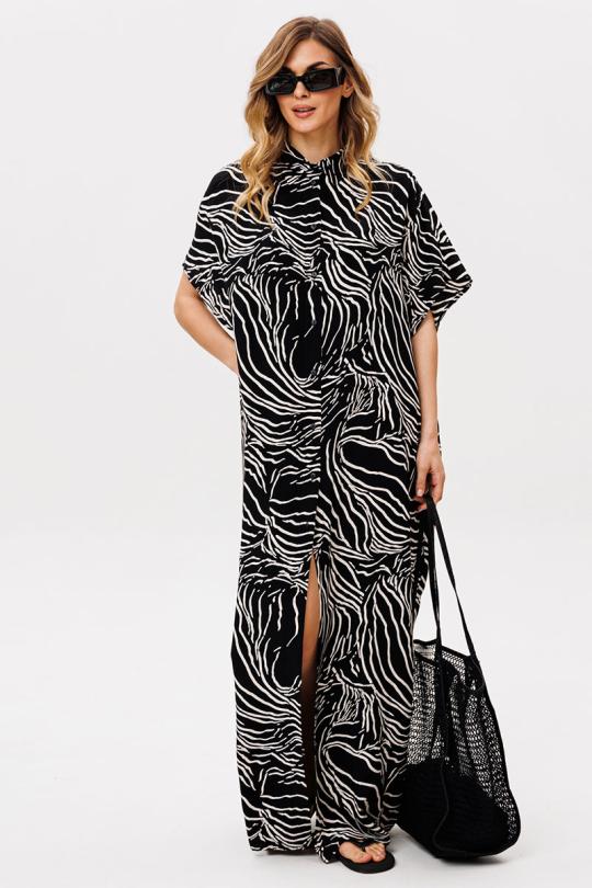 Платье выполнено из плательно-блузочной ткани с абстрактным принтом. Платье прямого силуэта, длиной в макси. Спереди центральная застежка до верха. Спинка цельная. Воротник стяче-отложной, с отрезной стойкой. Плечевой шов удлинен. Пройма углубленная.