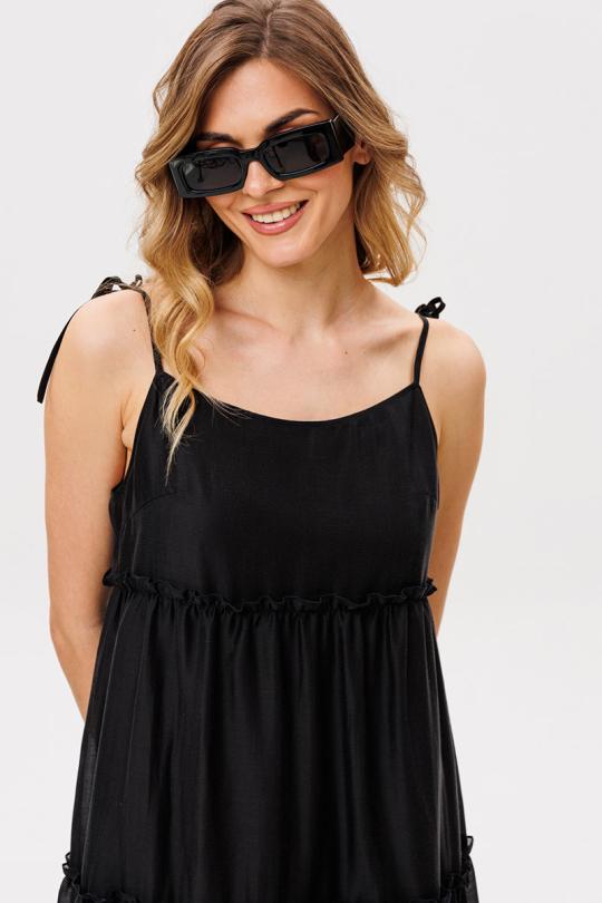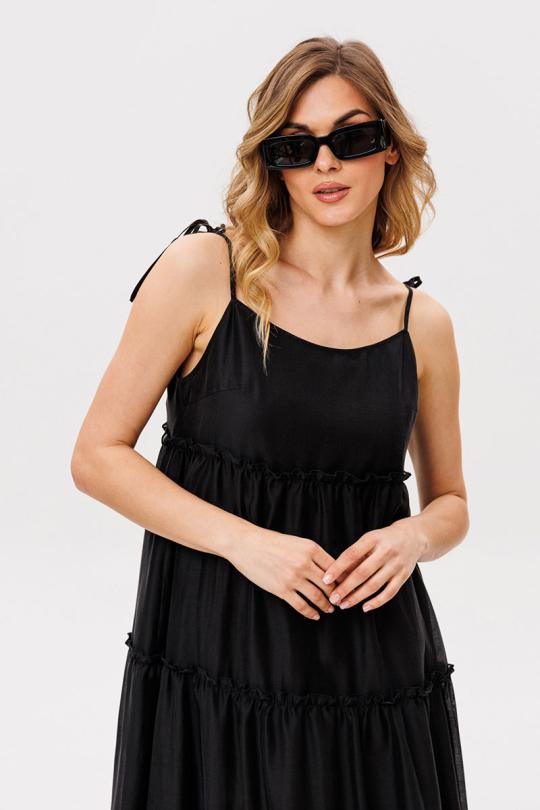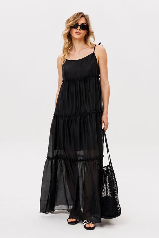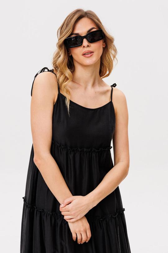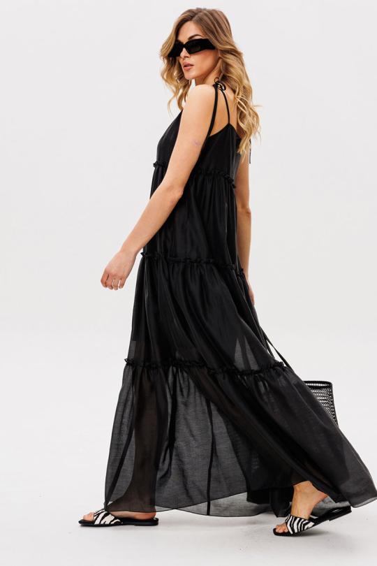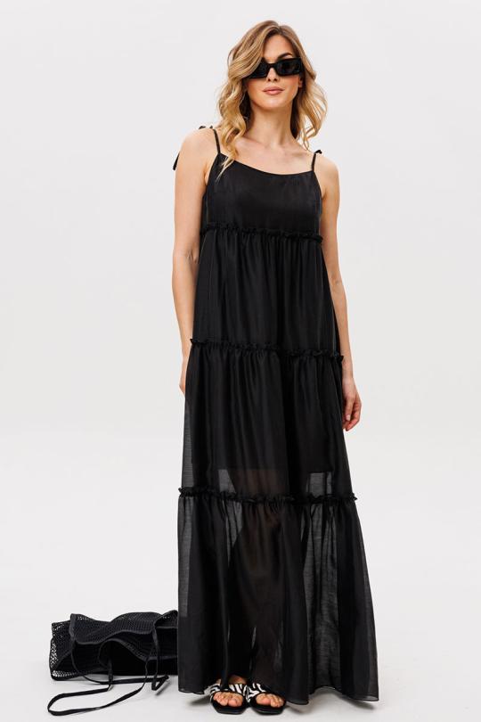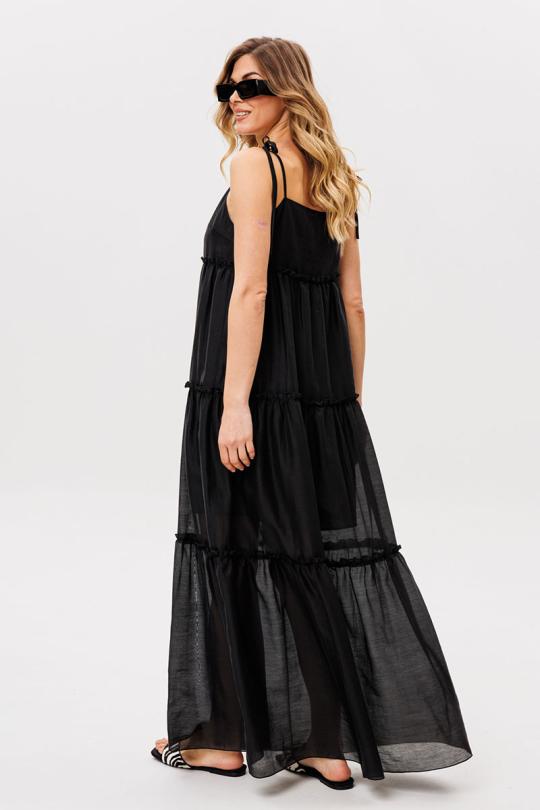 Сарафан выполнен из плательной ткани. Сарафан А-образного силуэта, многоярусный, длиной макси. Лиф на регулируемых бретелях-завязках из основной ткани. Сарафан на отлетной по низу подкладке.