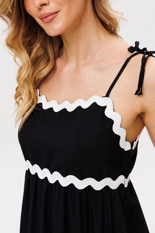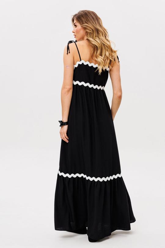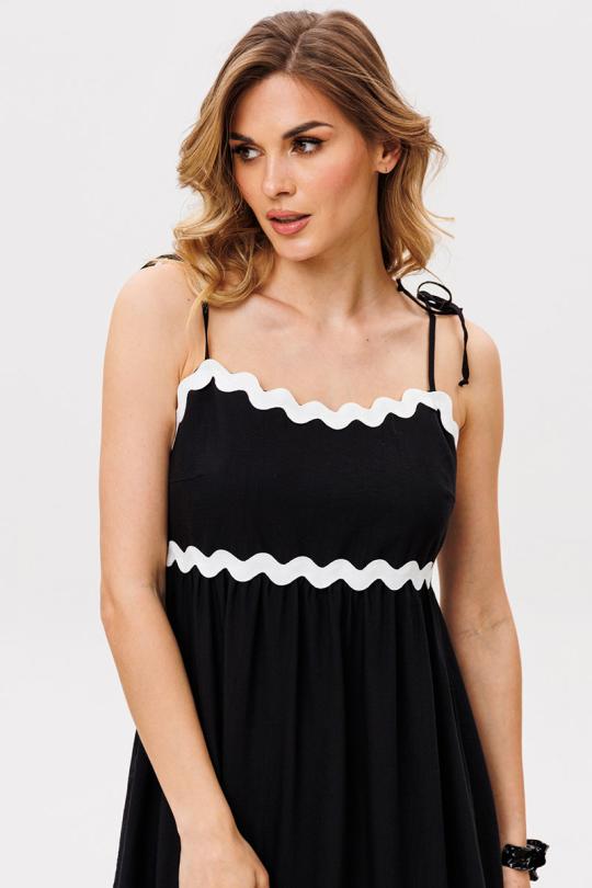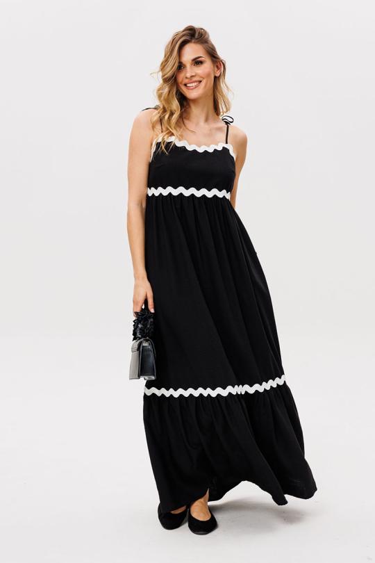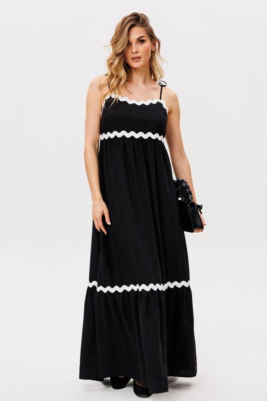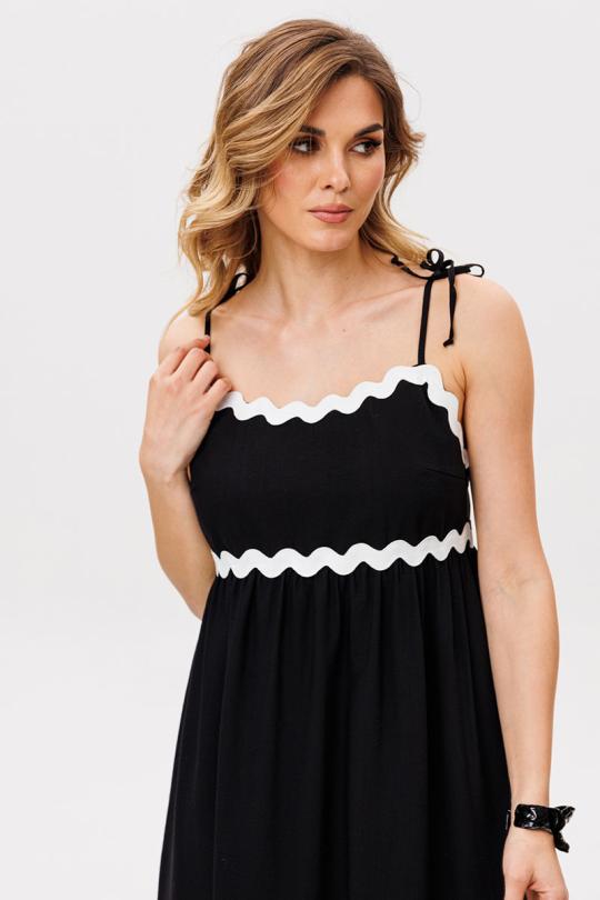Сарафан выполен из плательно-блузочной ткани. Сарафан А-образного силуэта, длиной миди. Сарафан отрезной под грудью. Юбка сарафана состоит из двух ярусов. В левом боковом шве застежка на потайную молнию. В боковых швах карманы. Сарафан на регулируемых бретелях из основной ткани. Сарафан декорирован контрастной тесьмой.