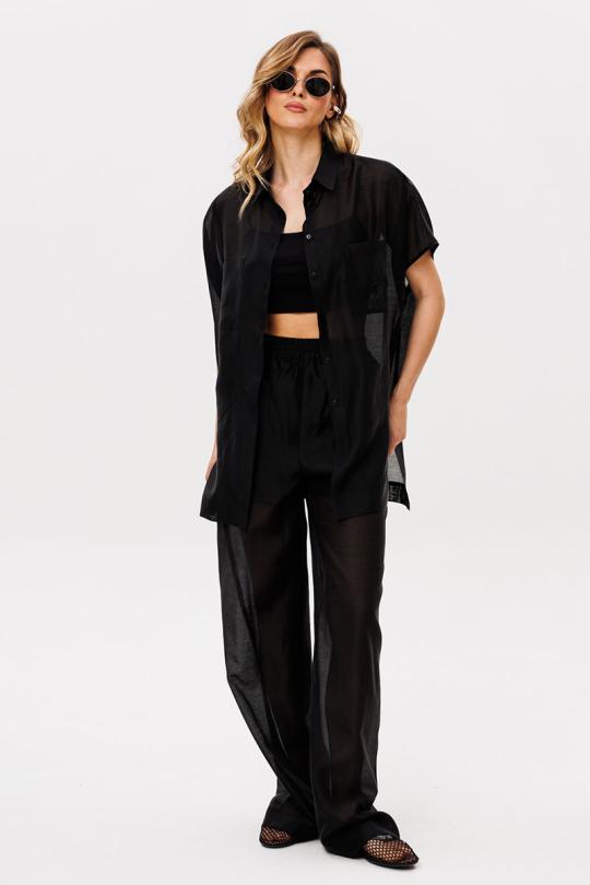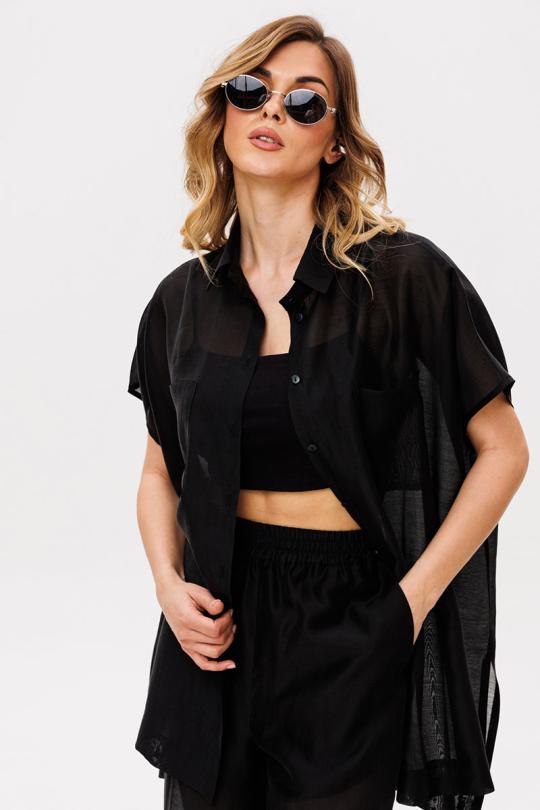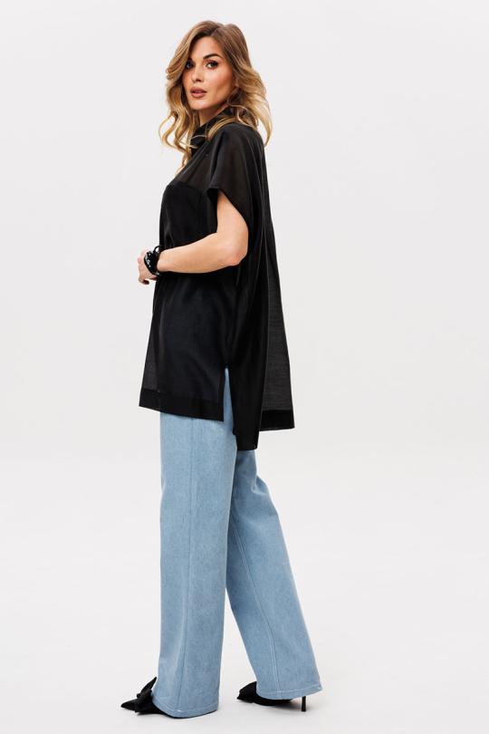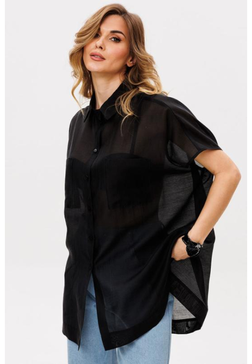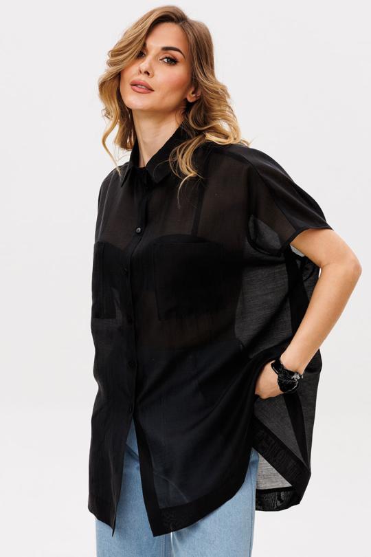 Блузка выполнена из плательно-блузочной ткани. Блузка прямого силуэта, длиной ниже линии бедер. Спереди центральная застежка на пуговицы с цельнокроеной планкой, и накладные нагрудные карманы. Спинка цельная. Воротник стояче-отложной с отрезной стойкой. Плечевой шов удлинен. В боковых швах разрезы. Спинка длиннее переда.