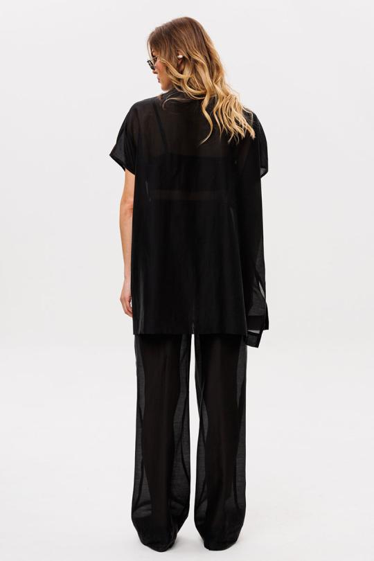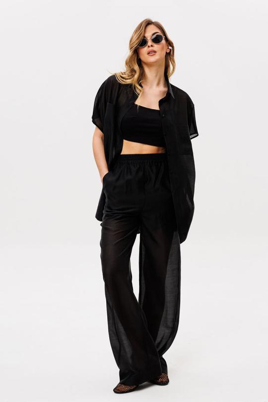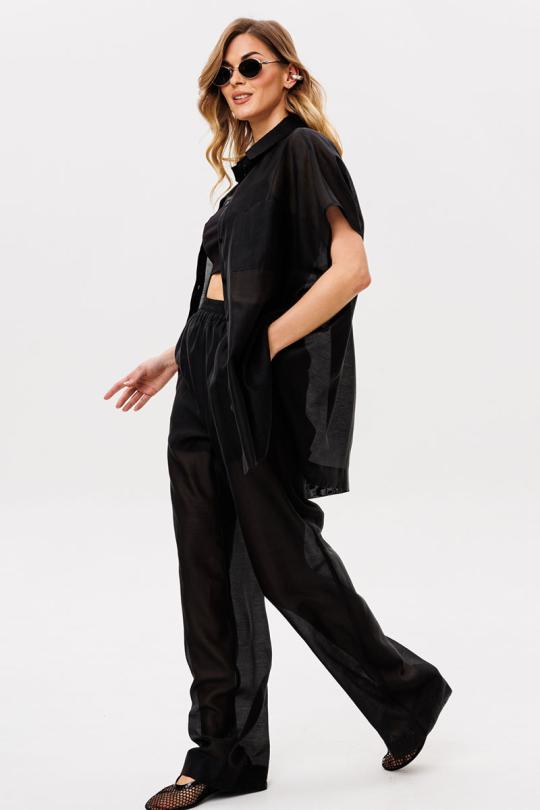 Брюки выполнены из плательно-блузочной ткани. Брюки прямого силуэта, на притачном поясе с эластичной тесьмой. Спереди боковые карманы с наклонным входом.