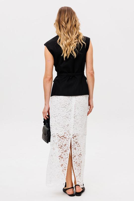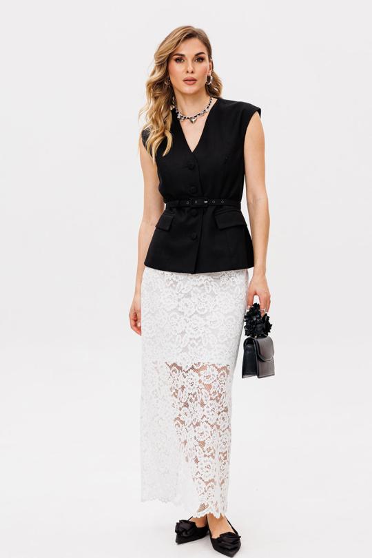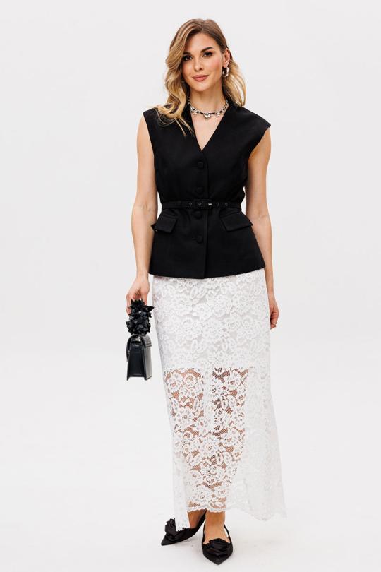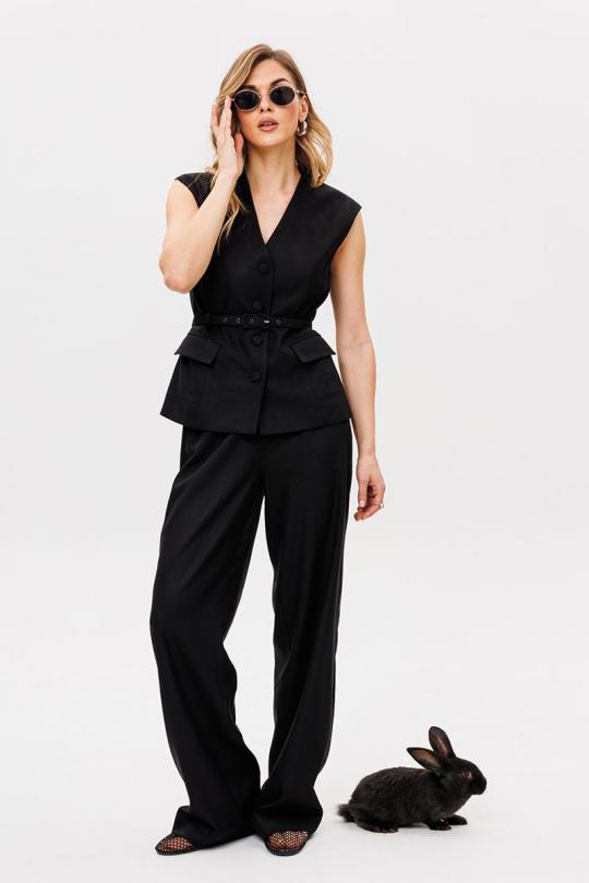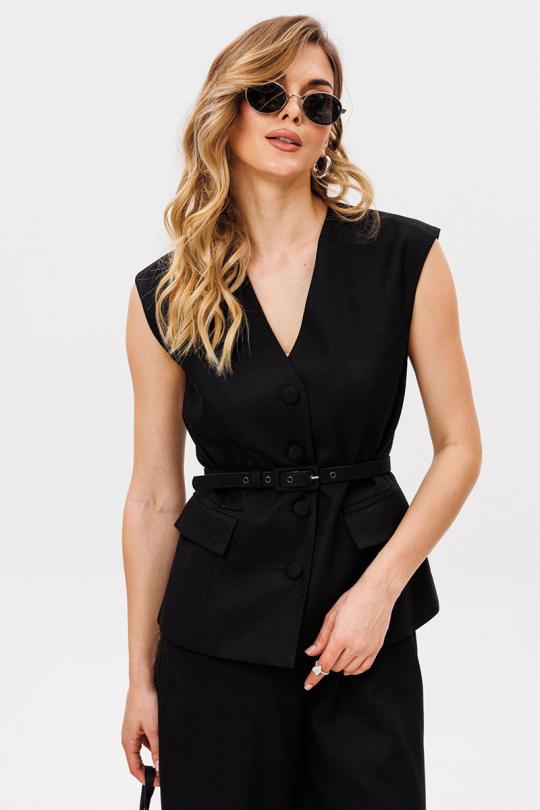 Жилет выполнен из льна. Жилет полуприлегающего силуэта, длиной выше линии бедер. Спереди рельефы, прорезные карманы с клапанами и центральная бортовая застежка на пуговицы. На спинке рельефы. Горловина V-образной формы. Плечевой шов удлинен. Жилет на притачной по низу подкладке. В комплект входит ремень из основной ткани.
