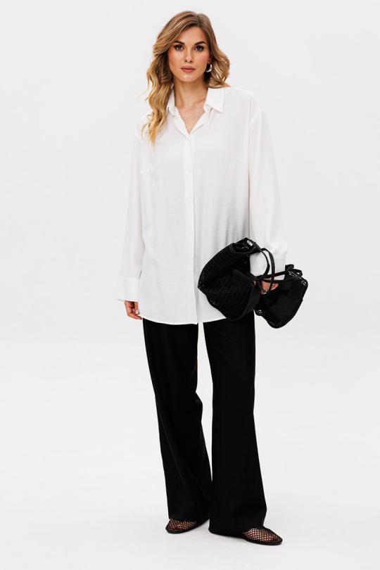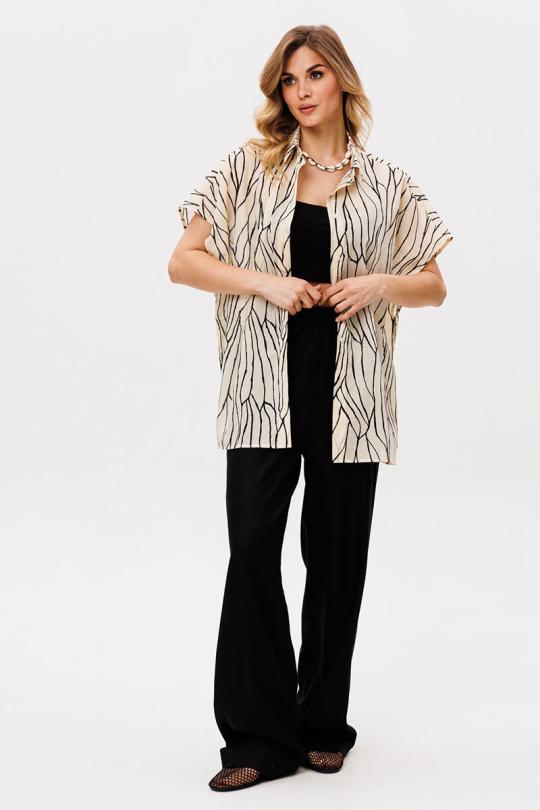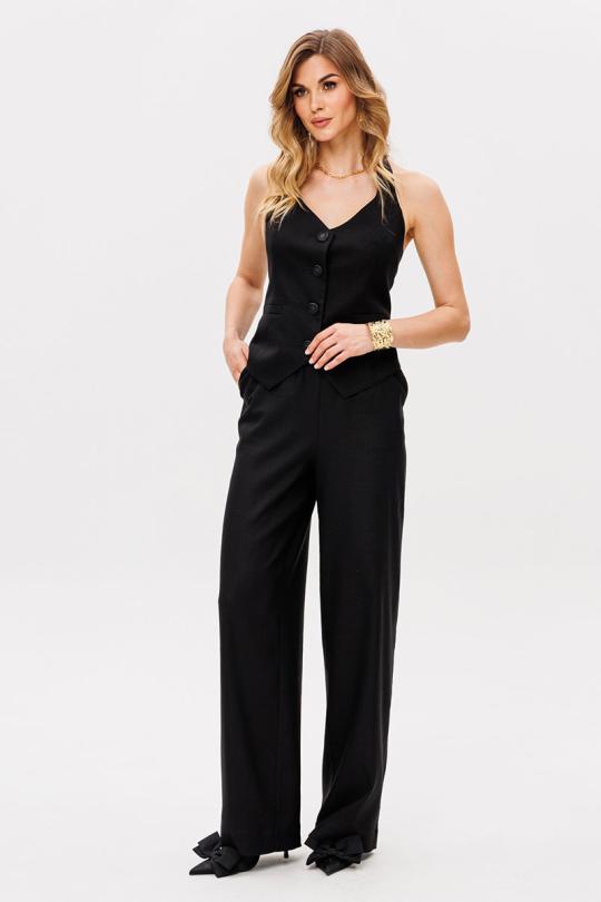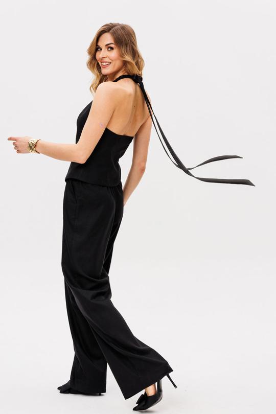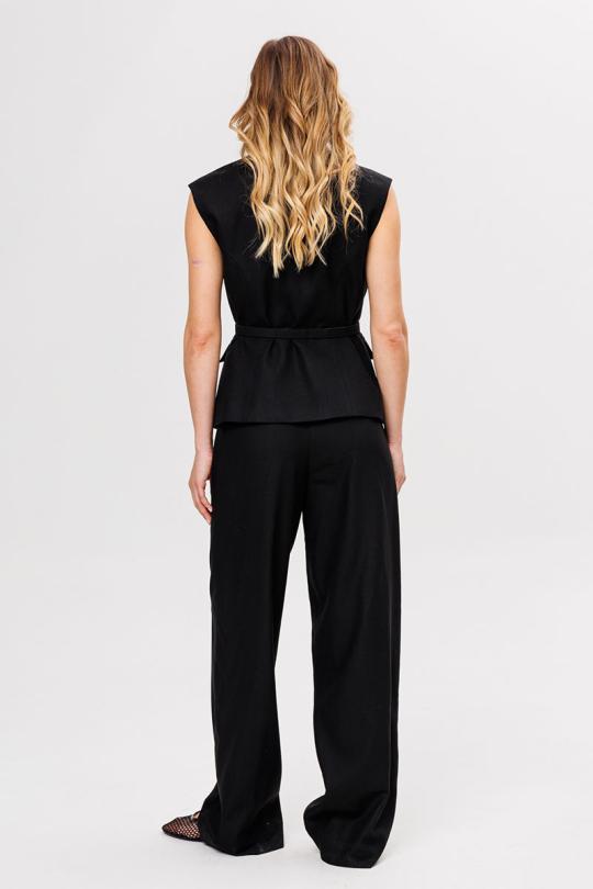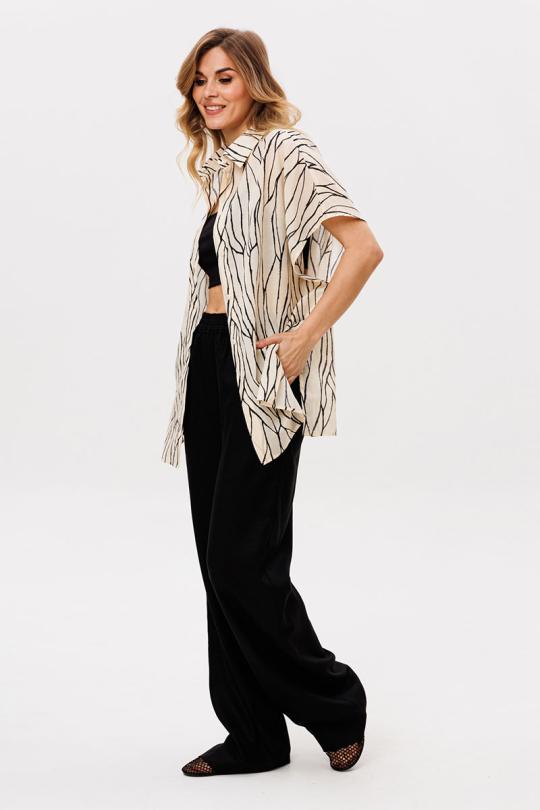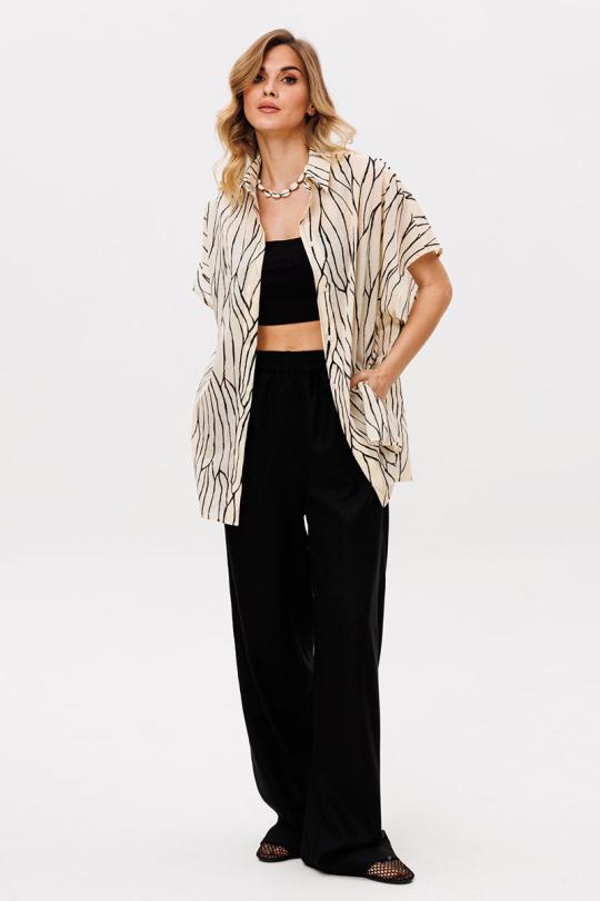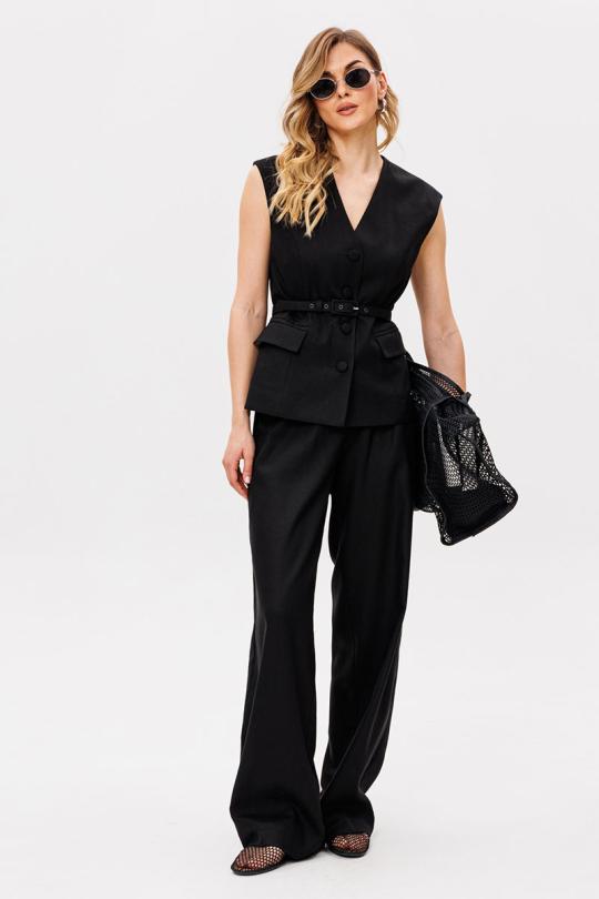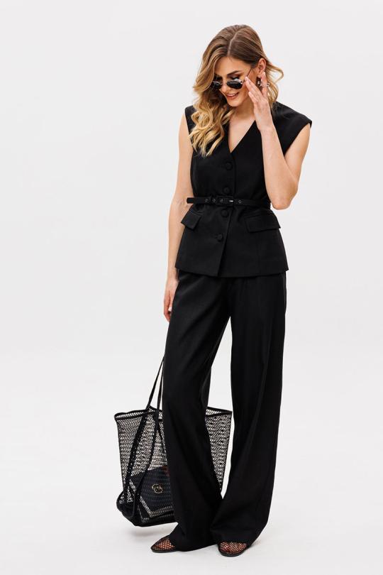 Брюки выполнены из льна. Брюки прямого покроя длиной в пол, на притачном поясе с эластичной тесьмой. Спереди боковые карманы с наклонным входом.