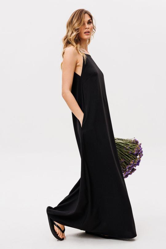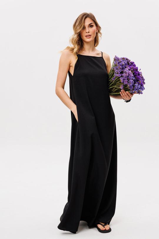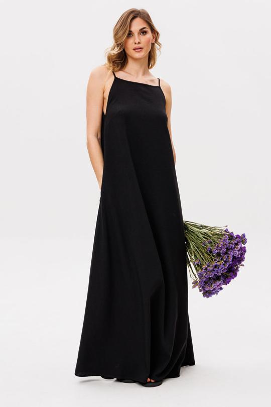 Сарафан выполнен из костюмно-плательной ткани. Сарафан А-образного силуэта. Перед и спинка цельные. Проймы V-образной формы, обработаны окантовкой из основной ткани, переходящей в бретели. В боковых швах карманы.