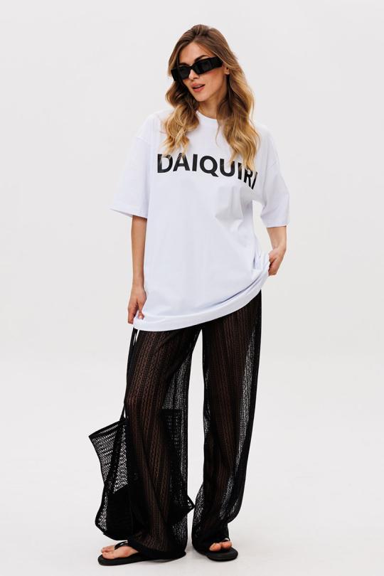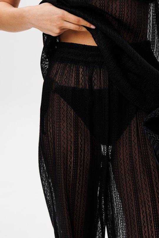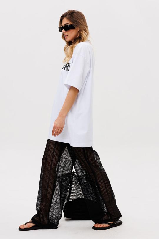 Брюки выполнены из сетки с рисунком. Брюки прямого силуэта, длиной в пол, на притачном поясе с эластичной тесьмой.