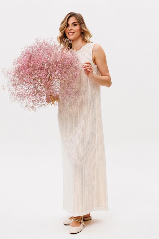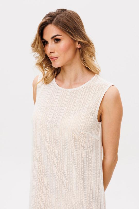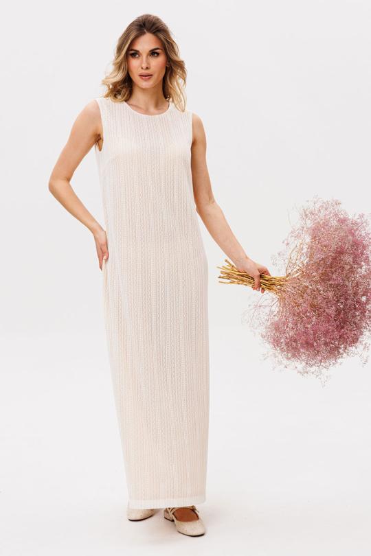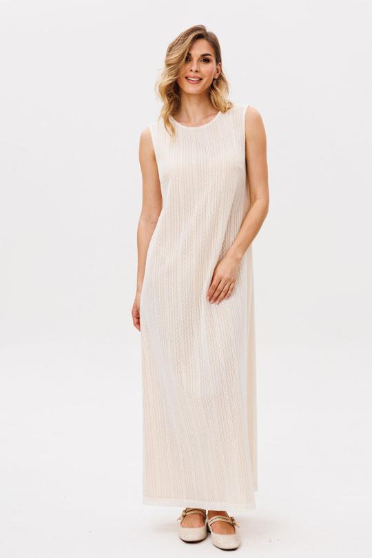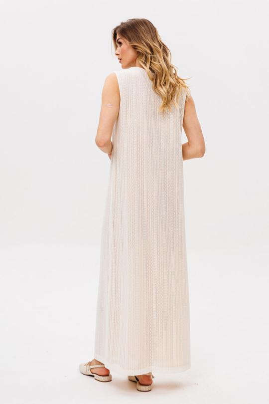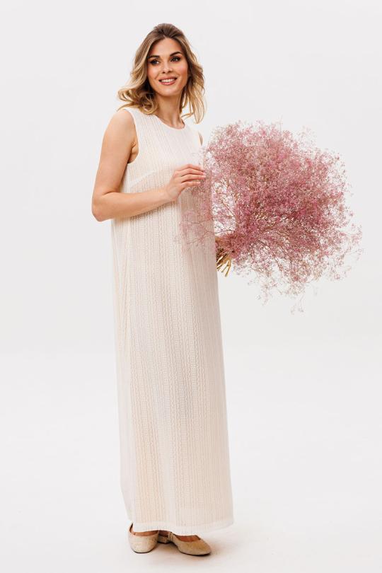Платье выполнено из сетки с рисунком. Платье прямого силуэта, длиной миди. Горловина округлой формы. Платье на отлетной по низу подкладке.