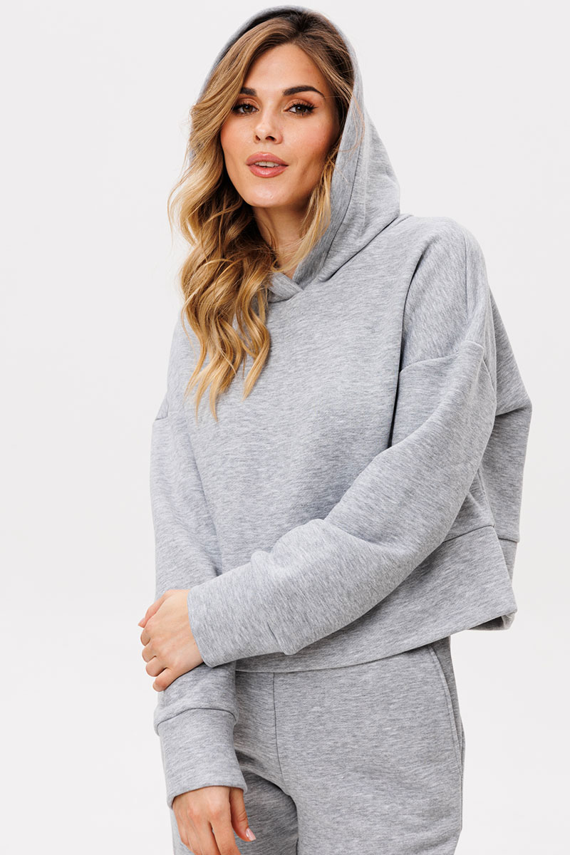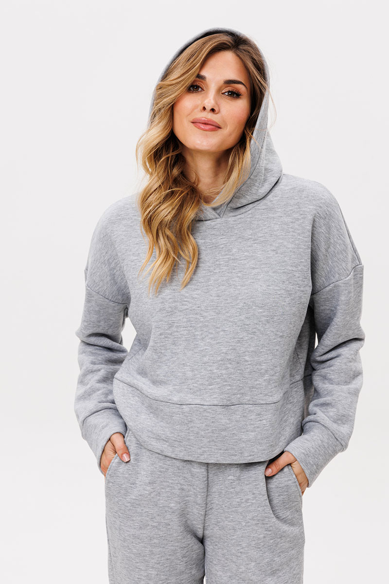 Джемпер прямого силуэта, длиной ниже линии талии. Перед и спинка цельные. Горловина обработана капюшоном. Плечевой шов спущен. Низ рукава и низ джемпера на манжете из основной ткани.