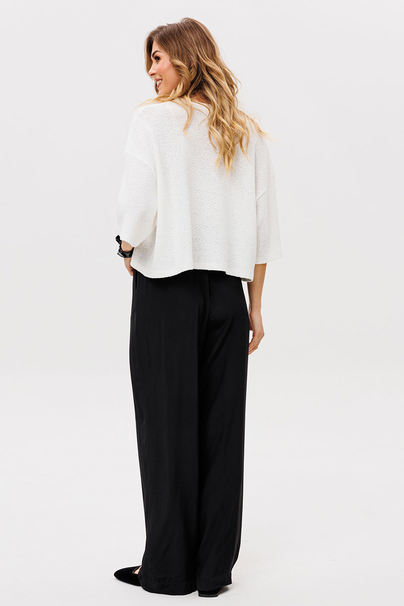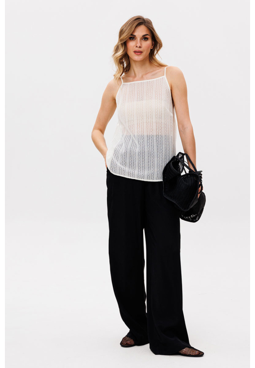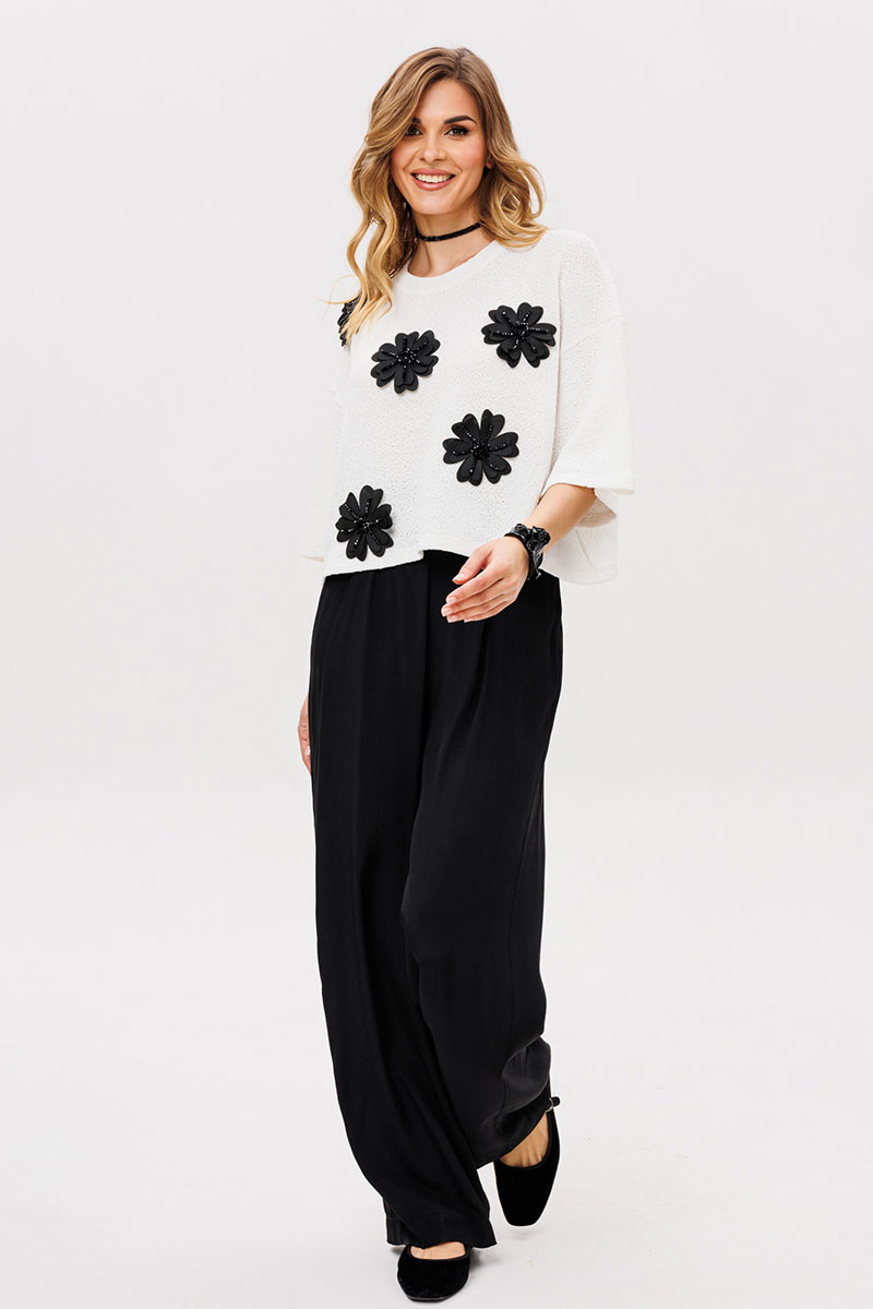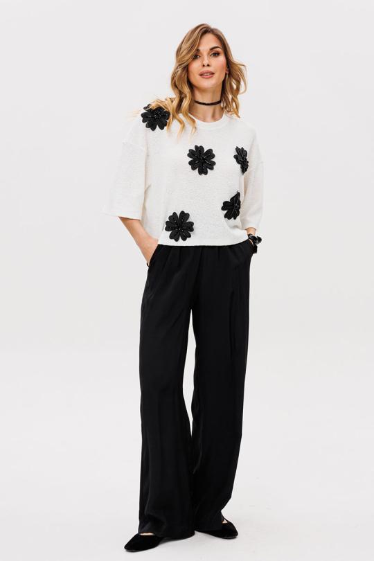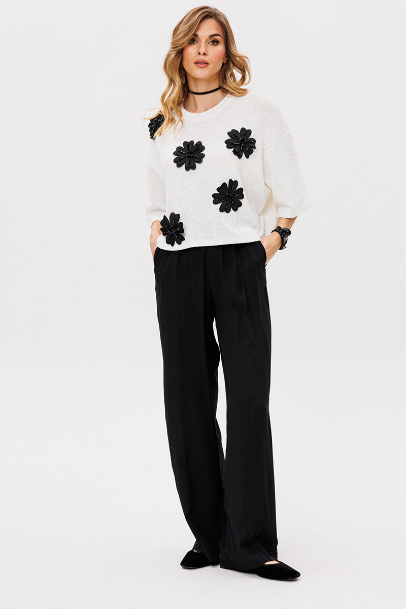 Брюки выполнены из плательно-костюмной ткани. Брюки прямого силуэта, на притачном поясе с эластичной тесьмой, длиной в пол. Спереди боковые карманы с наклонным входом.