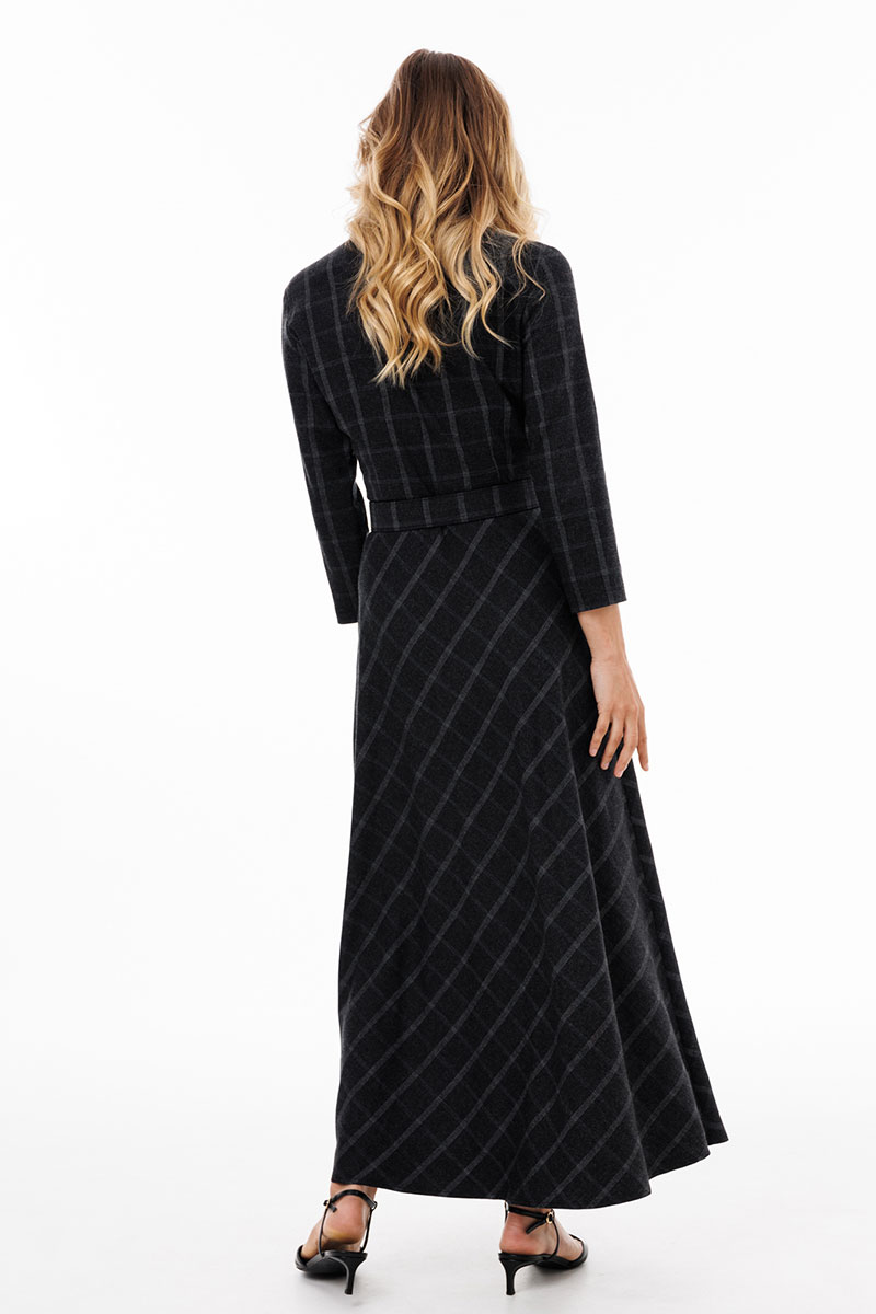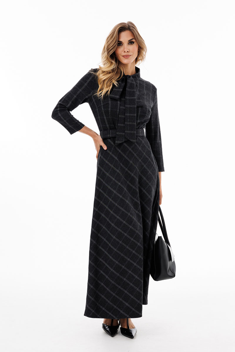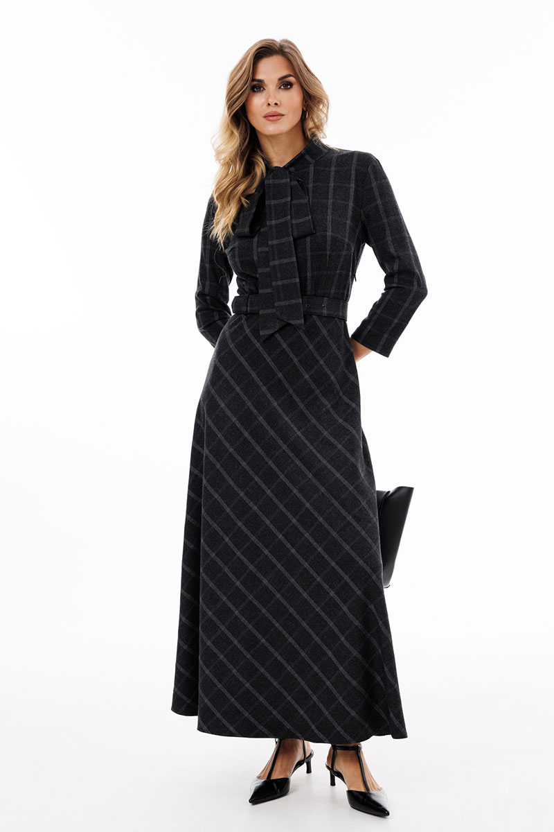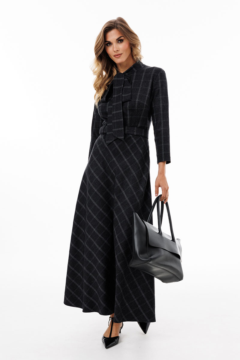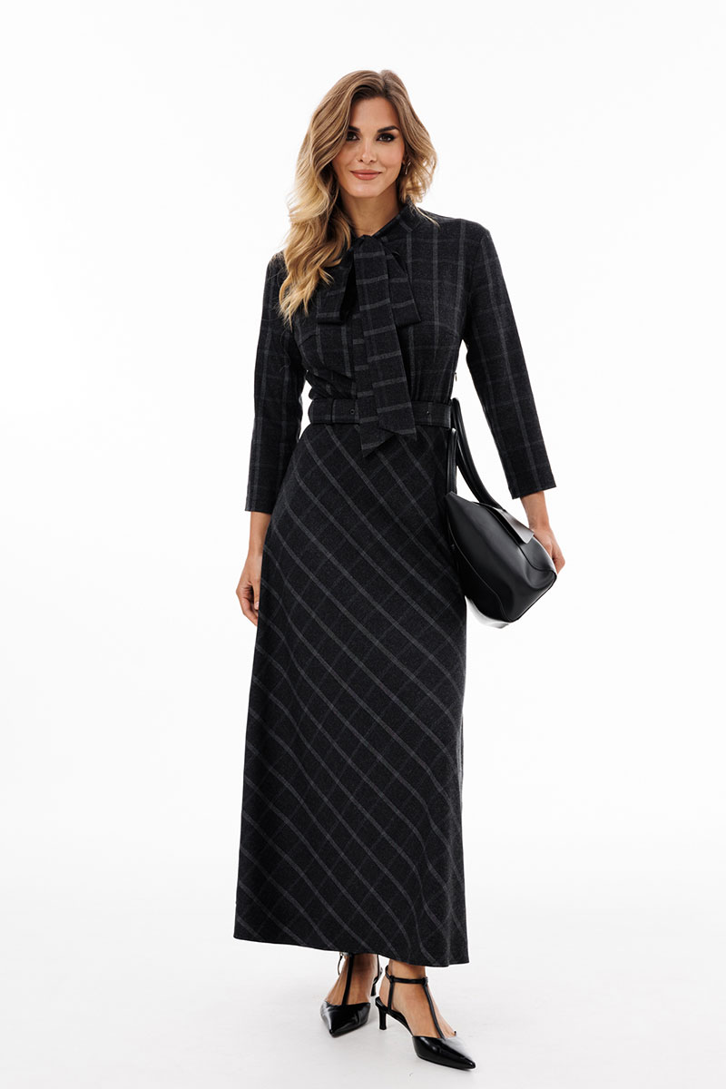 Платье выполнено из костюмной ткани в клетку. Платье Х-образного силуэта, длиной миди. Платье отрезное по линии талии. Спереди горловина V-образной формы, застежка на пуговицы. Воротник стойка, переходящий в бант. Рукав втачной одношовный, длиной 3/4. Юбка покроена по косой. В левом боковом шве застежка на потайную молнию. В комплект входит ремень из основной ткани с обтяжной пряжкой.
