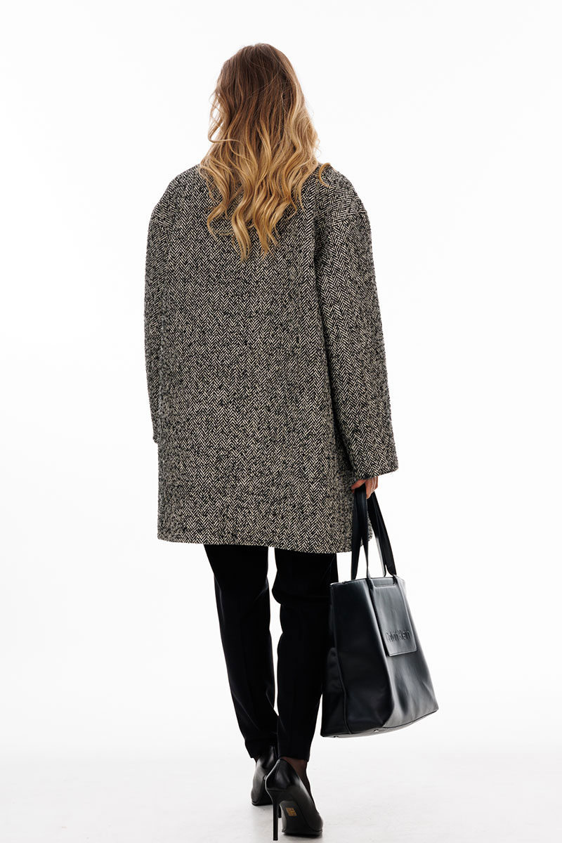 Полупальто выполнено из пальтовой ткани, меланж с рисунком "елочка". Спереди накладные карманы, двубортная застежка. На спинке средний шов. Воротник пиджачного типа. Плечевой шов удлинен. Рукав рубашечного покроя, одношовный с локтевой вытачкой. Полупальто на притачной по низу подкладке.