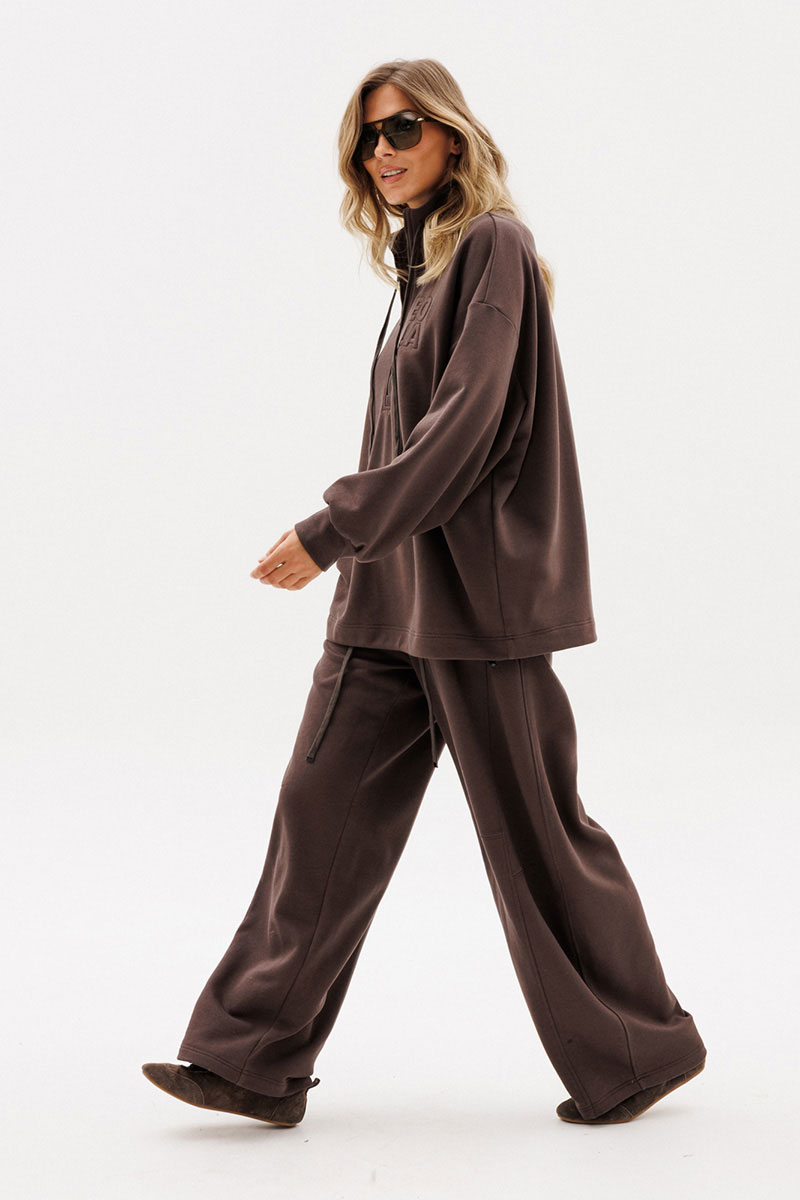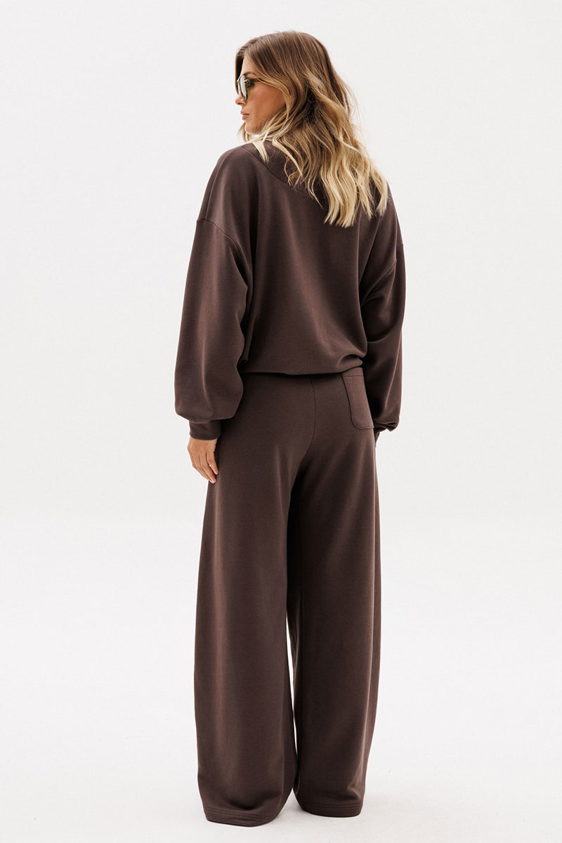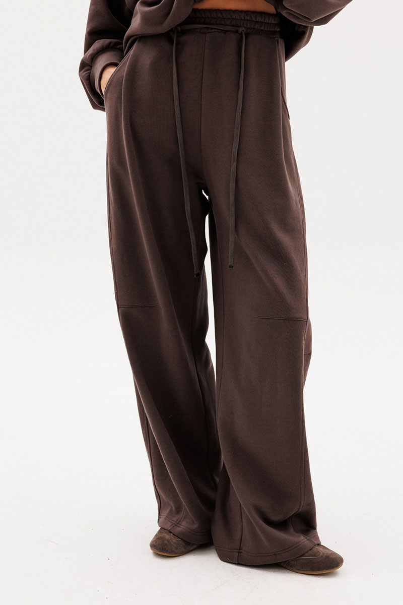 Брюки прямого силуэта, длиной в пол, на притачном поясе с эластичной тесьмой. Спереди боковые карманы с фигурным входом, петли в поясе, в которые втянут шнур из основной ткани, коленные вытачки, складки. Сзади справа накладной карман.