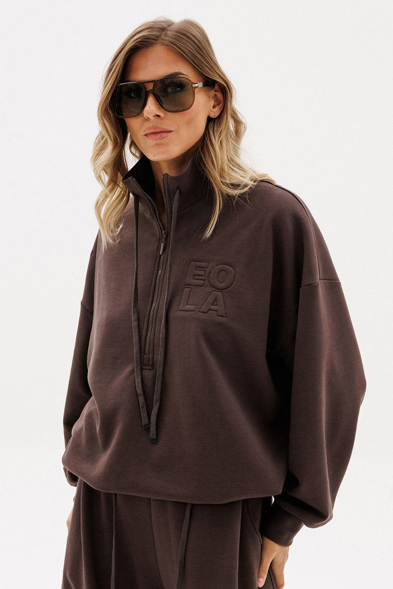 Джемпер прямого силуэта, покроя "oversize" длиной до линии бедер. Спереди застежка на молнию. Воротник-стойка. Плечевой шов удлинен. Рукав рубашечного покроя, одношовный, расширенный и присборенный к низу. Низ рукава на притачной манжете. Низ джемпера на эластичной тесьме с фиксаторами. Джемпер декорирован вышивкой по переду.