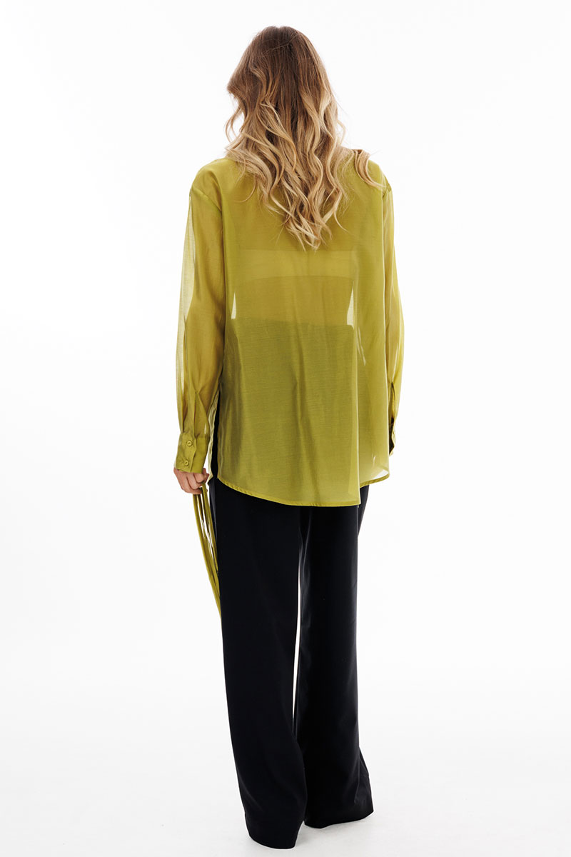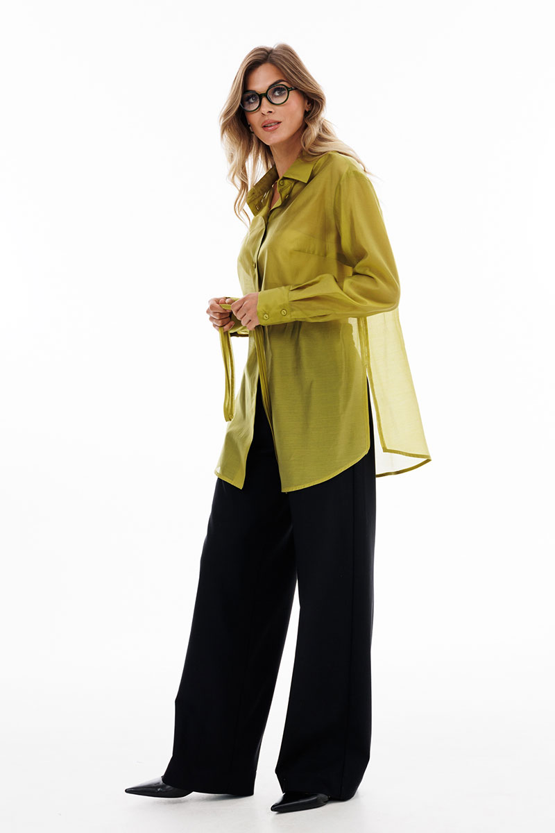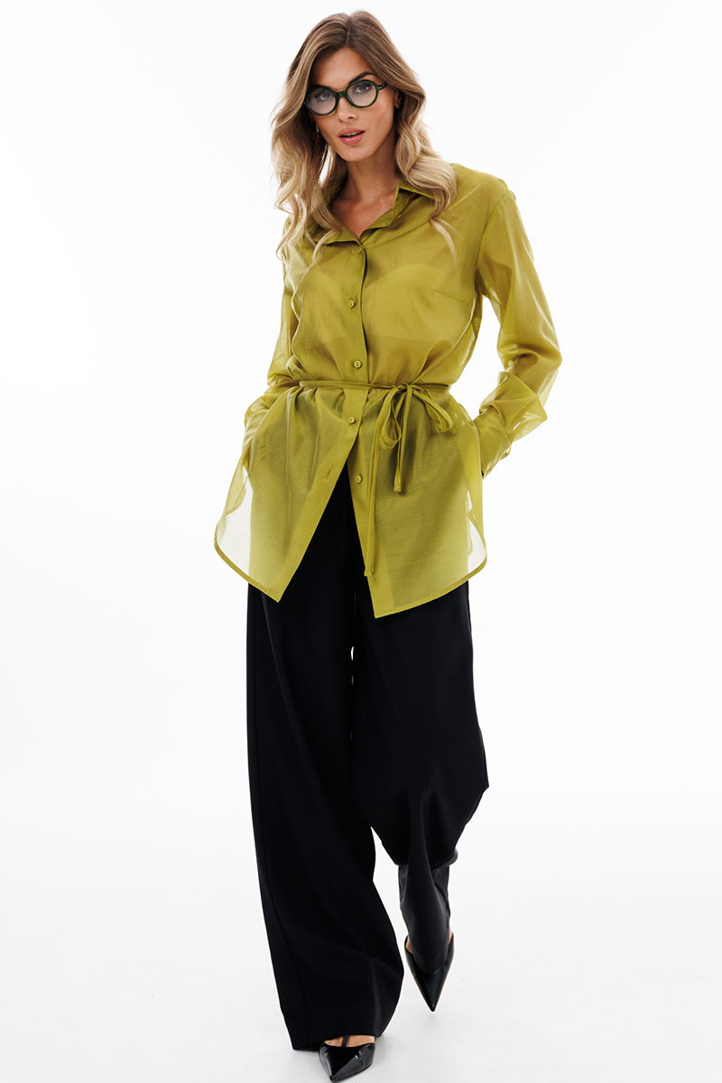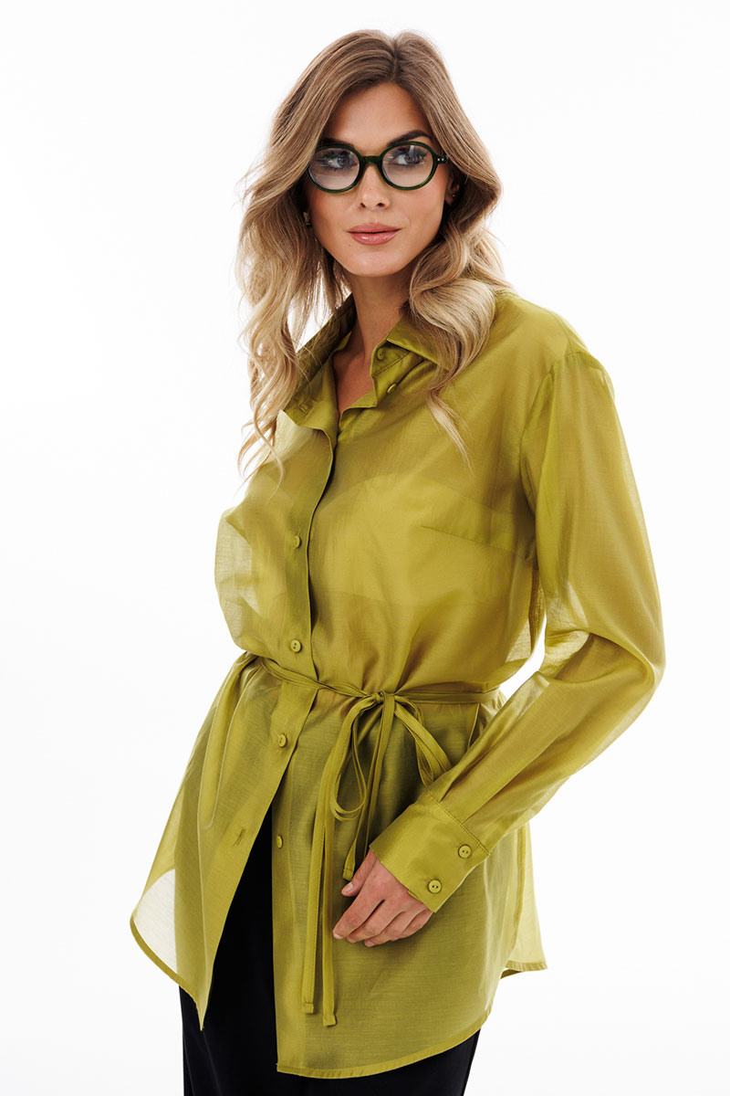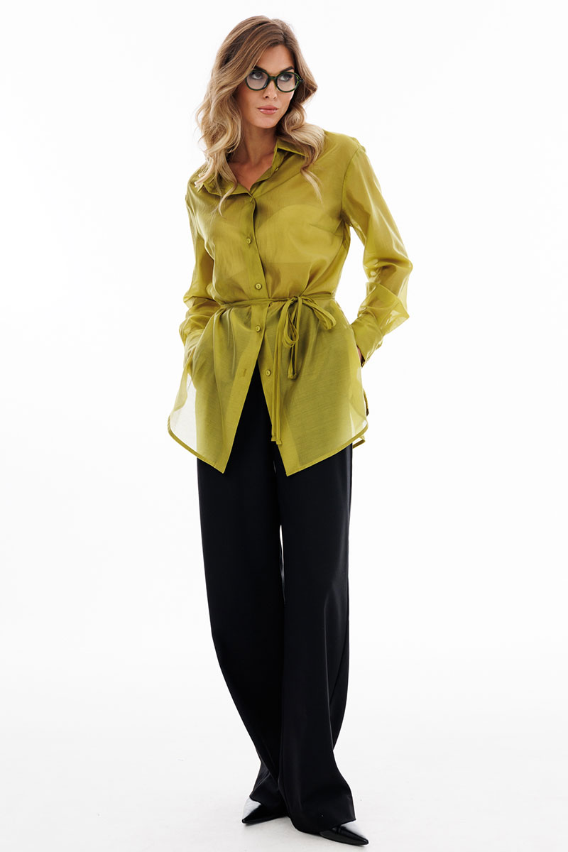 Блузка выполнена из плательно-блузочной ткани. Блузка прямого силуэта, длиной до линии бедер. Спереди центральная застежка на пуговицы. Воротник стояче-отложной. Плечевой шов удлинен. Рукав рубашечного кроя, одношовный с прорезью и двумя складками по низу. Рукав на притачной манжете. Низ блузки фигурной формы. В комплект входит пояс из основной ткани.