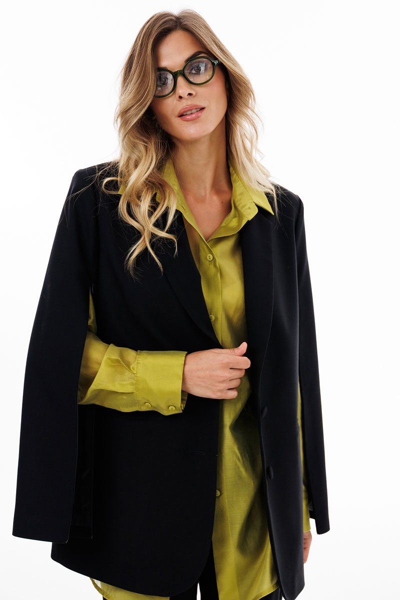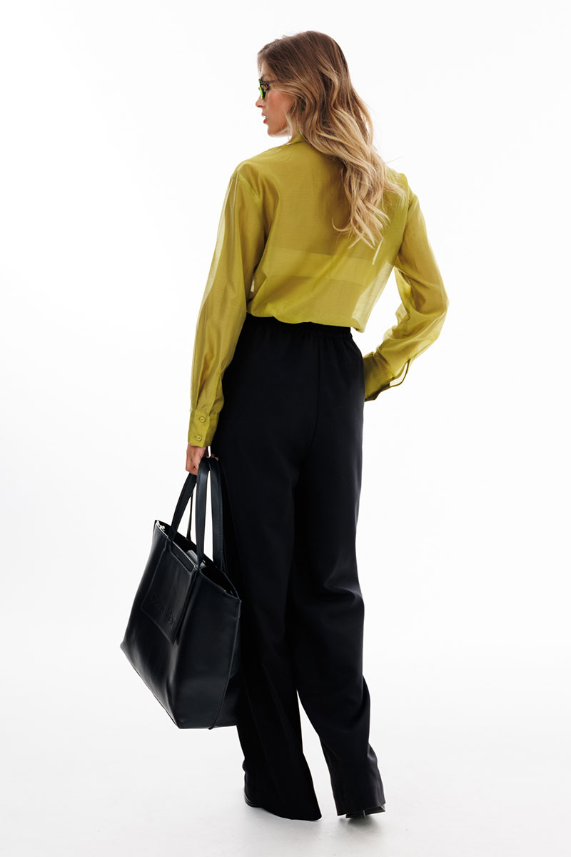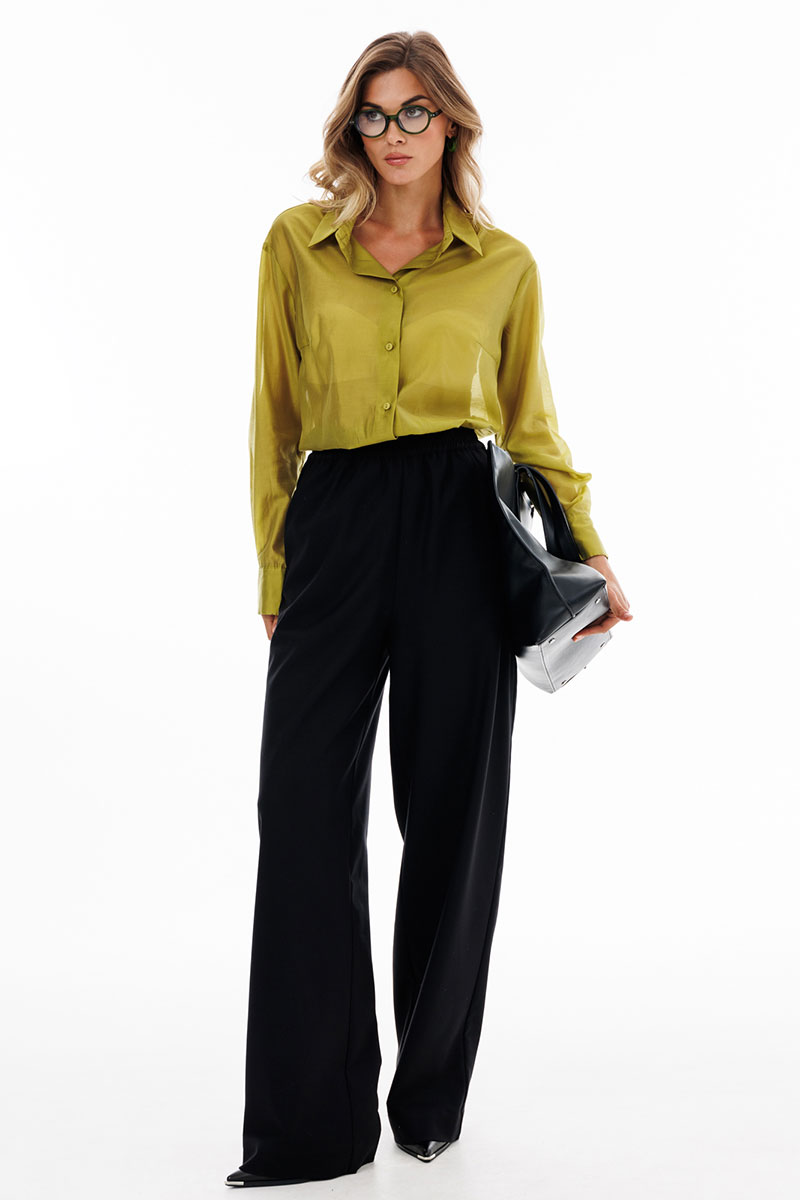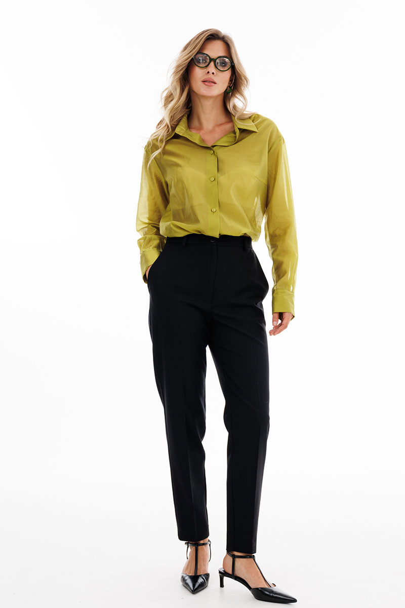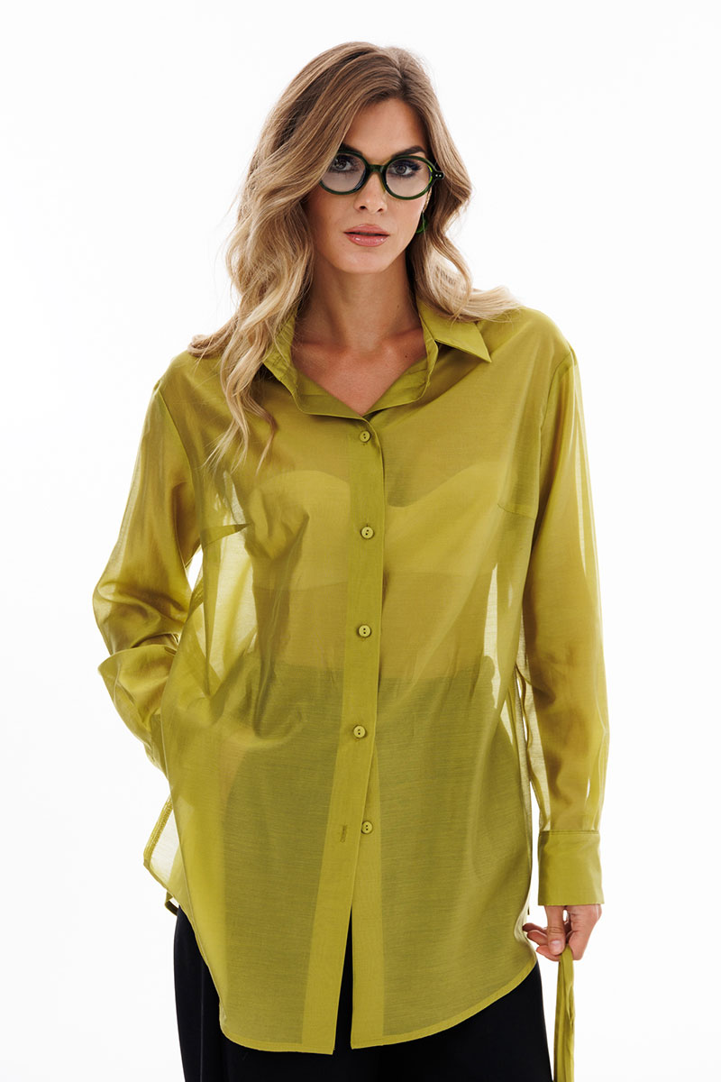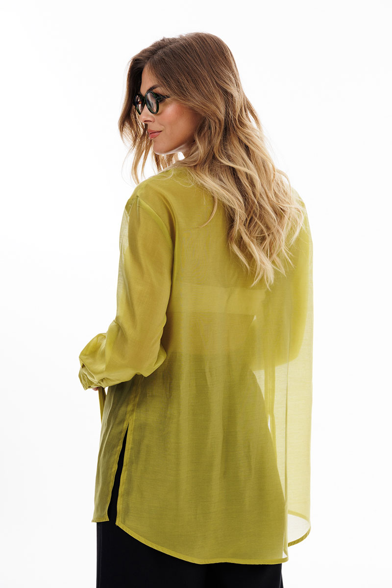 Блузка выполнена из плательно-блузочной ткани. Блузка прямого силуэта, длиной до линии бедер. Спереди центральная застежка на пуговицы. Воротник стояче-отложной. Плечевой шов удлинен. Рукав рубашечного кроя, одношовный с прорезью и двумя складками по низу. Рукав на притачной манжете. Низ блузки фигурной формы. В комплект входит пояс из основной ткани.