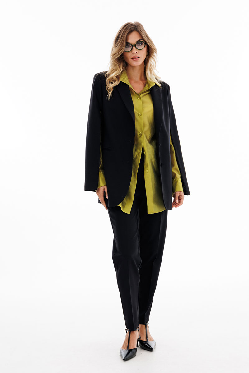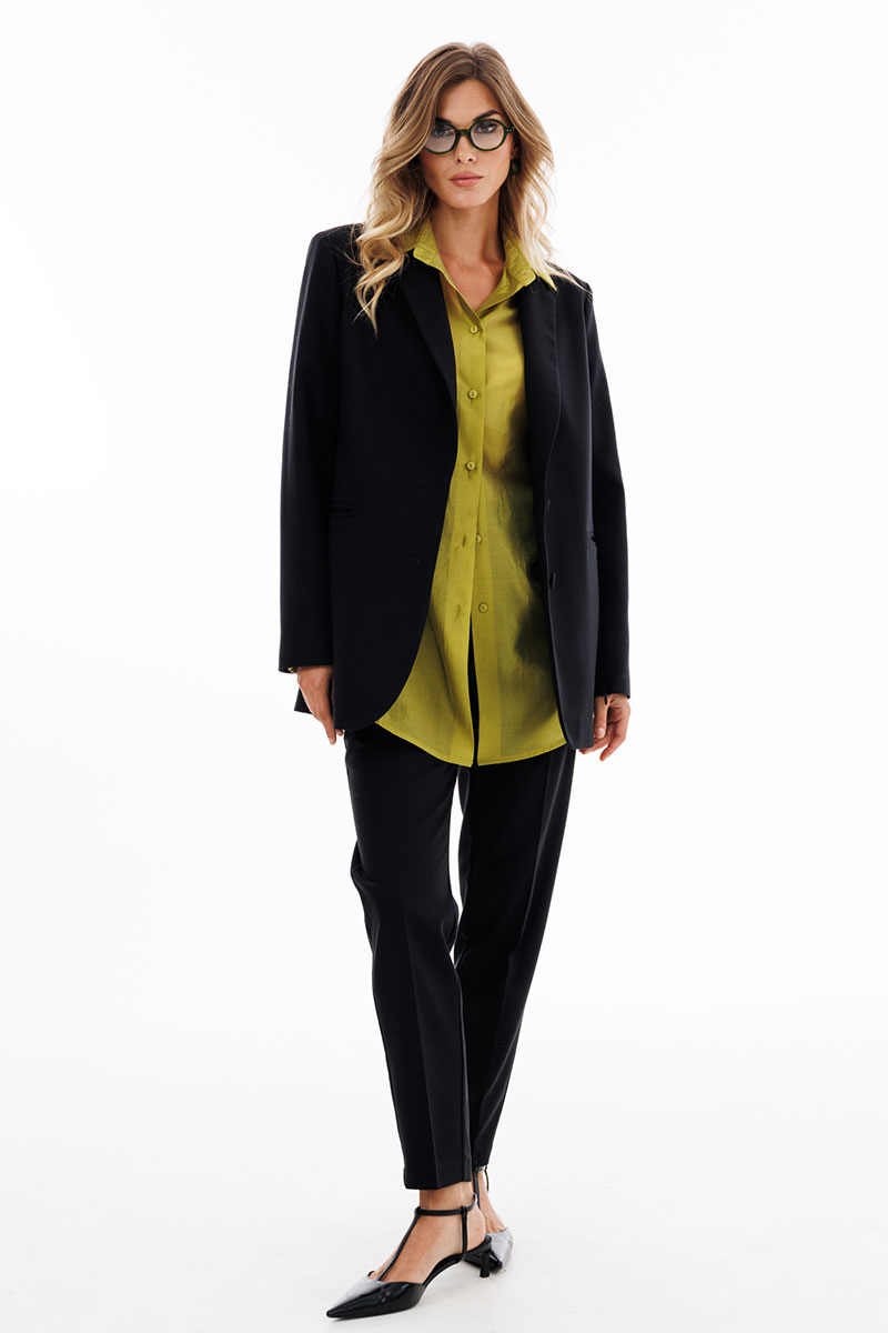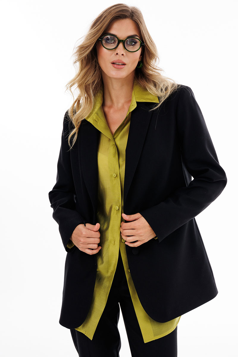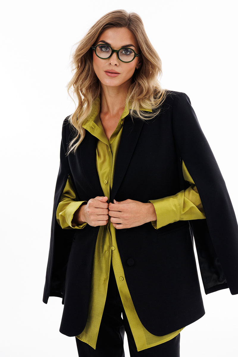 Жакет выполнен из костюмной ткани. Жакет прямого силуэта, длиной до линии бедер. Спереди застежка на пуговицы и прорезные карманы. Жакет по низу закругленной формы. На спинке средний шов. Воротник пиджачного типа. Рукав втачной, двухшовный, декорирован потайной молнией. Жакет на притачной по низу подкладке.