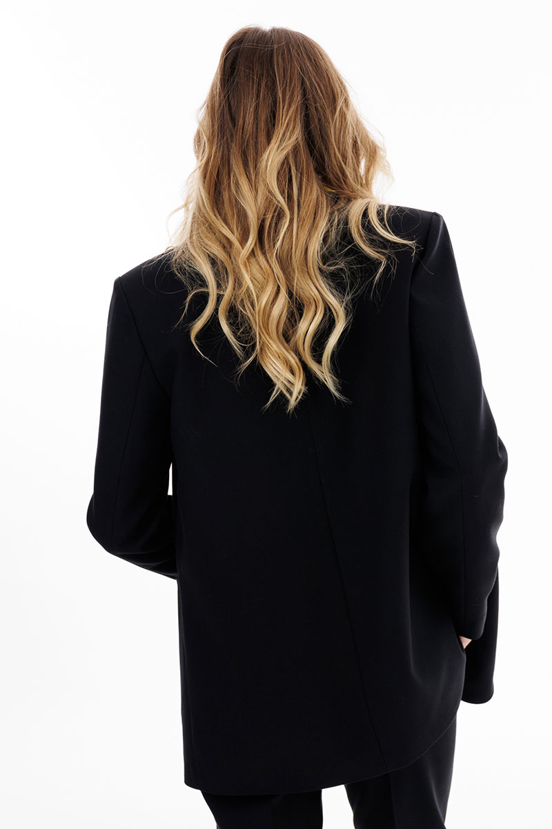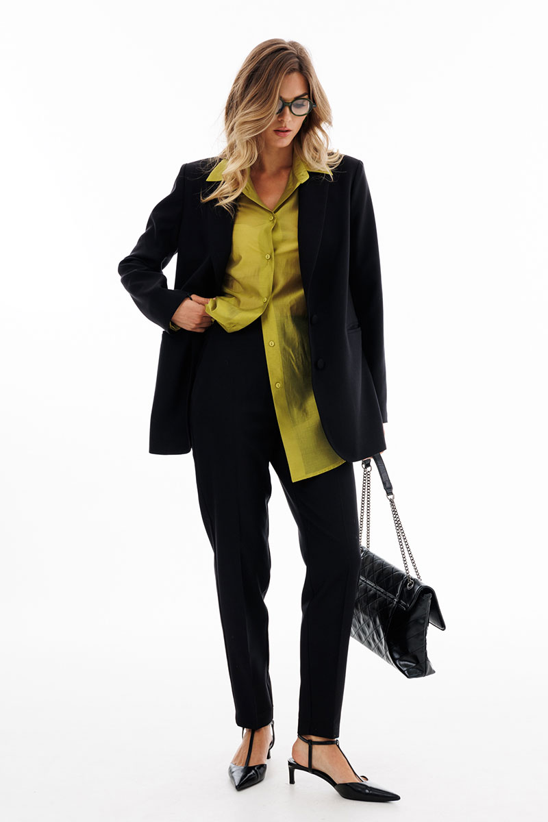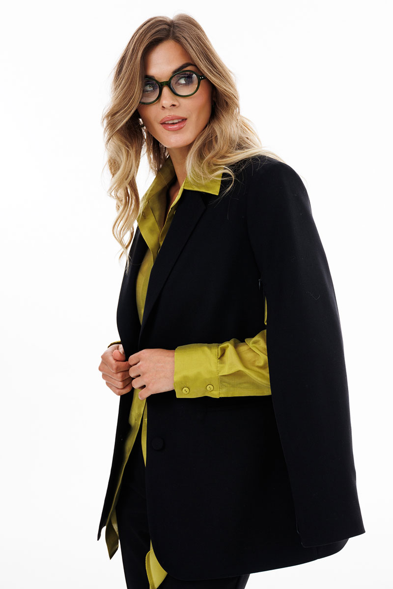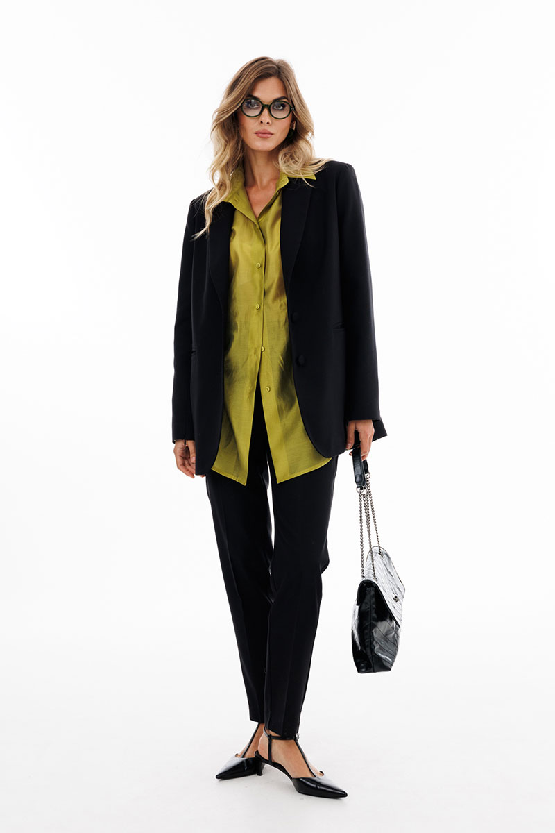 Жакет выполнен из костюмной ткани. Жакет прямого силуэта, длиной до линии бедер. Спереди застежка на пуговицы и прорезные карманы. Жакет по низу закругленной формы. На спинке средний шов. Воротник пиджачного типа. Рукав втачной, двухшовный, декорирован потайной молнией. Жакет на притачной по низу подкладке.