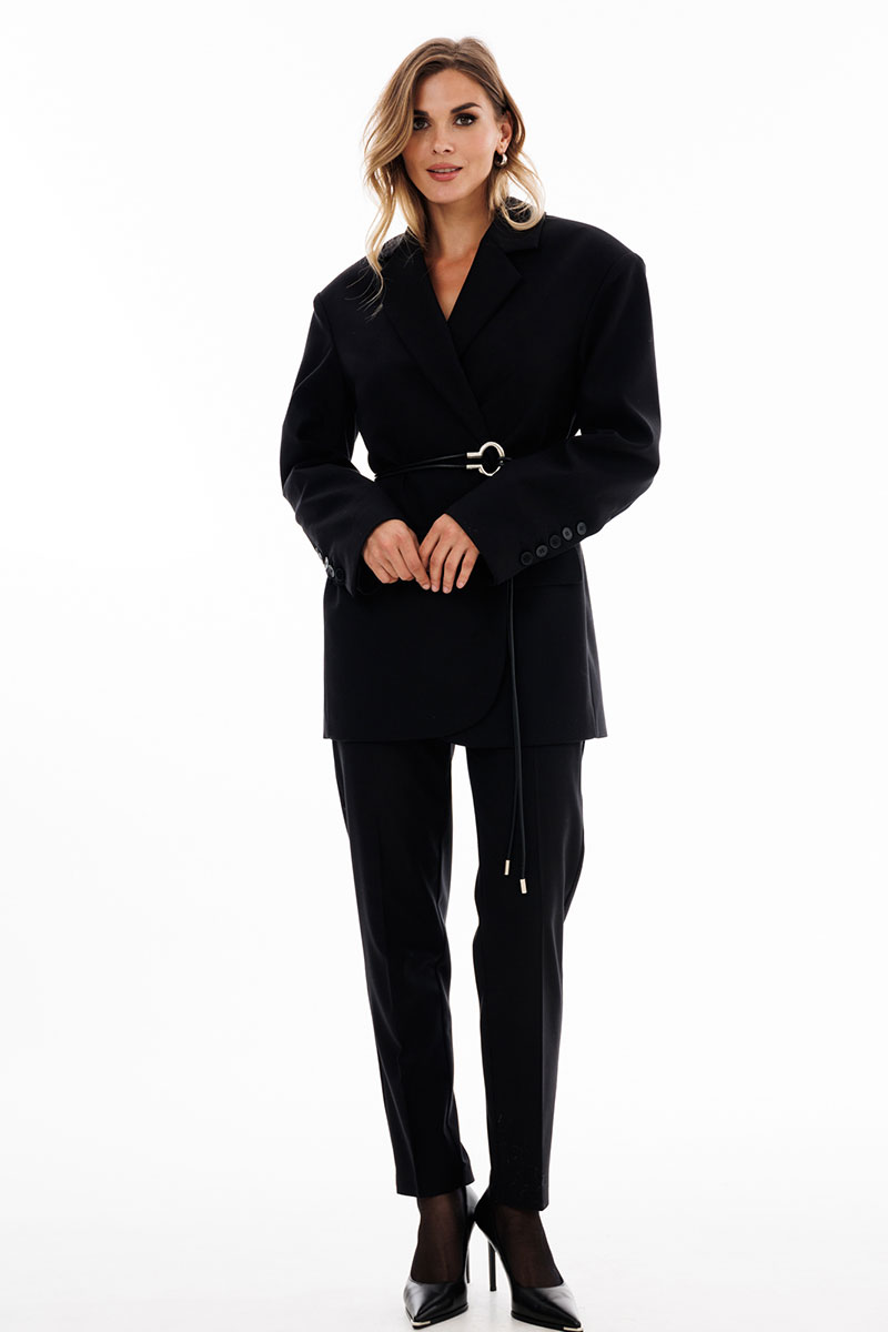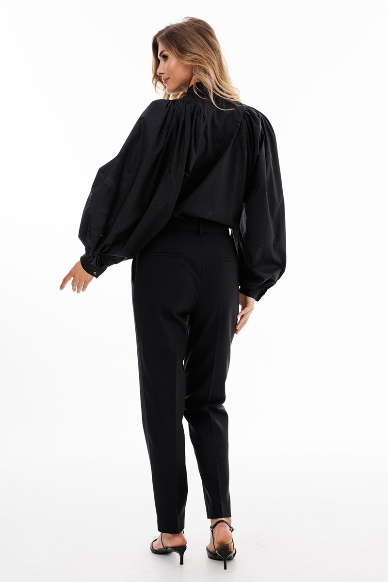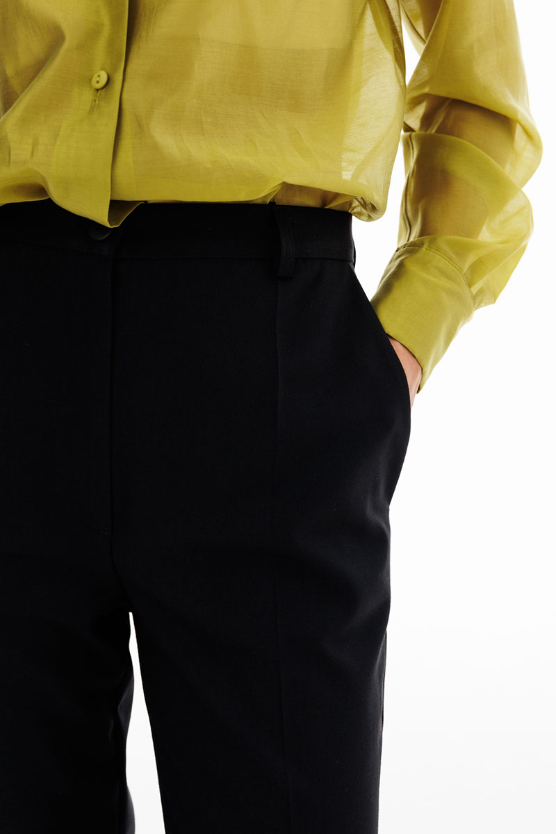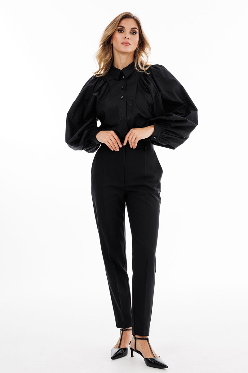 Брюки выполнены из костюмной ткани. Брюки зауженные к низу, длиной 7/8, на притачном поясе. Спереди боковые карманы с наклонным входом и застежка на молнию. Сзади декоративные карманы с листочкой.