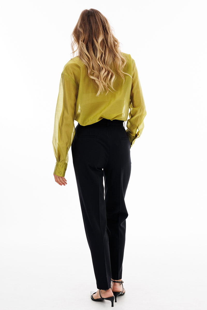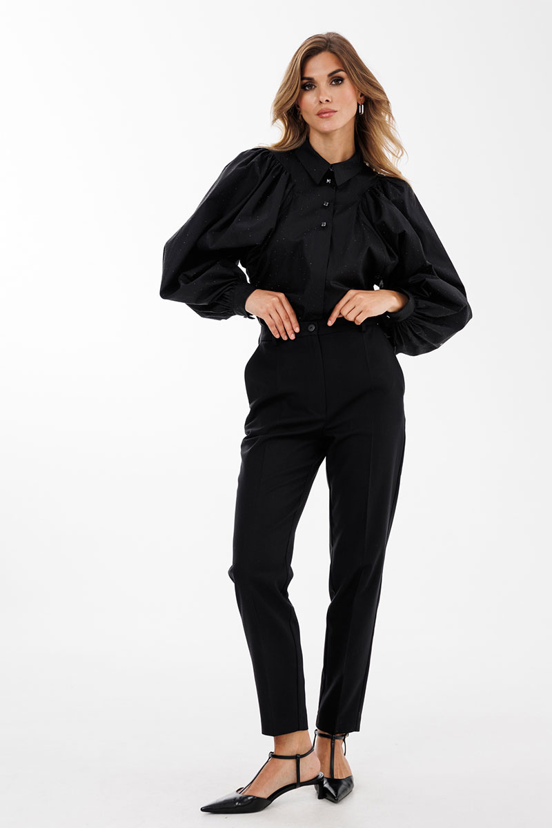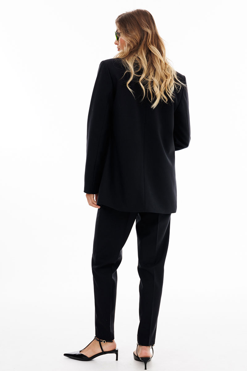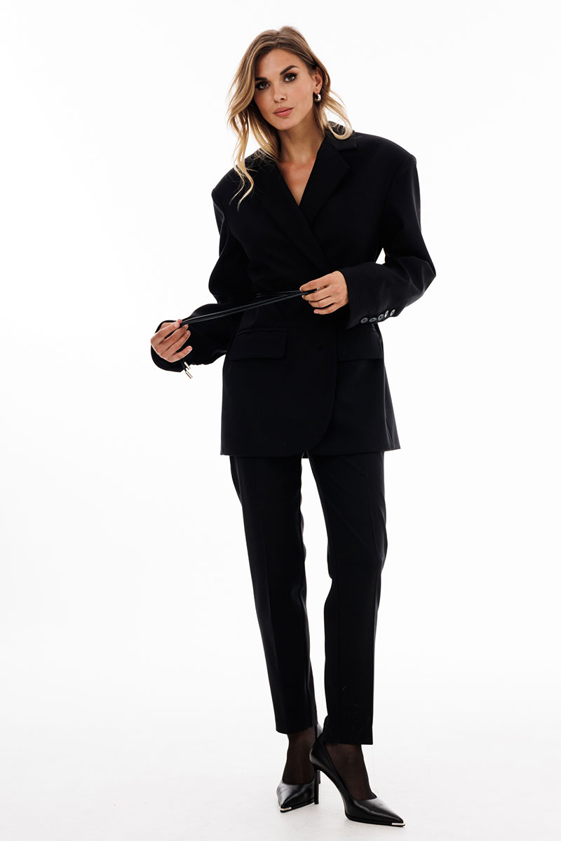 Брюки выполнены из костюмной ткани. Брюки зауженные к низу, длиной 7/8, на притачном поясе. Спереди боковые карманы с наклонным входом и застежка на молнию. Сзади декоративные карманы с листочкой.