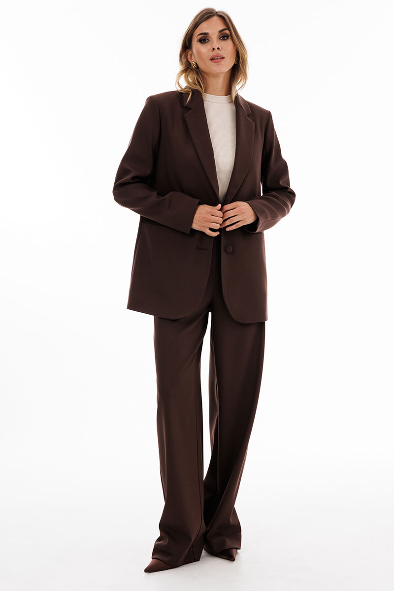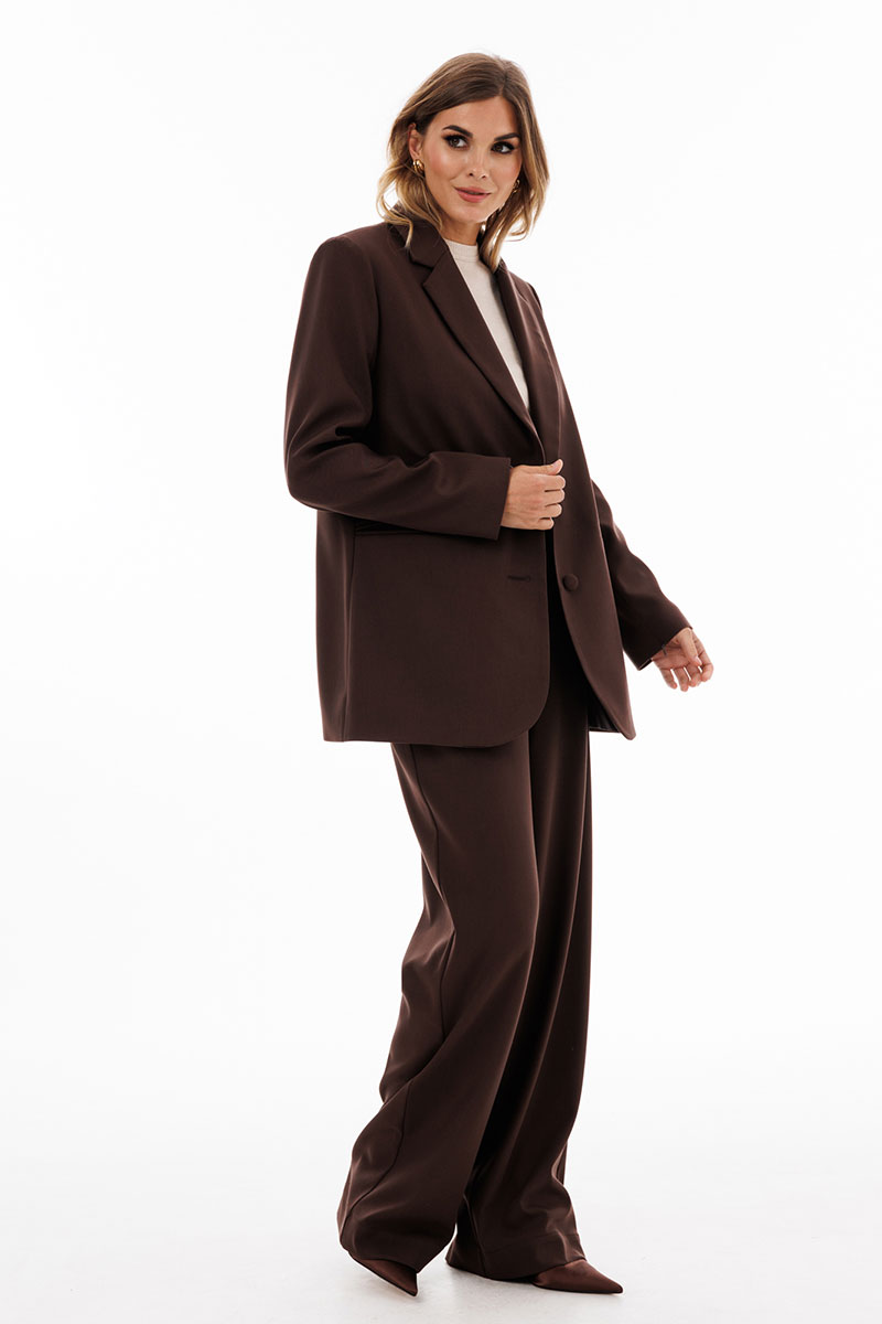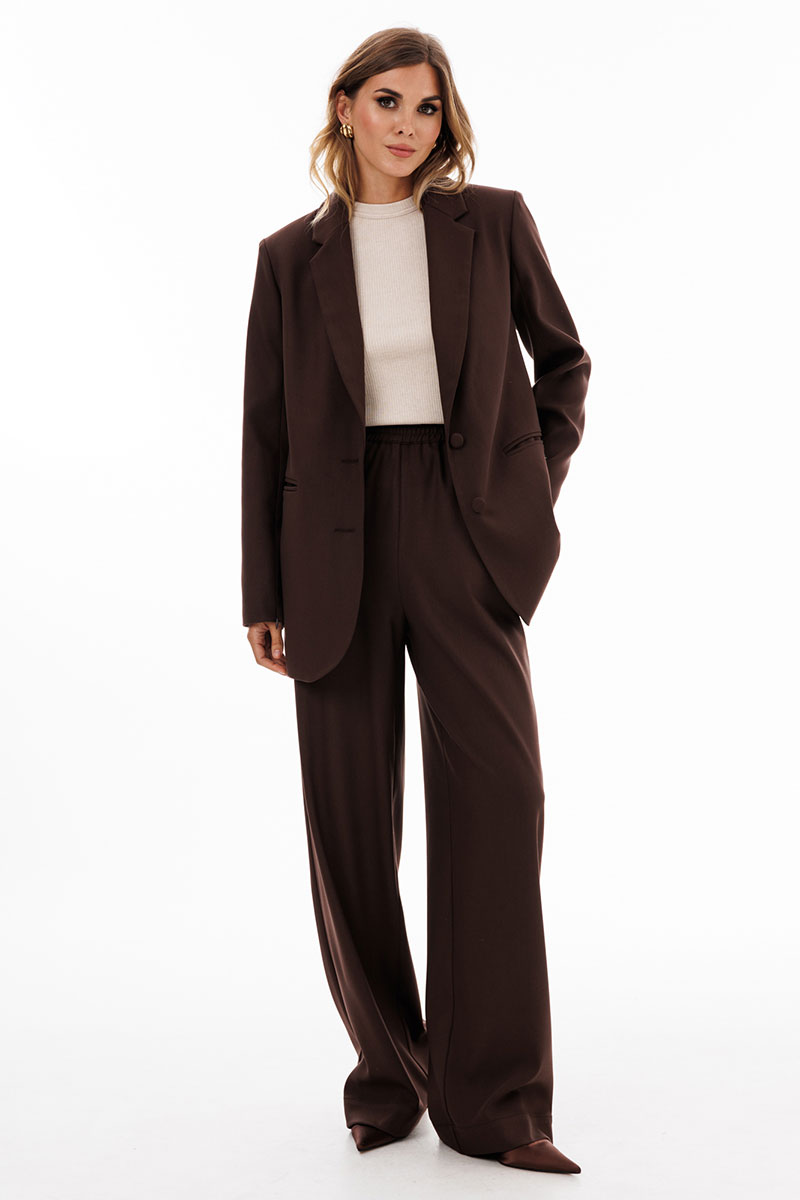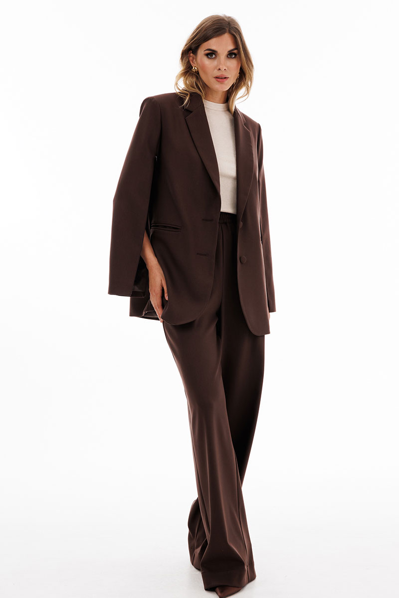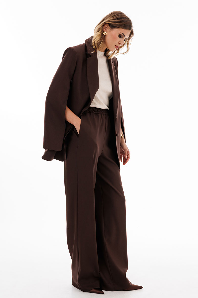 Брюки выполнены из костюмной ткани. Брюки прямого покроя длиной в пол, на притачном поясе с эластичной тесьмой. Спереди боковые карманы с наклонным входом.