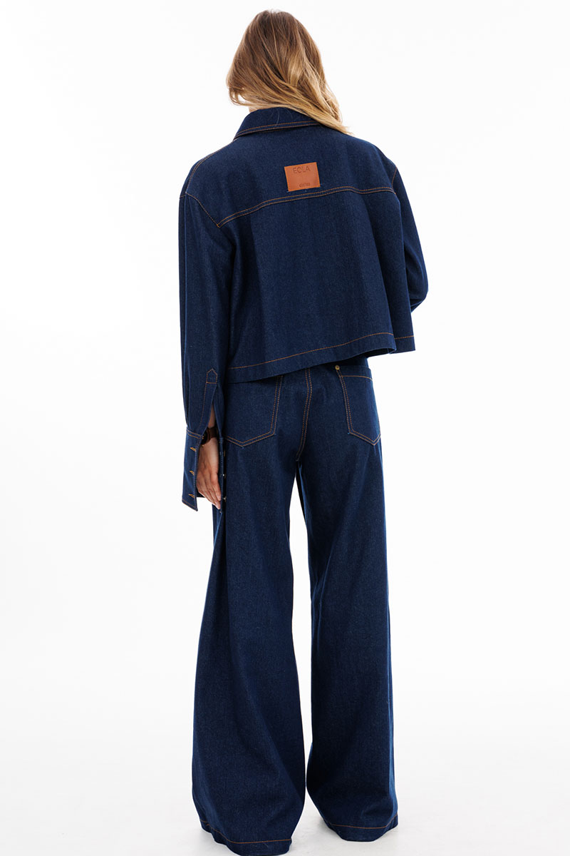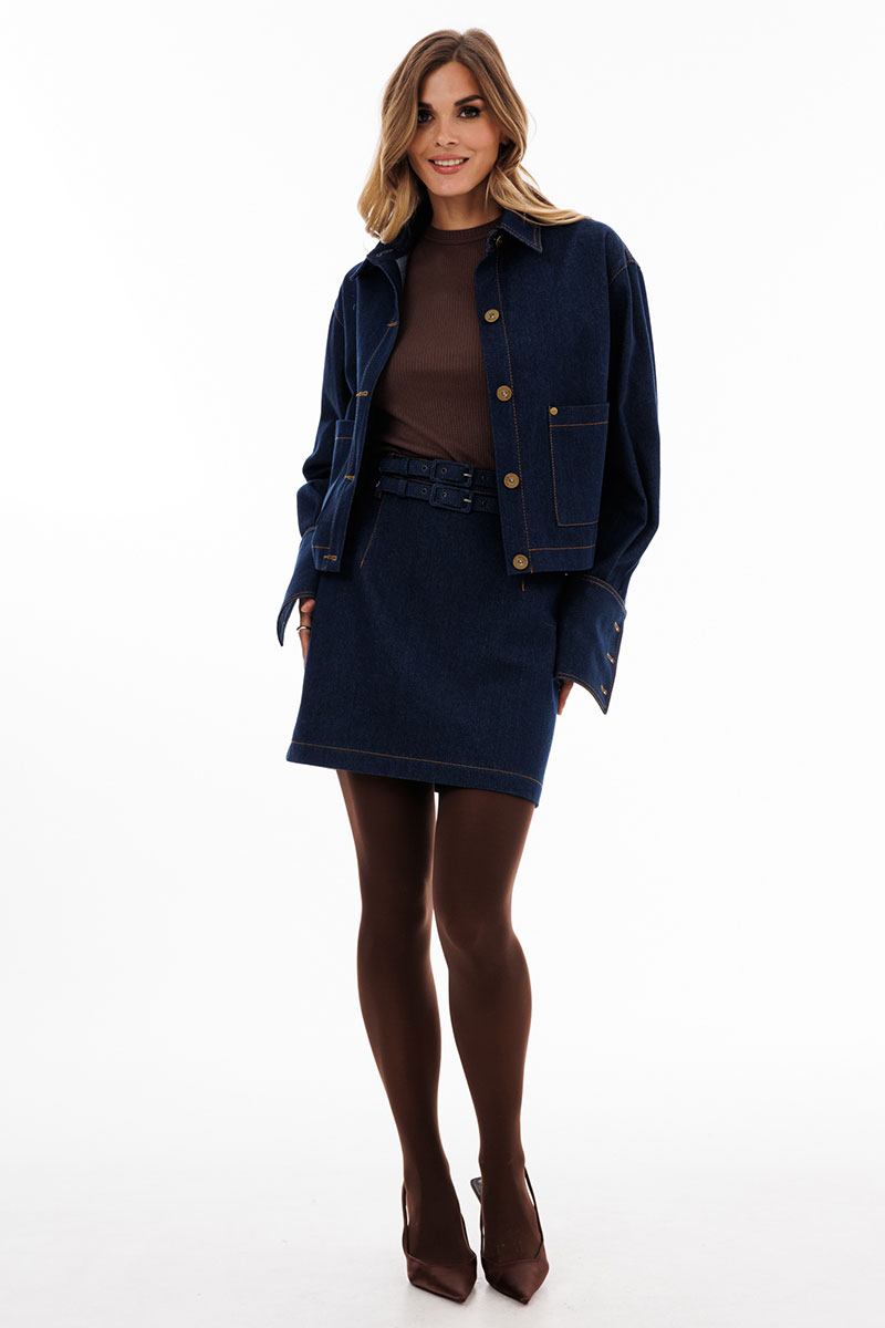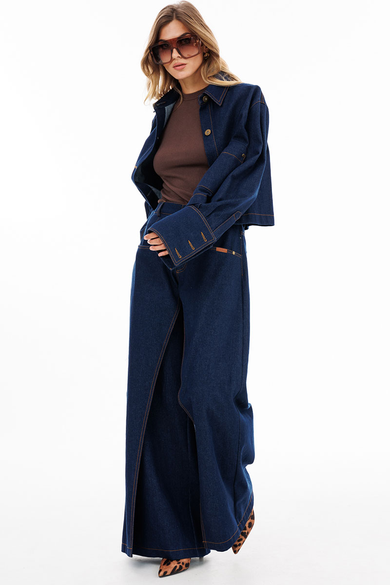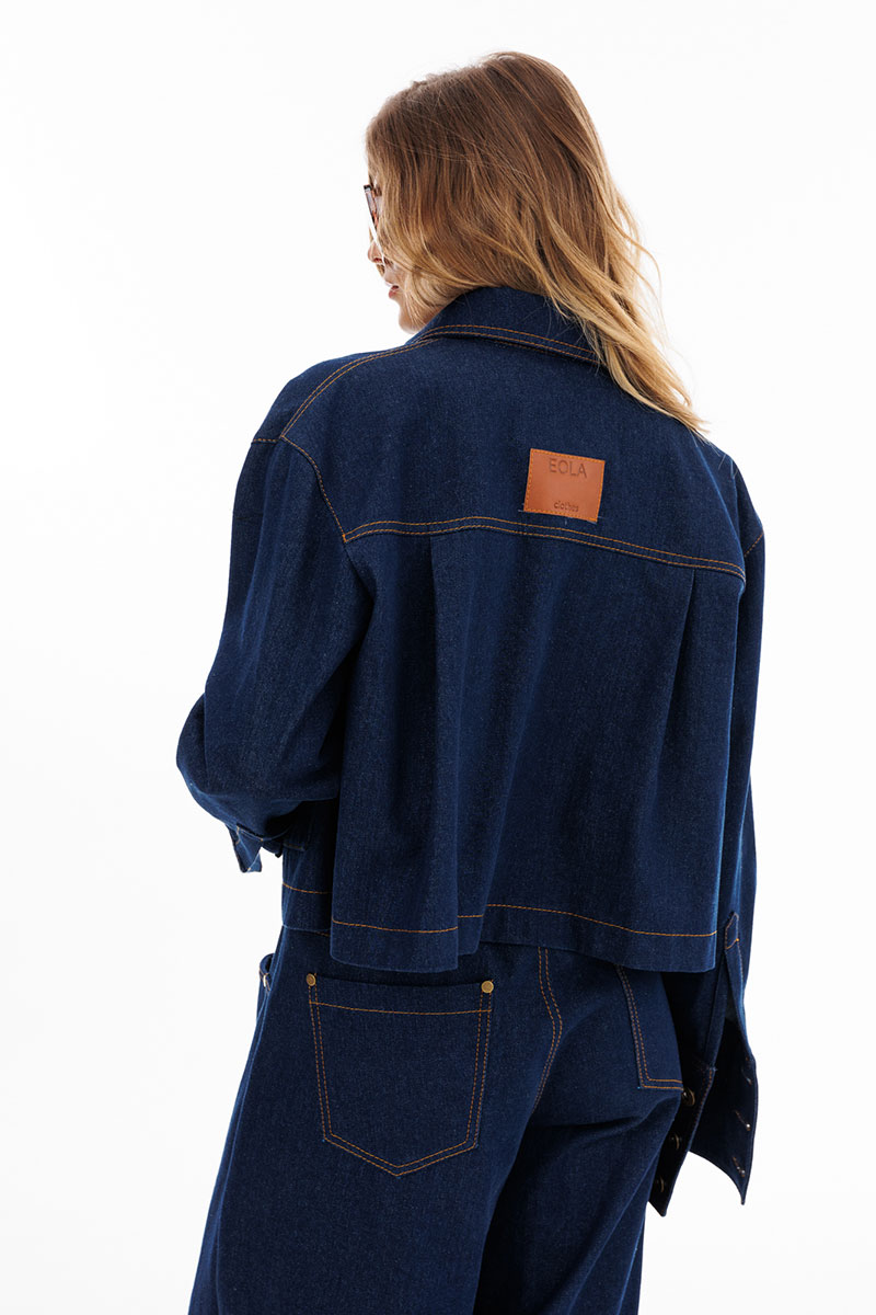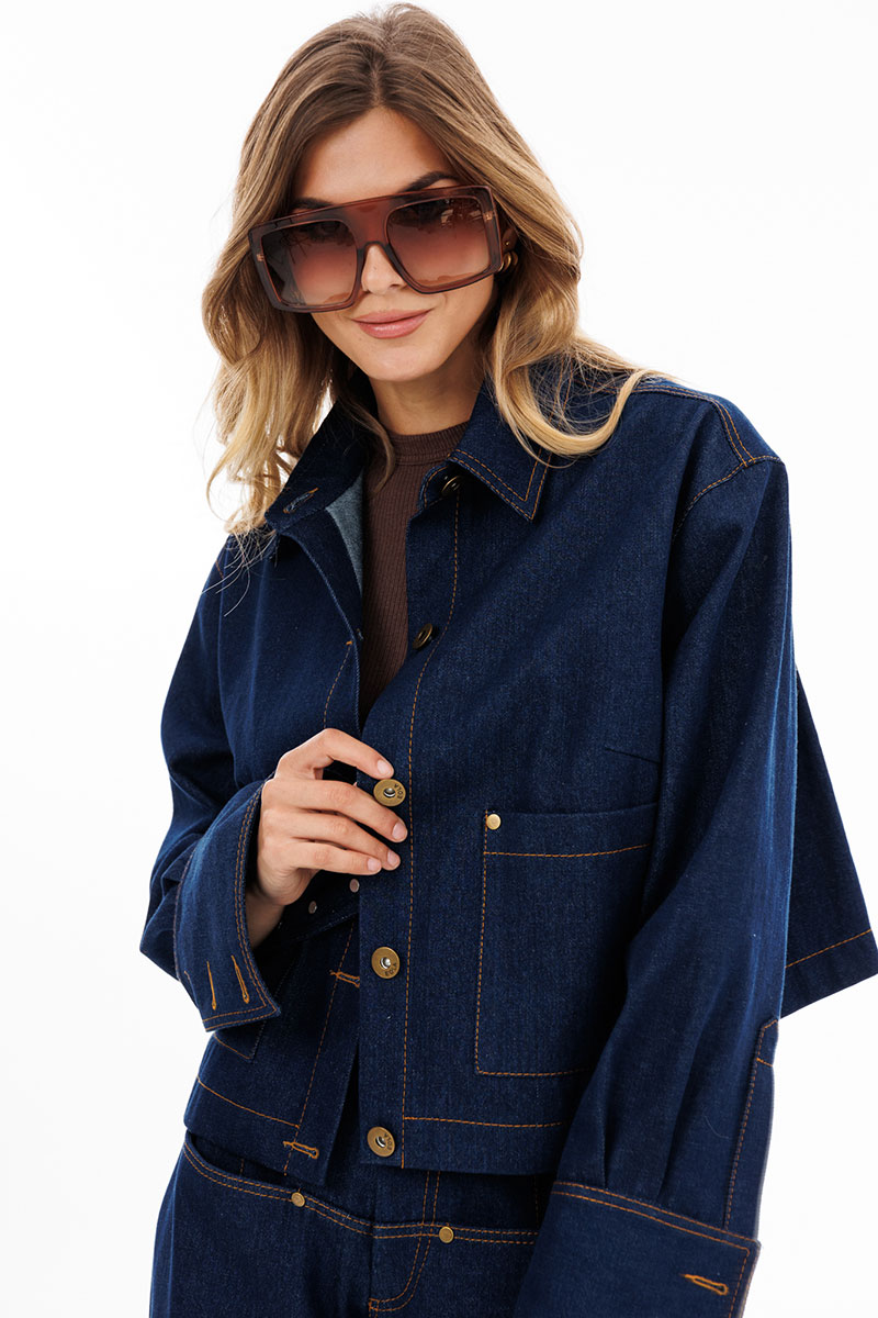 Блузка выполнена из плотного джинса. Блузка прямого силуэта, длиной ниже линии талии. Спереди накладные карманы и центральная застежка с планкой на пробивные пуговицы. На спинке кокетка и две складки. Воротник стояче-отложной с отрезной стойкой. Плечевой шов удлинен. Рукав рубашечного покроя, одношовный. Низ рукава на притачной манжете с застежкой на пробивные пуговицы. Рукав удлинен. Блузка декорирована по кокетке спинки нашивкой из натуральной кожи.