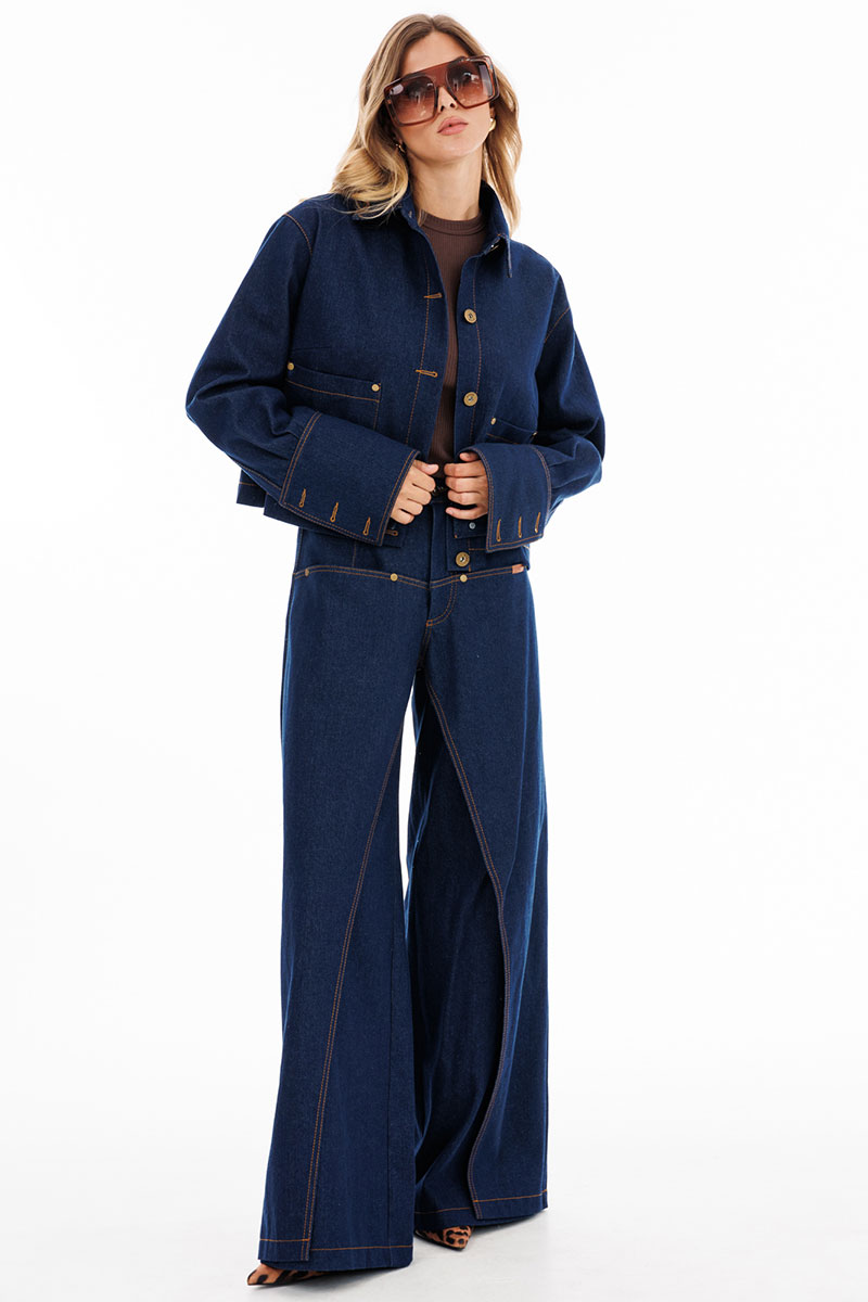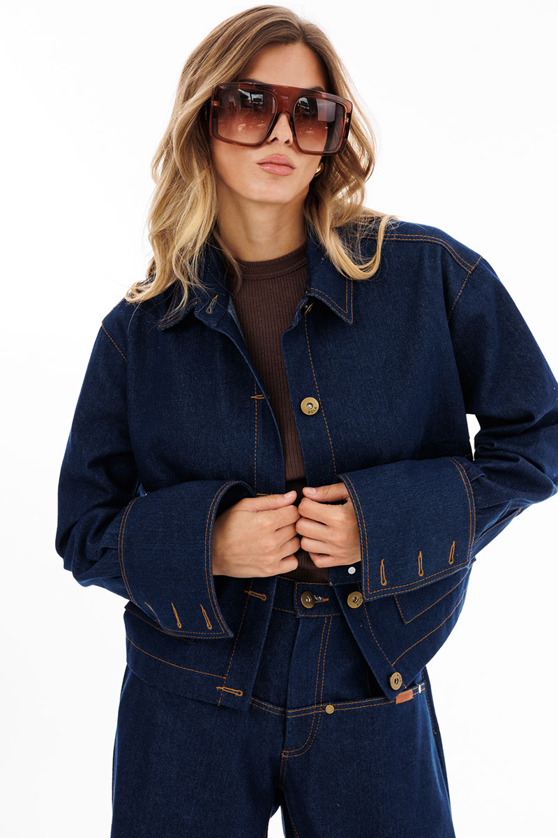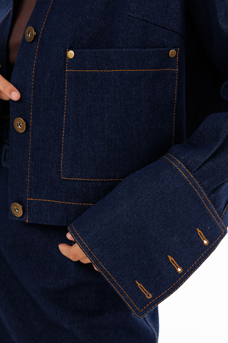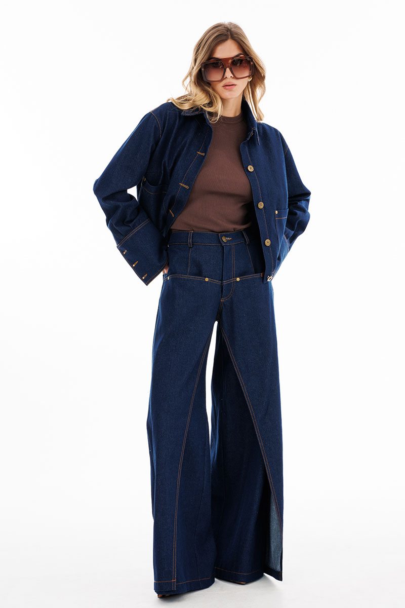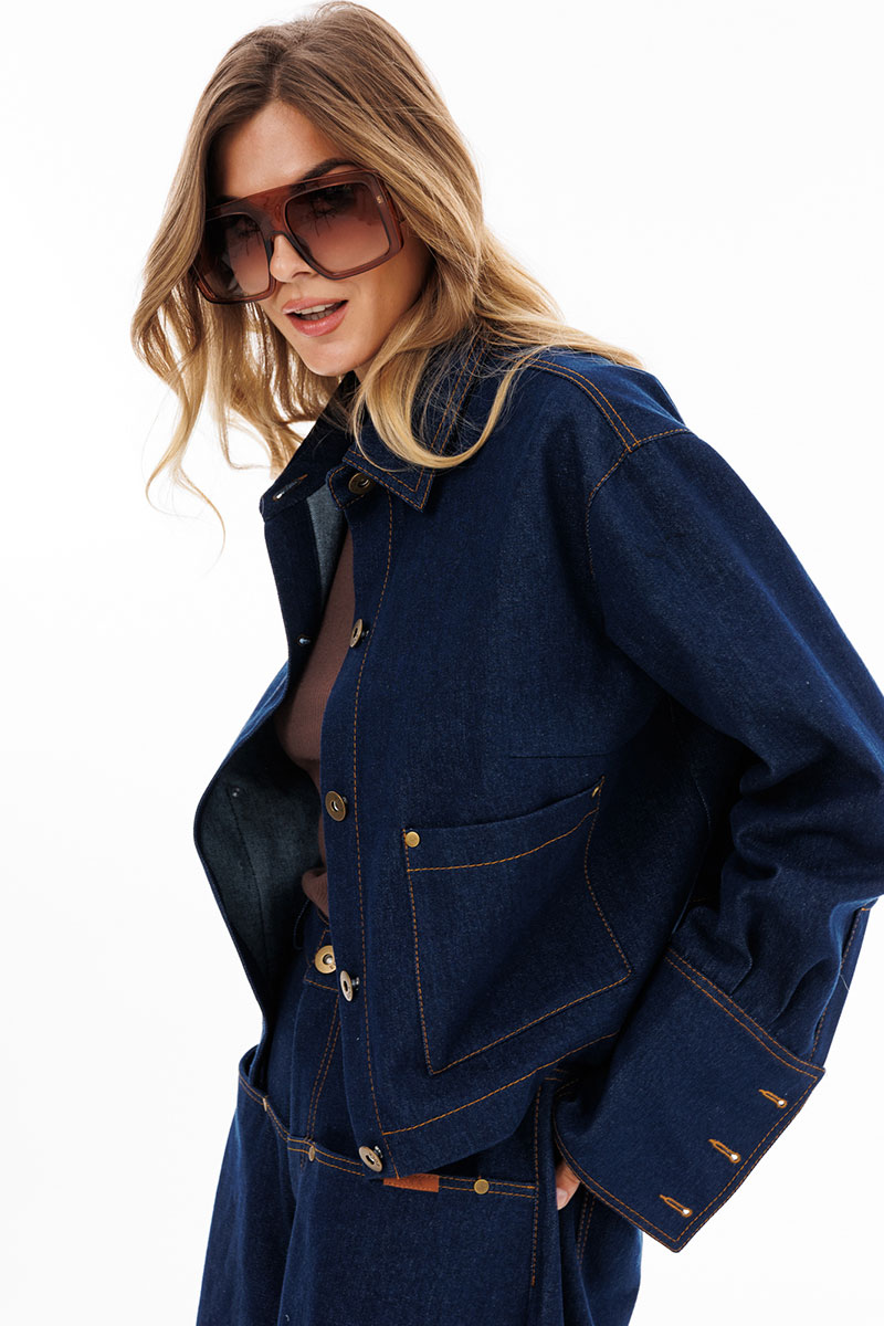 Блузка выполнена из плотного джинса. Блузка прямого силуэта, длиной ниже линии талии. Спереди накладные карманы и центральная застежка с планкой на пробивные пуговицы. На спинке кокетка и две складки. Воротник стояче-отложной с отрезной стойкой. Плечевой шов удлинен. Рукав рубашечного покроя, одношовный. Низ рукава на притачной манжете с застежкой на пробивные пуговицы. Рукав удлинен. Блузка декорирована по кокетке спинки нашивкой из натуральной кожи.