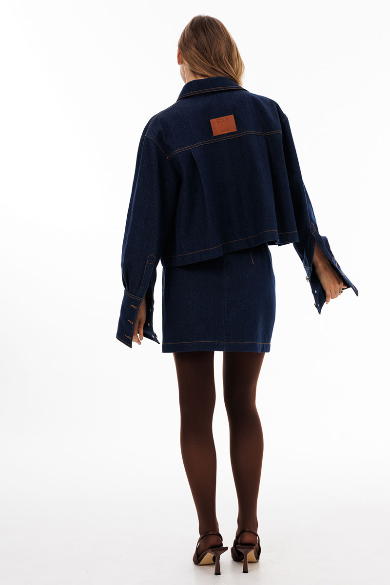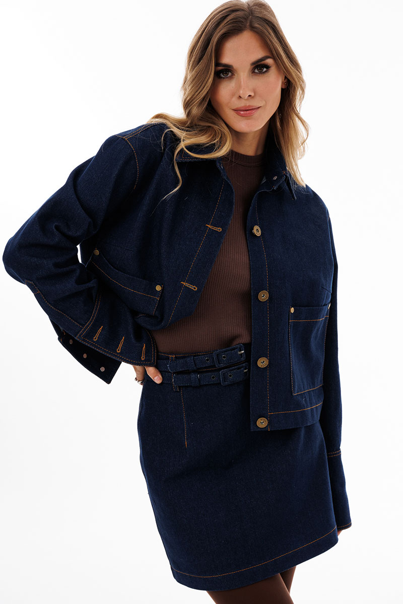 Юбка выполнена из плотного джинса. Юбка прямого силуэта, длиной выше линии колена. Переднее полотнище цельное. Сзади в среднем шве застежка на потайную молнию. Юбка декорирована двумя ремнями из основной ткани.