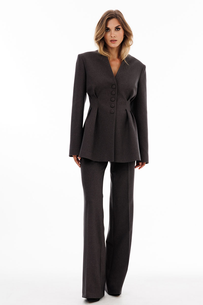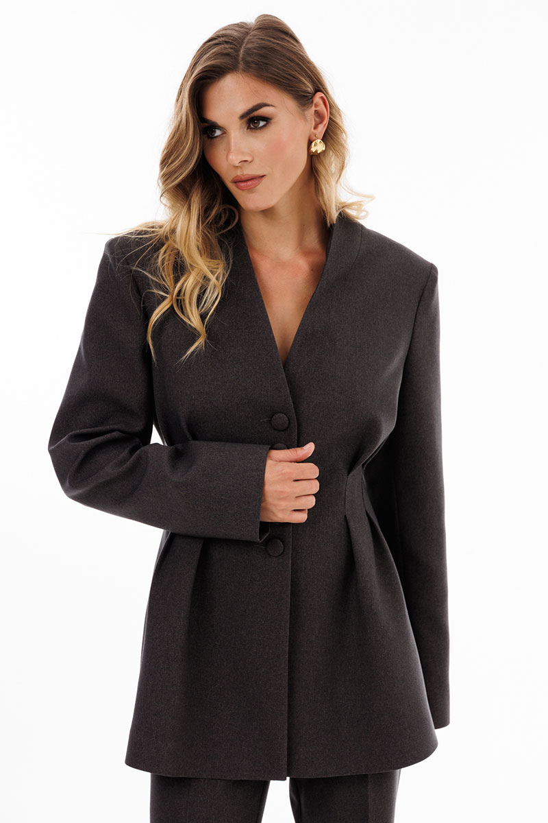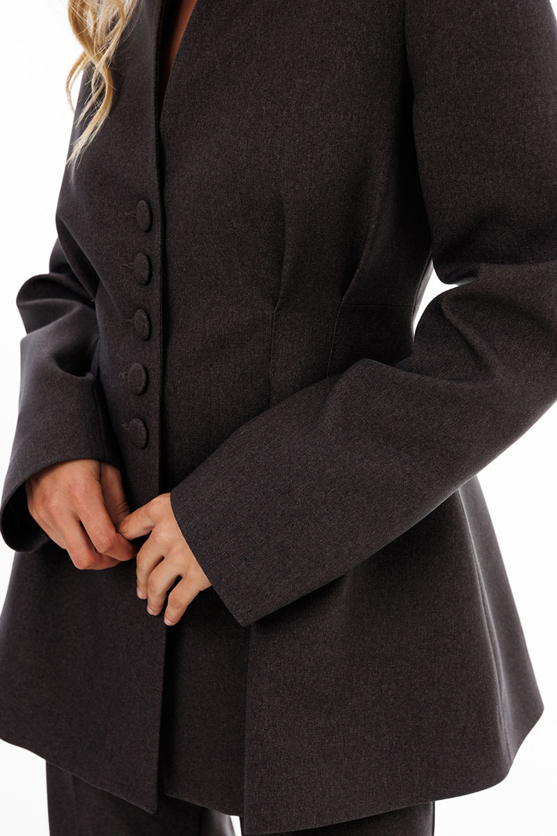 Жакет выполнен из костюмной ткани. Жакет Х-образного силуэта, длиной ниже линии бедер. Спереди центральная бортовая открытая застежка на пуговицы и вытачка для прилегания воротника. На спинке средний шов, две складки и вытачка для прилегания воротника. Вортник - цельнокроеная стойка. Плечевой шов удлинен. Рукав втачной двухшовный. Жакет на притачной по низу подкладке.