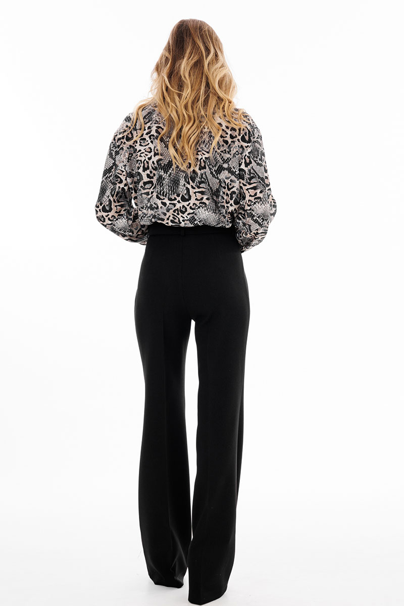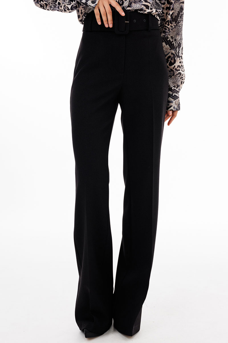 Брюки выполнены из костюмной ткани. Брюки покроя "клеш", на притачном поясе, длиной в пол. Спереди застежка на молнию с гульфиком, потайную пуговицу и два брючных крючка. Передние и задние части брюк заутюжены на кант. В комплект входит съемный пояс из основной ткани.