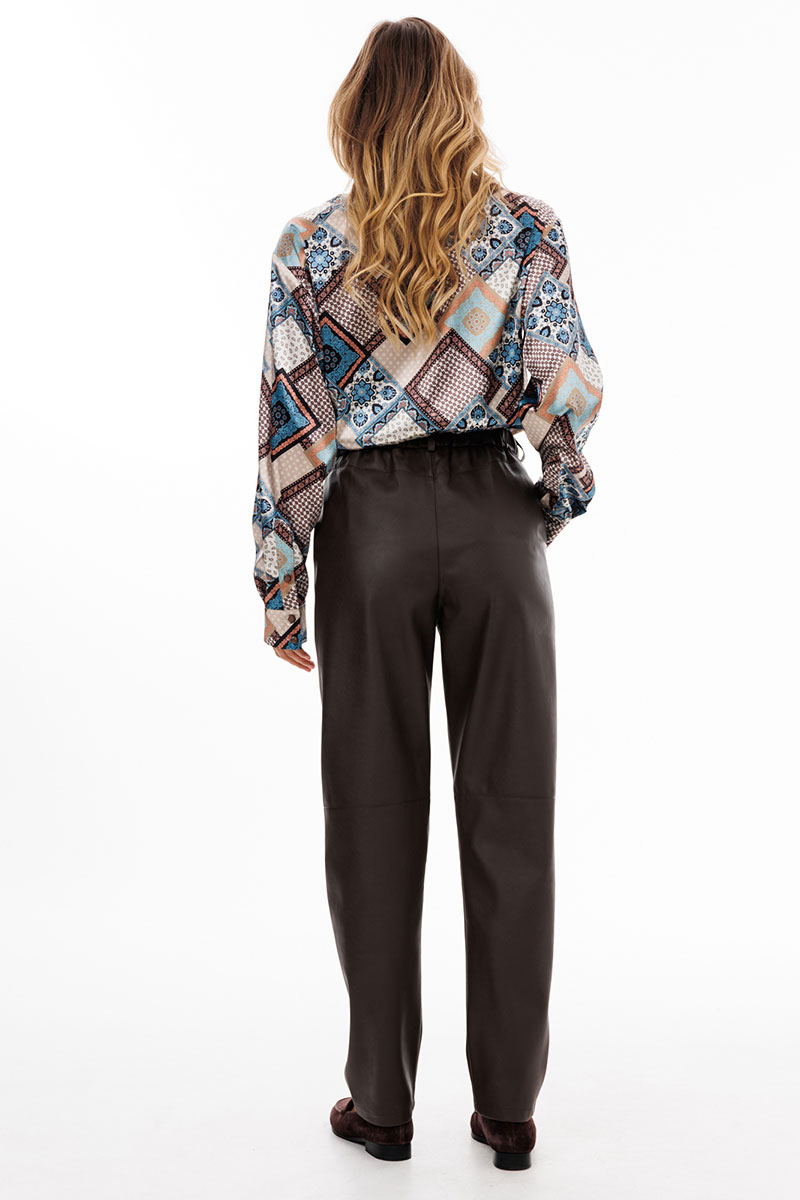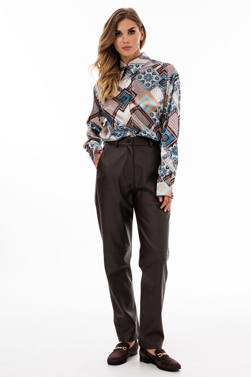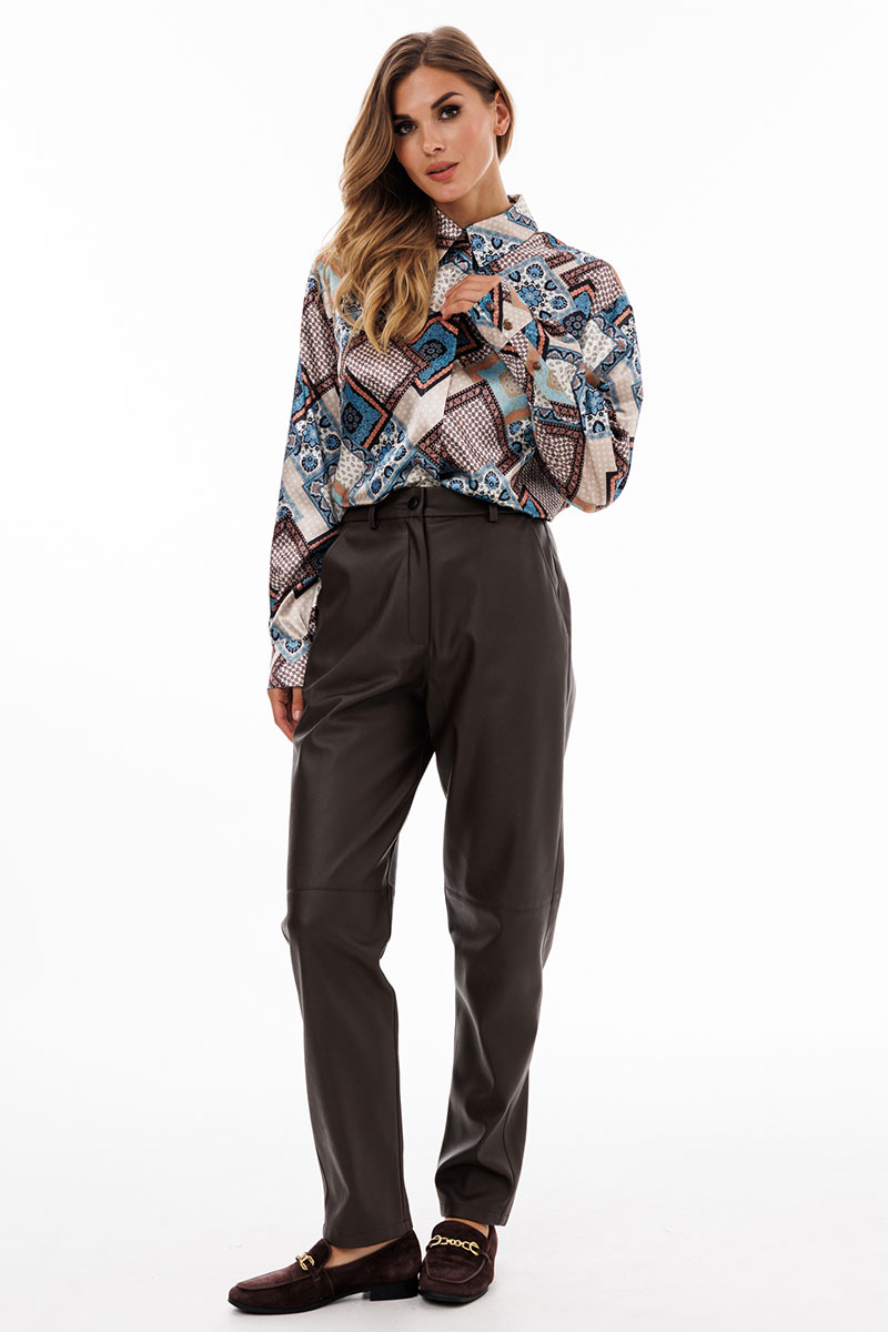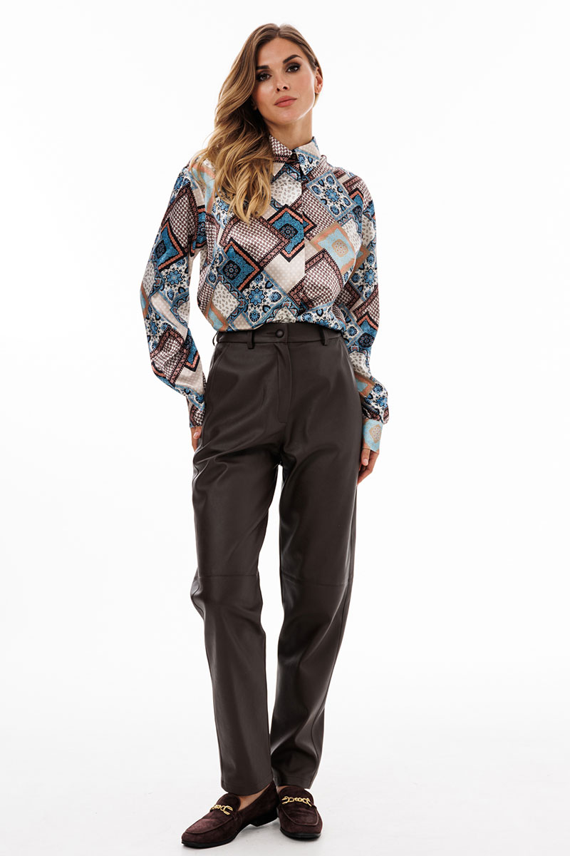 Блузка выполнена из тонкого атласа с принтом. Спереди центральная застежка на потайную планку с пуговицами. Спинка цельная. Воротник стояче-отложной. Плечевой шов удлинен. Рукав рубашечный одношовный. Низ рукава на притачной манжете.