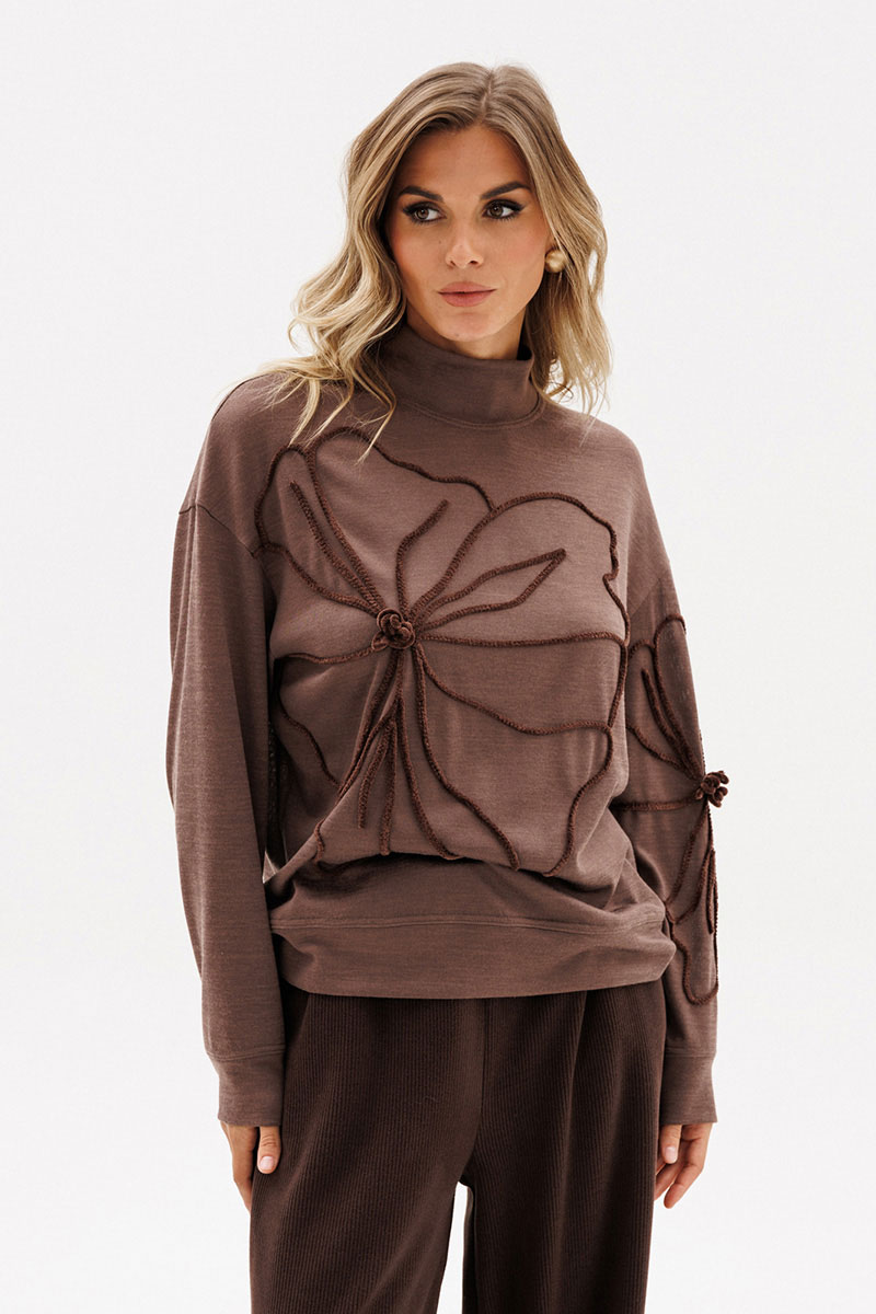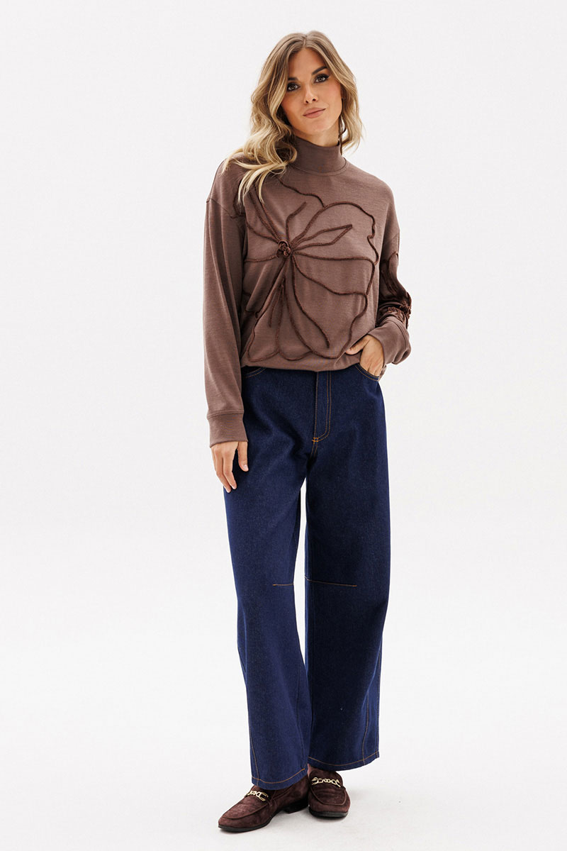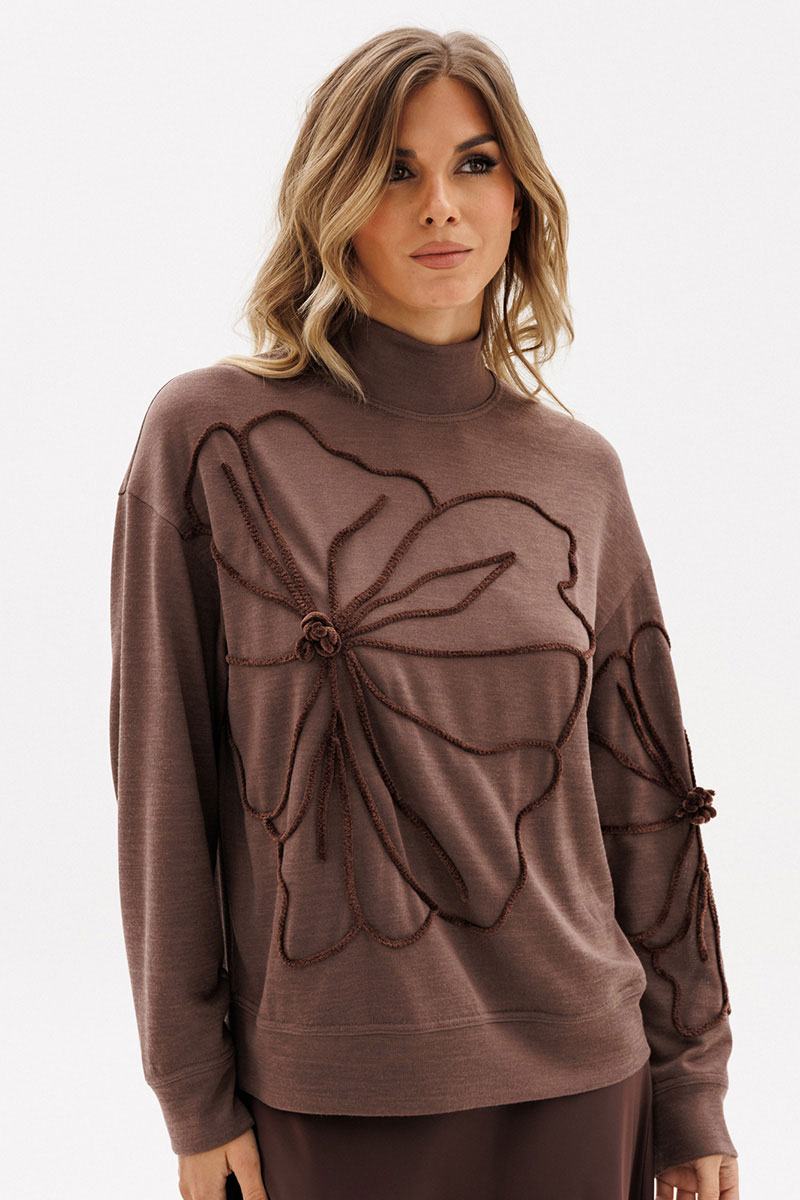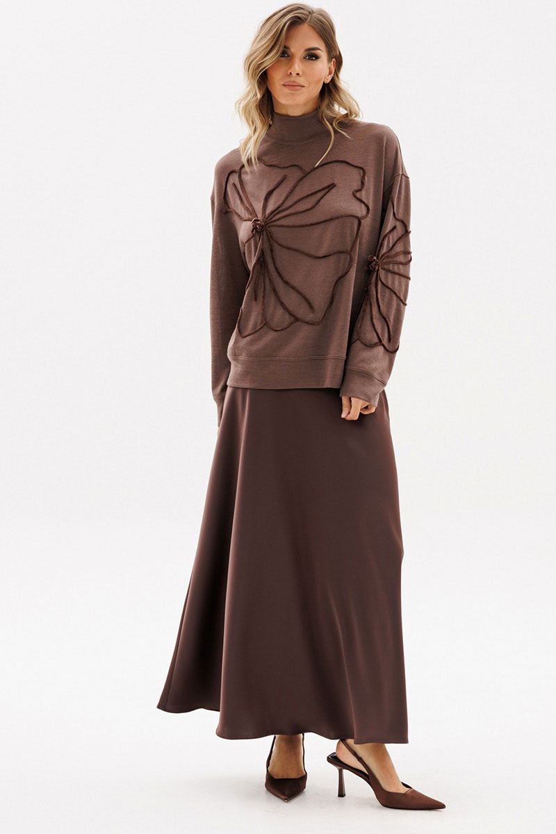 Джемпер выполнен из трикотажного полотна. Джемпер О-образного силуэта, длиной до линии бедер. Перед и спинка цельные. Горловина округлой формы с воротником-стойкой. Плечевой шов удлинен. Рукав рубашечного покроя, одношовный. Низ рукава на притачной манжете из основной ткани. Джемпер декорирован вышивкойпо переду и левому рукаву.